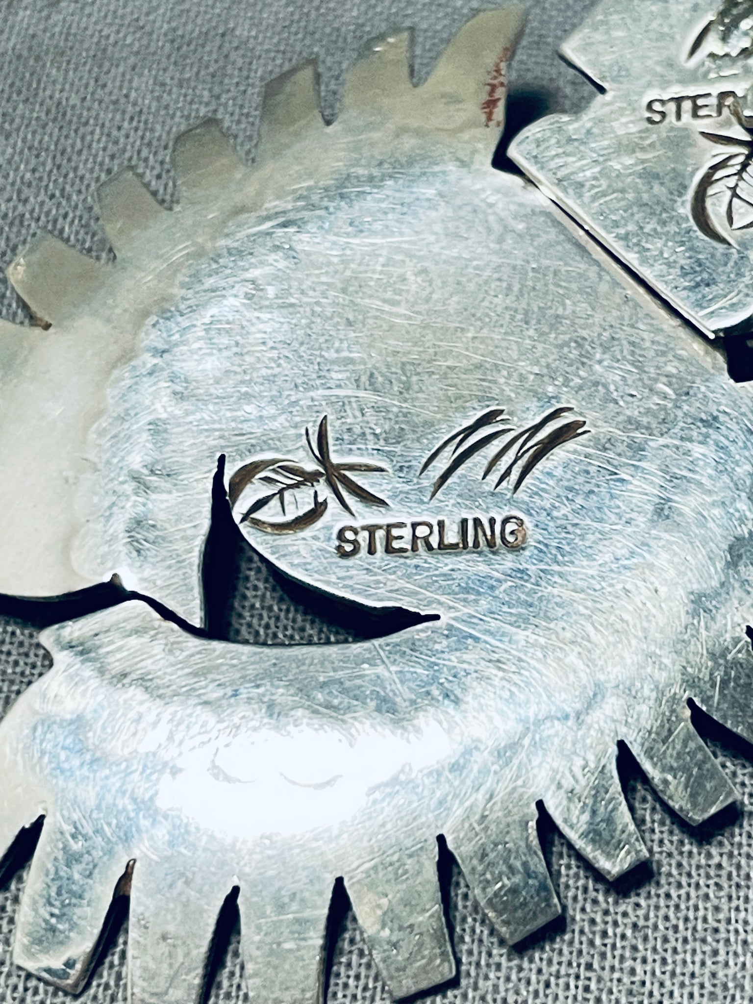 Nelson Morton is a skilled Navajo jewelry artist recognized for his exceptional craftsmanship and dedication to traditional Native American jewelry-making techniques. His work often features intricate silver designs, such as stamp work, overlay, and repoussé, reflecting the rich cultural heritage of the Navajo people. Morton's jewelry incorporates high-quality gemstones, including turquoise, coral, and onyx, which he selects for their vibrant colors and symbolic significance. He is known for blending traditional motifs with contemporary influences, creating pieces that appeal to both collectors and those seeking timeless, wearable art. Nelson Morton's creations are celebrated for their attention to detail, cultural authenticity, and artistic integrity, making him a respected figure in the world of Native American jewelry. The center stone measures around 1/2" x 3/8". Sterling silver, marked. Signed by Navajo artist, Nelson Morton. The pendant measures around 2-3/8" x 1-3/8". Sturdy 18 grams.