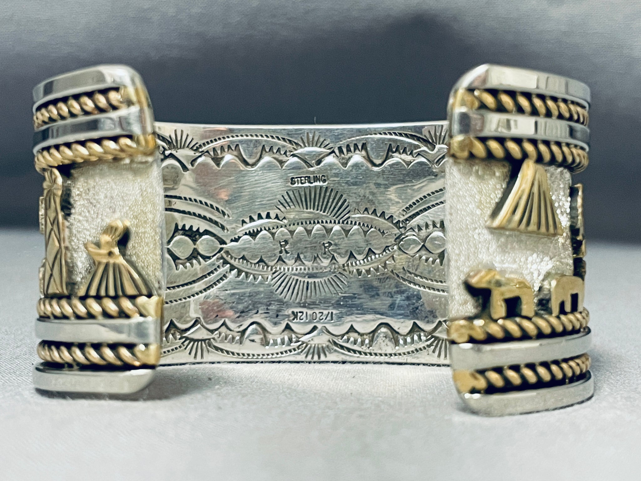 Up for sale is this fabulous Navajo silver and 12k gold bracelet. Talk about a work of art! From absolutely any angle - from end to end, this wide two-tone (sterling silver and 12k gold) storyteller cuff truly tells the story of life on the prairie - with the gold figures, animals, hogan with smoke, foliage and mountain ranges, etc. all resting upon the textured silver backdrop! The alternating gold rope and silver bar borders above and below add a spectacular touch! The artist even handstamped designs in the inside! Such an incredible piece! The width of the bracelet measures around 1-3/8". Signed by Navajo artist, Roger Nelson. Sterling silver and 12K gold, both marked. The inside end to end measures around 6" with an additional 1-1/4" gap. Sturdy 100 grams.