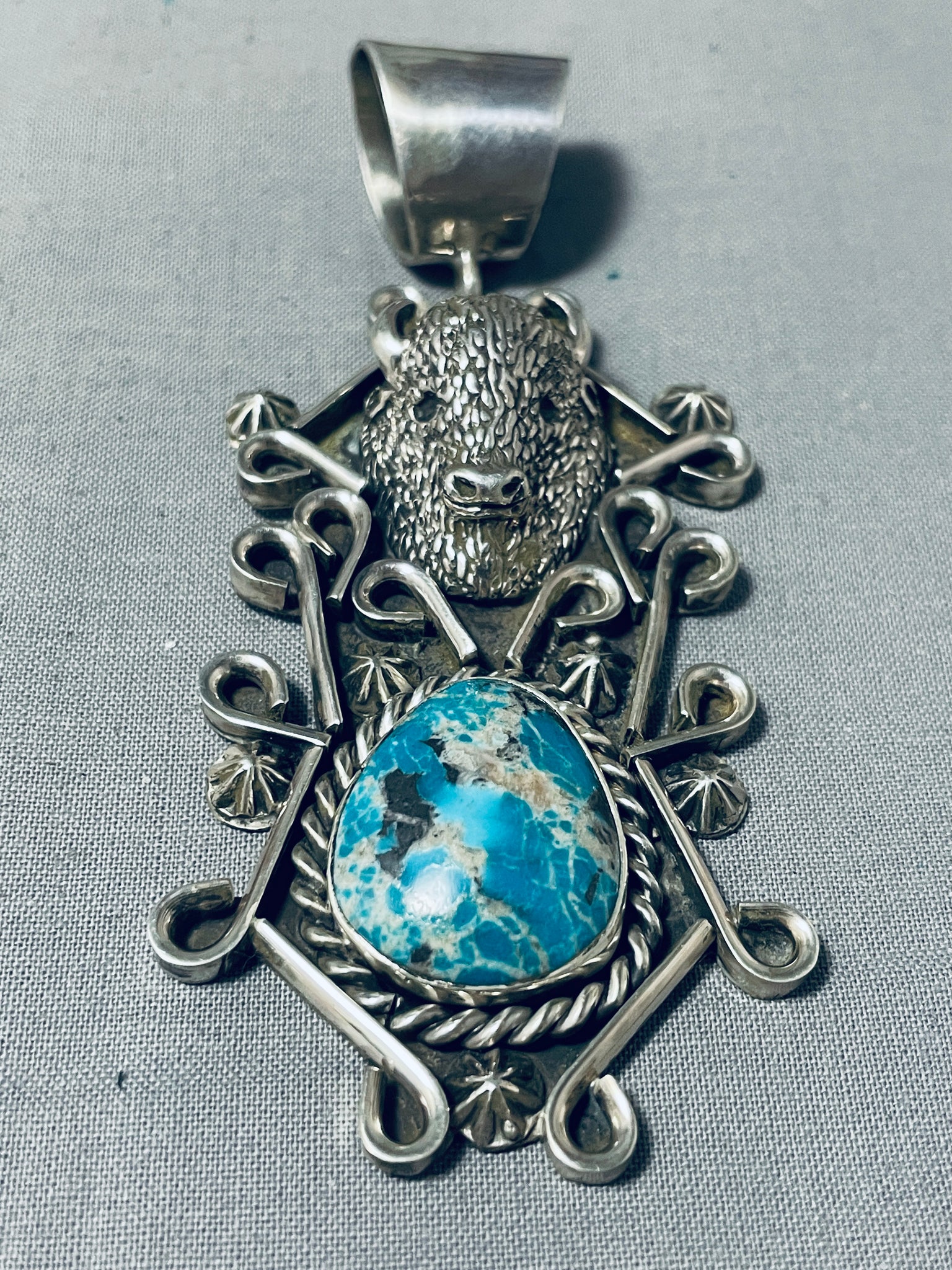 Noteworthy Native American Navajo Old Kingman Turquoise Sterling Silver Buffalo Pendant