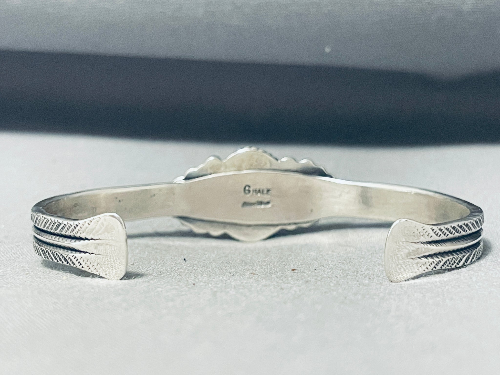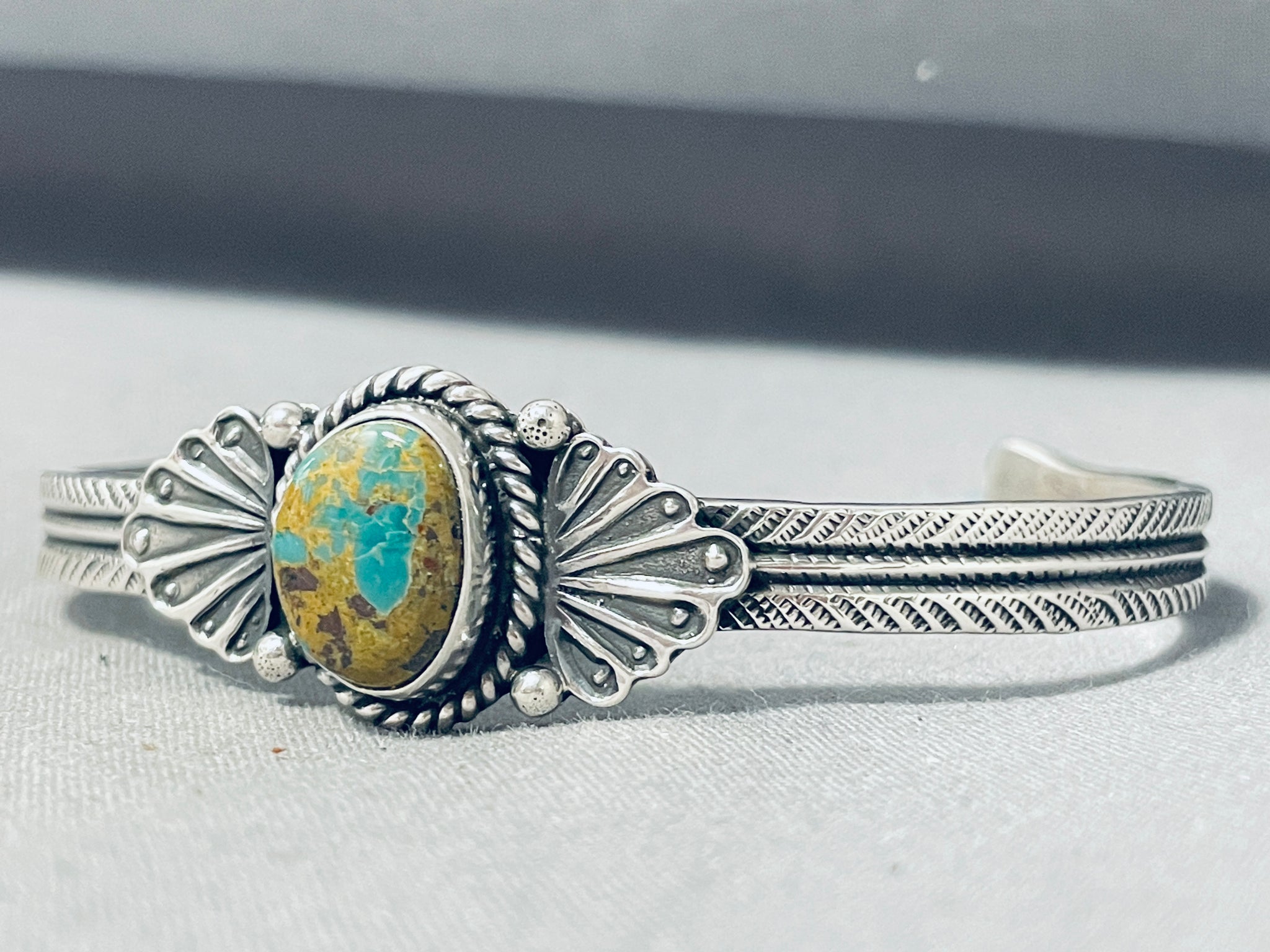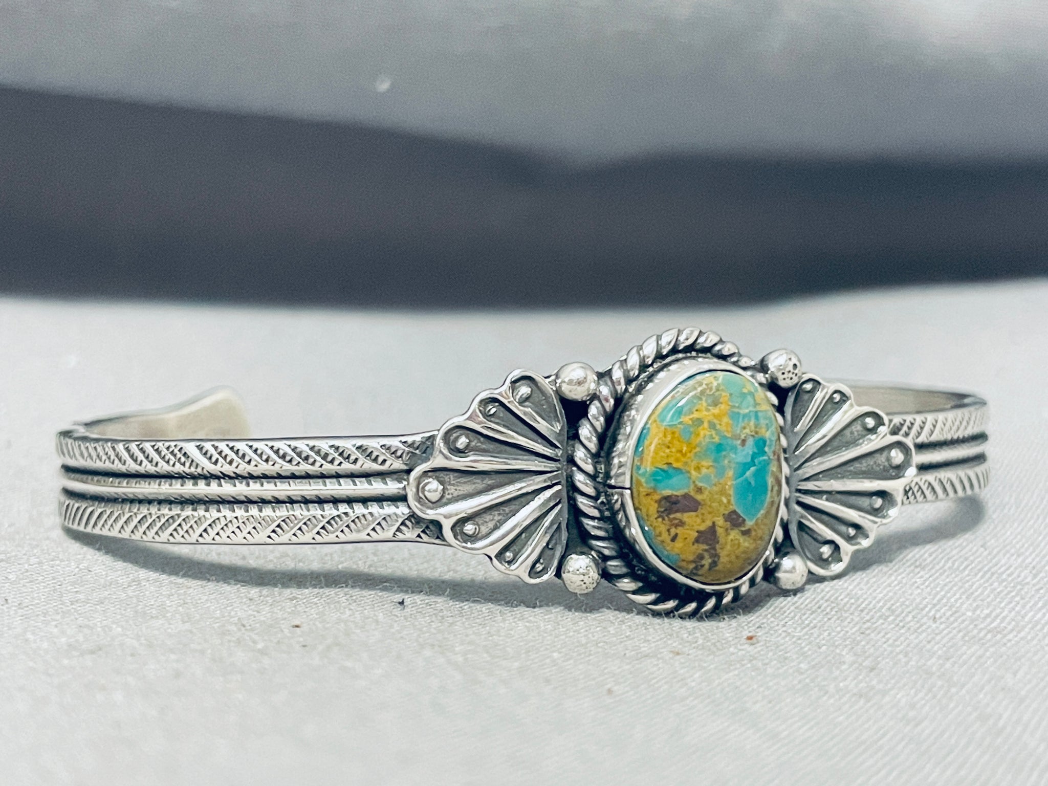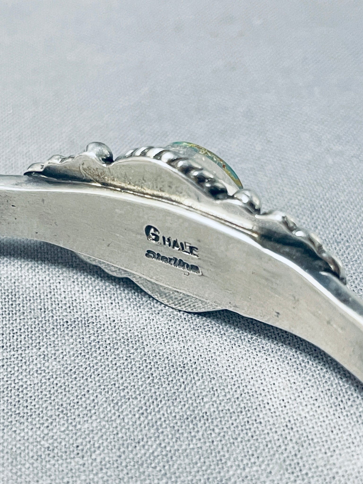 This is a gorgeous Navajo bracelet! It features a Royston turquoise stone with silver rope, silver beads, silver fans, and a hand stamped solid silver cuff! Completely Authentic! The center stone measures around 5/8" x 1/2". The width of the bracelet measures around 3/4". Signed by Navajo artist, G. Hale. Sterling silver, marked. The inside end to end measures around 6" with an additional 1-3/8" gap. Sturdy 28 grams.