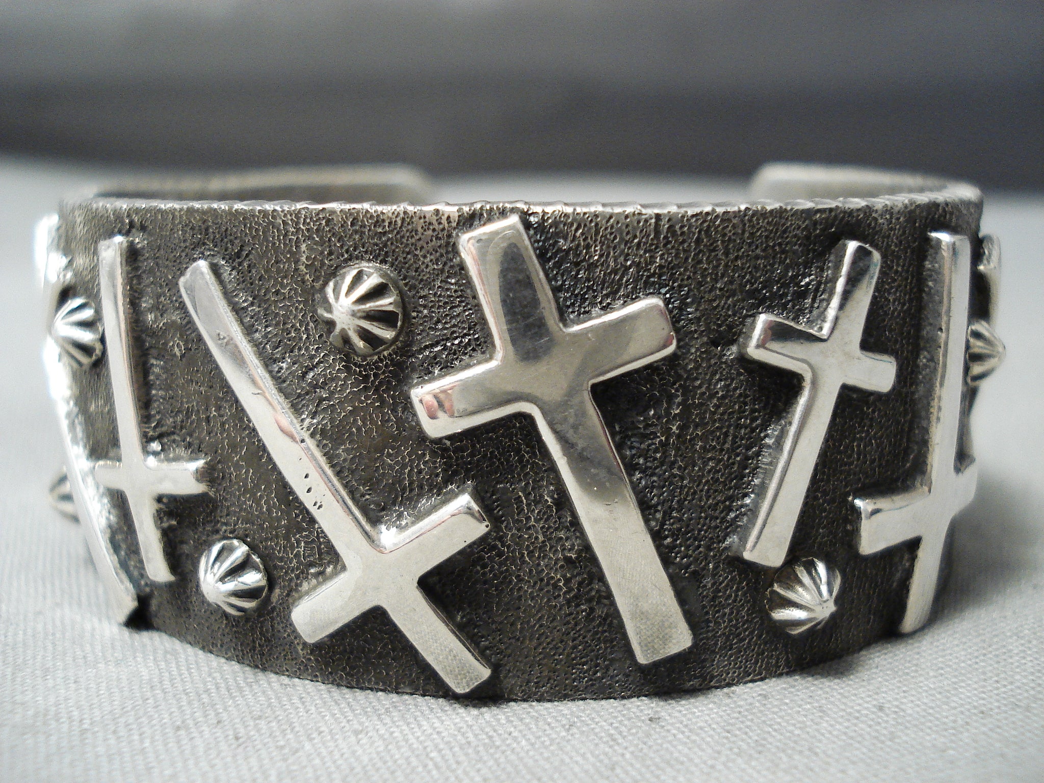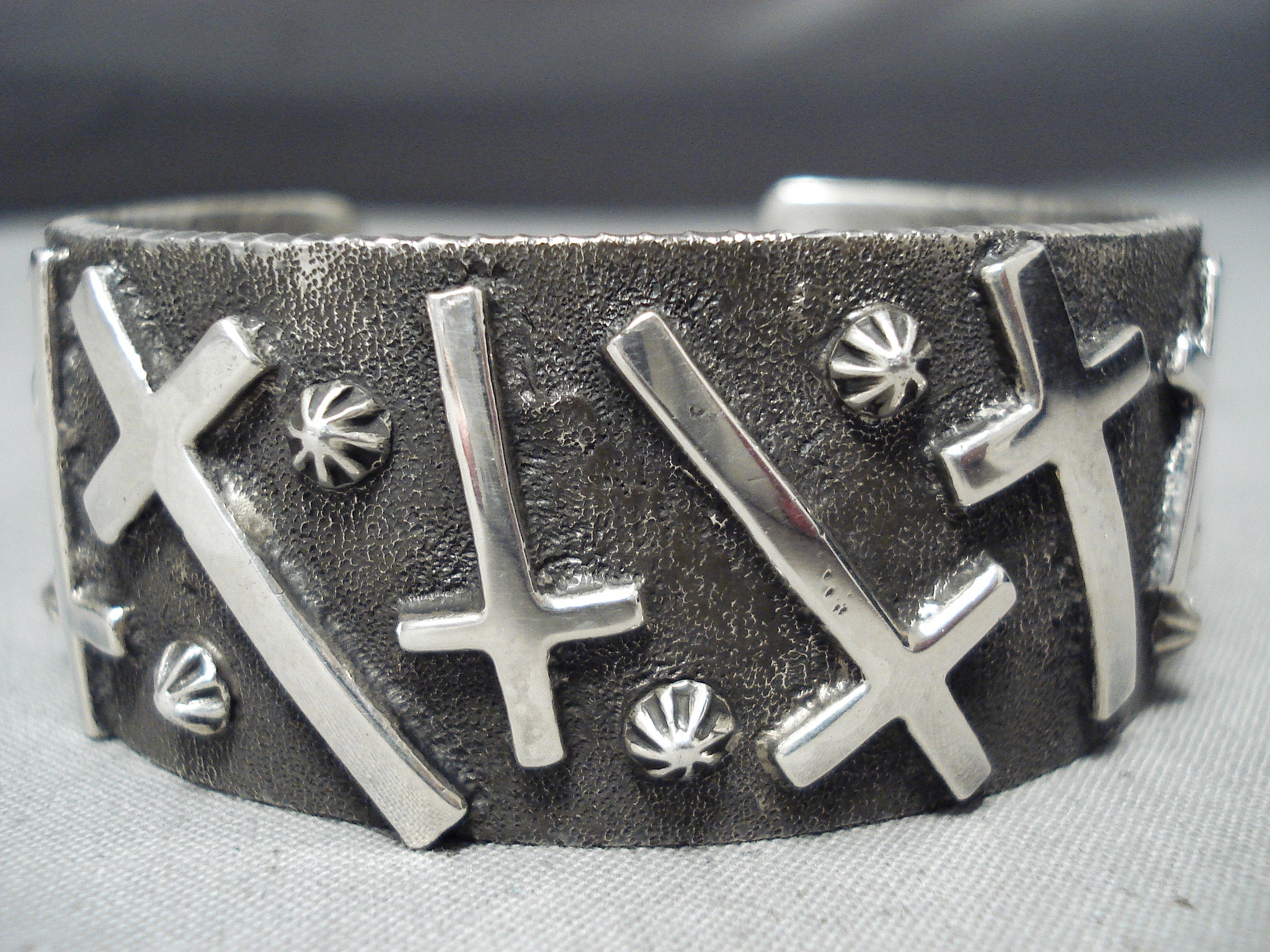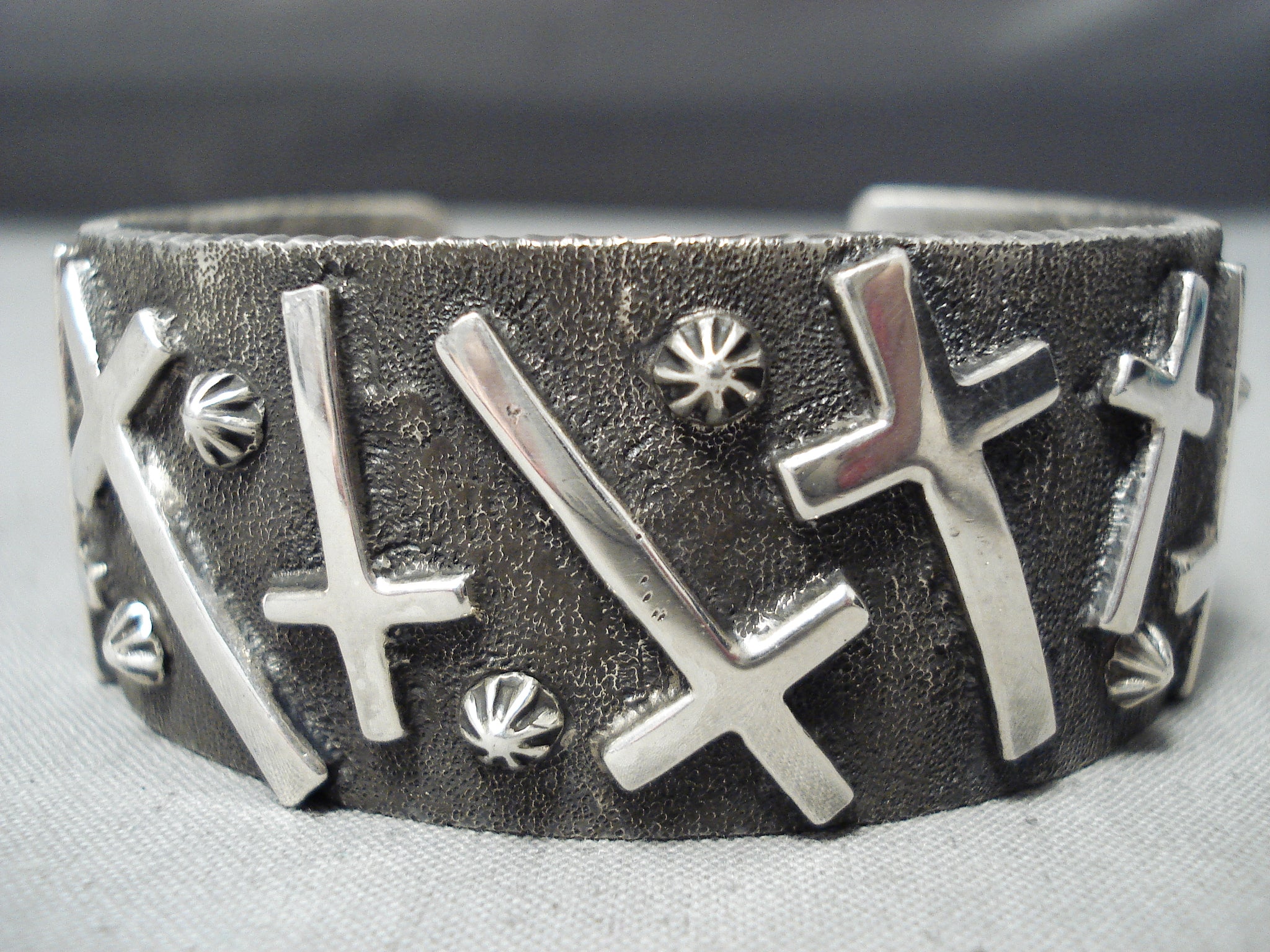 Here we have an astonishing Navajo silver bracelet. Set against the textured background and reaching from side to side, this thick cuff creates an impressive look as it boasts 12 raised crosses as they mingle among silver starbursts! The width of the bracelet measures around 1". Signed by Navajo artist, Stan Yazzie. Sterling silver. The inside end to end measures around 5-1/2" with an additional 1-1/8" gap. Sturdy 90 grams.