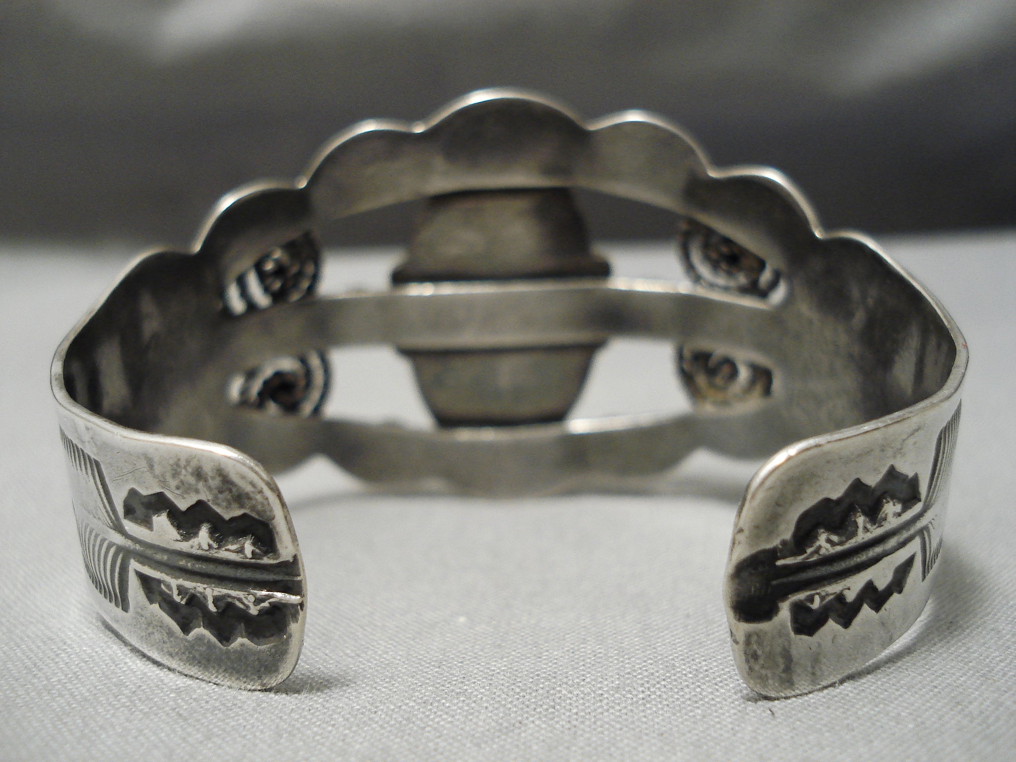 This is a striking vintage Navajo single stone silver bracelet being from the earlier 1900's. This piece contains a wonderful dome shaped Cerrillos turquoise stone. Accenting the stone are amazing silver swirling patterns with surrounding shells, raindrops and ropes. The center stone measures around 1" x 1/2". The width of the bracelet measures around 1-1/2". Sterling silver. Cir. 1930's+. The inside end to end measures around 5-1/2" with an additional 1" gap. Sturdy 38 grams.