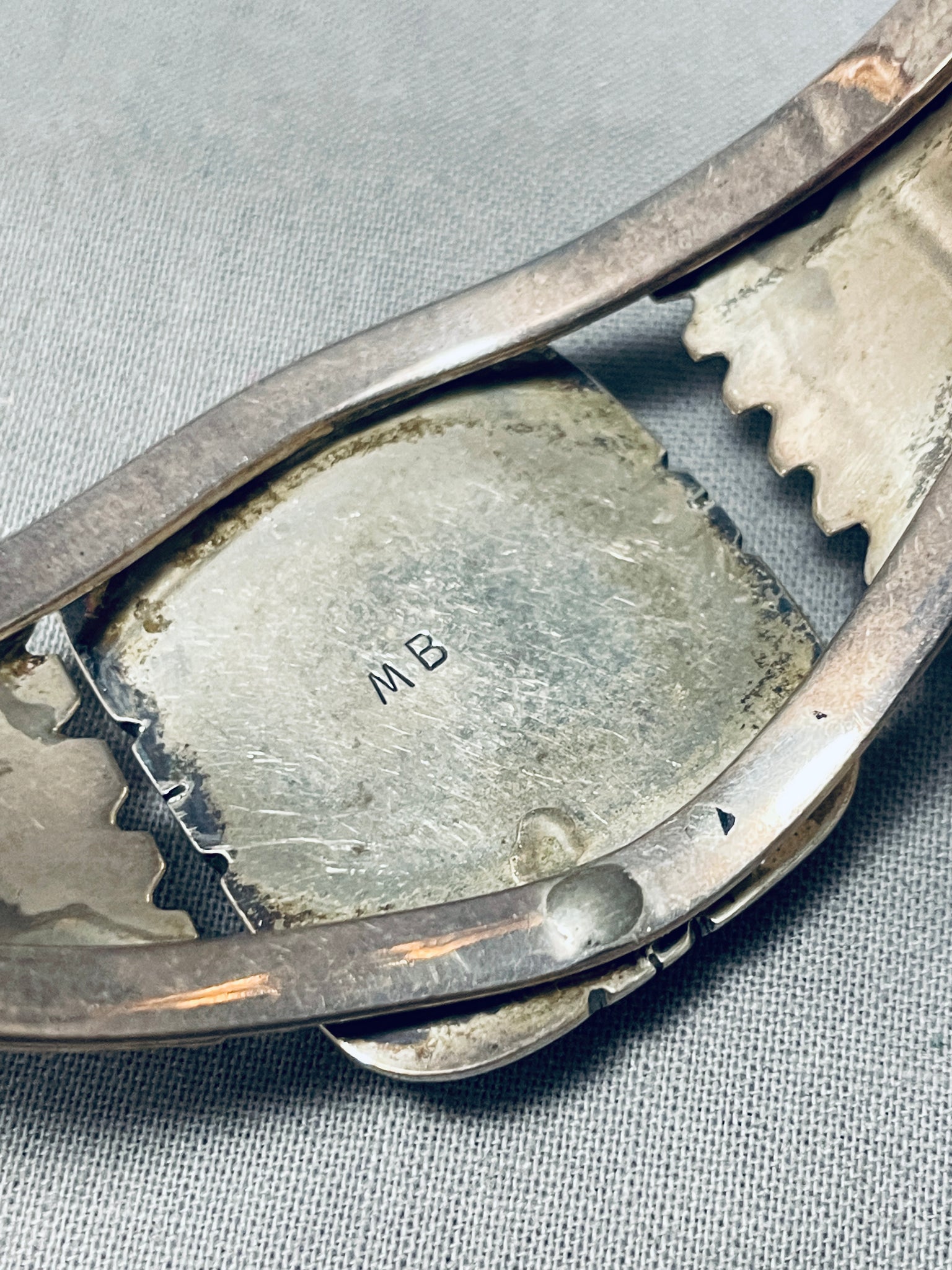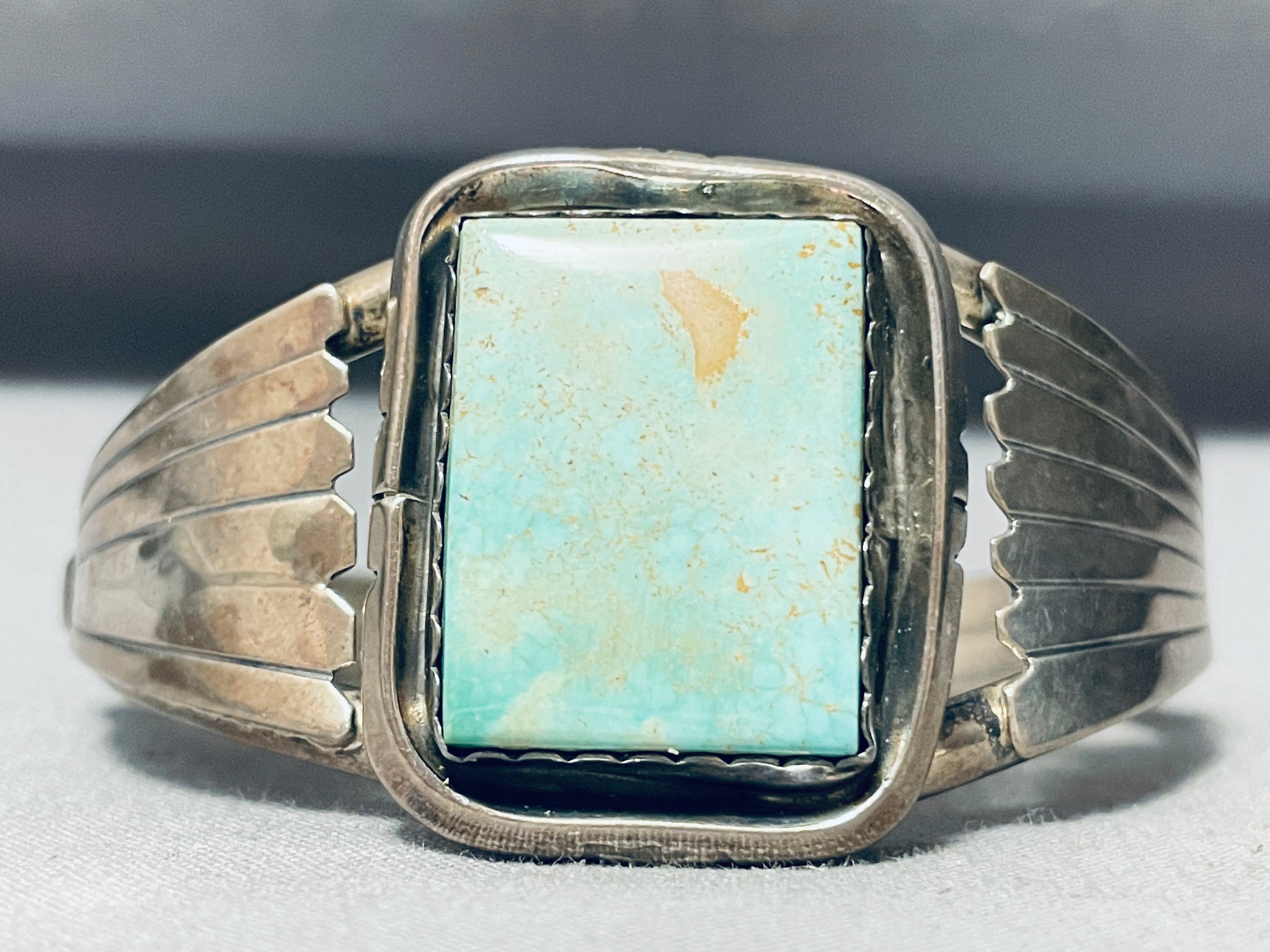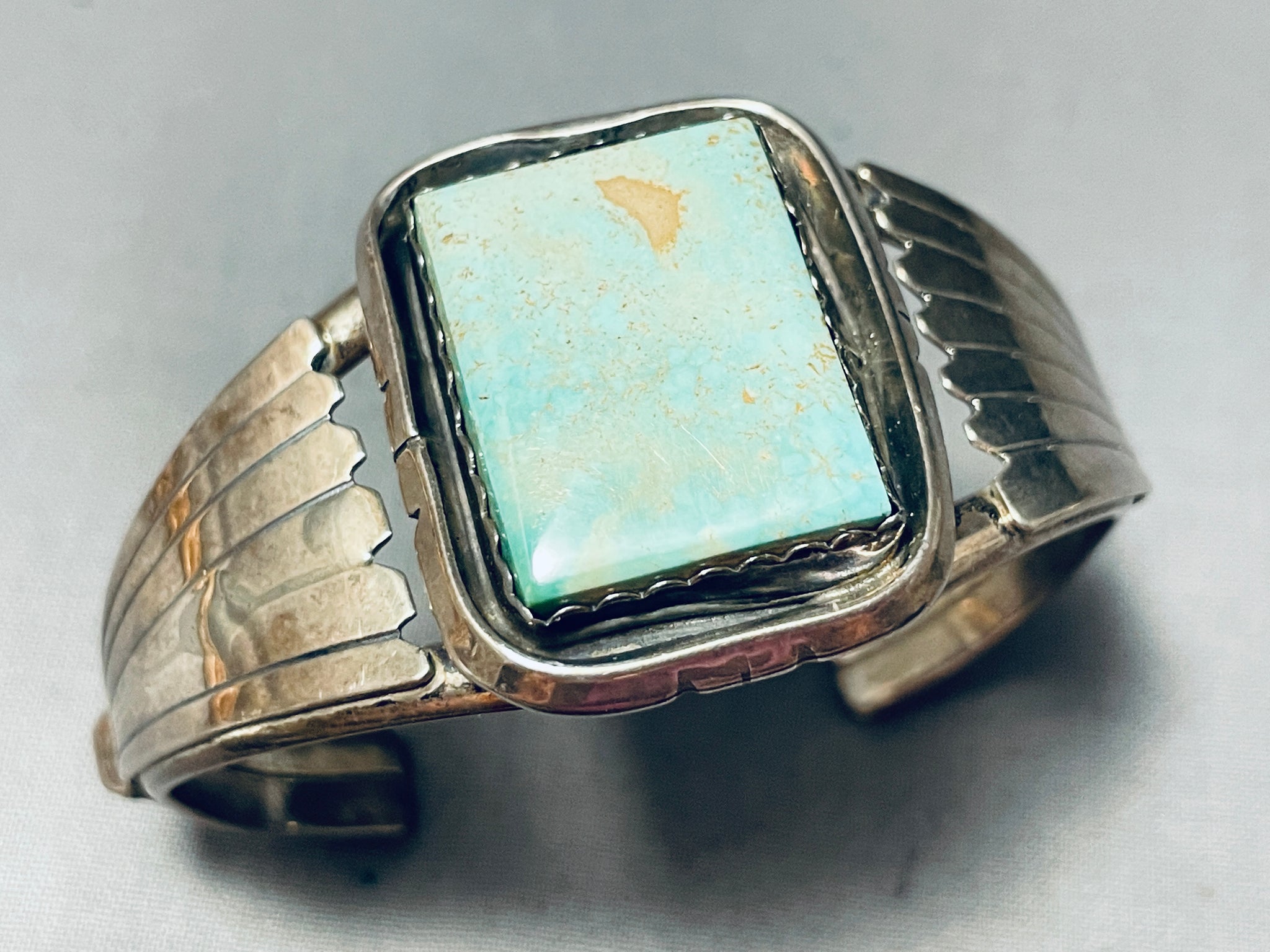 This is an incredible vintage Navajo single stone silver bracelet. This amazing bracelet contains a large center rectangular shaped Easter Blue turquoise stone. The stone is beautifully placed in a wonderful shadowbox setting. Accenting the sides of the double silver shank bracelet are fascinating large sun bursting flanks. This is such a remarkable bracelet. The center stone measures around 1" x 3/4". The width of the bracelet measures around 1-3/8". Signed by Navajo artist, MB. Sterling silver. Cir. 1970's+. The inside end to end measures around 5-1/4" with an additional 1-1/4" gap. Sturdy 39 grams.