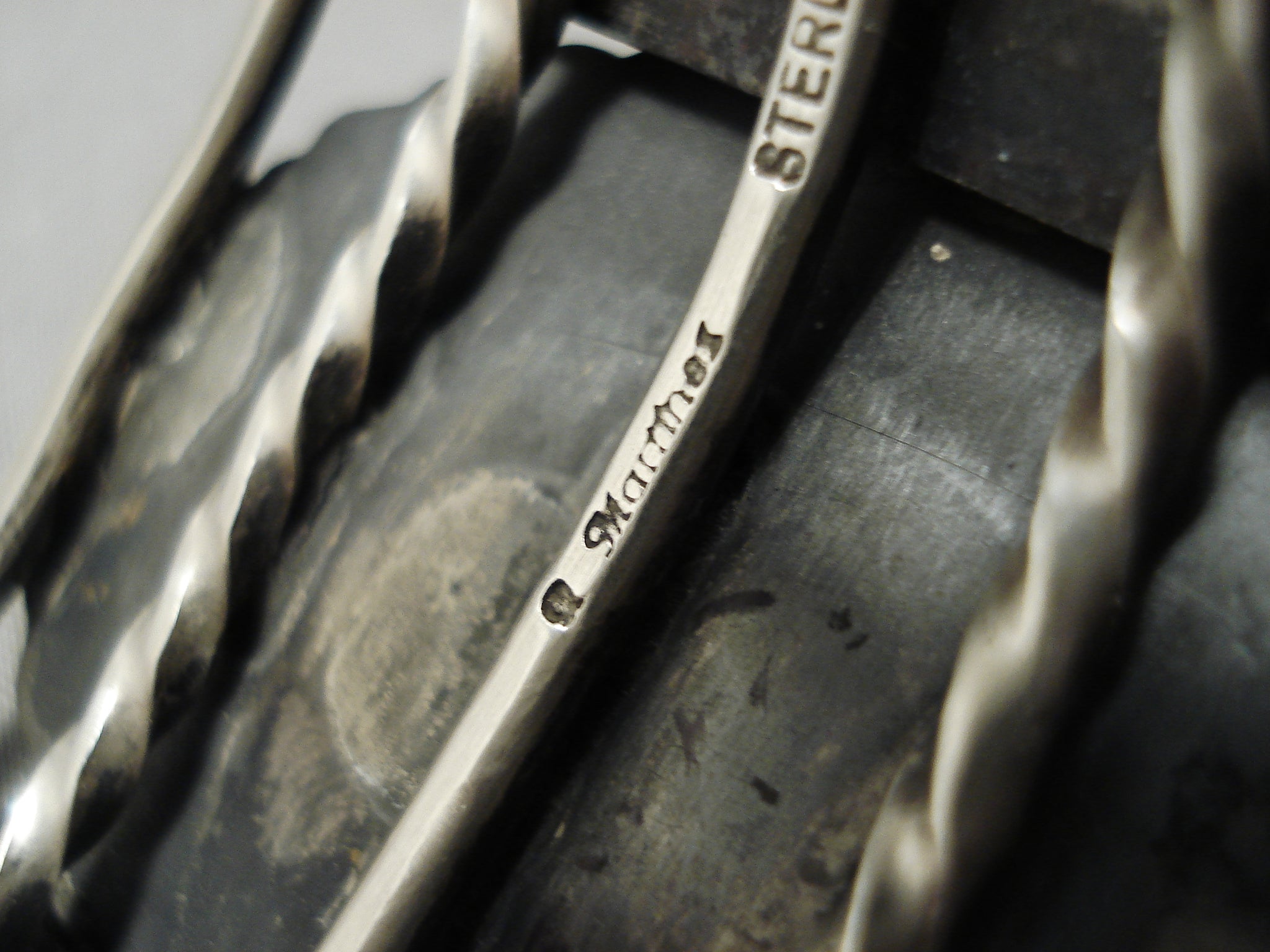 This is a tremendous Navajo colossal silver bracelet with a beautiful center turquoise stone. This is definitely one of the finest Ricky Martinez bracelets we have ever collected. The turquoise stone is from the wonderful Royston turquoise mine. Surrounding the stone are impeccable silver works that consist of raindrops and coiled patterns. Check out those marvelous and unique silver flanks that are situated at the sides of the stone including five silver flanks on each side that consist of thick triangular shaped flanks with accenting coiled flanks. This bracelet contains a marvelous thick and sturdy five silver shank cuff with two being twisted shanks. Accenting the ends of the large silver flanks are phenomenal silver sun stamped patterns. The center stone measures around 1-3/8" x 7/8". The width of the bracelet measures around 1-7/8". Signed by Navajo artist, Ricky Martinez . Sterling silver, marked. Cir. 1970's+. The inside end to end measures around 5-1/4" with an additional 1" gap. Sturdy 119 grams.