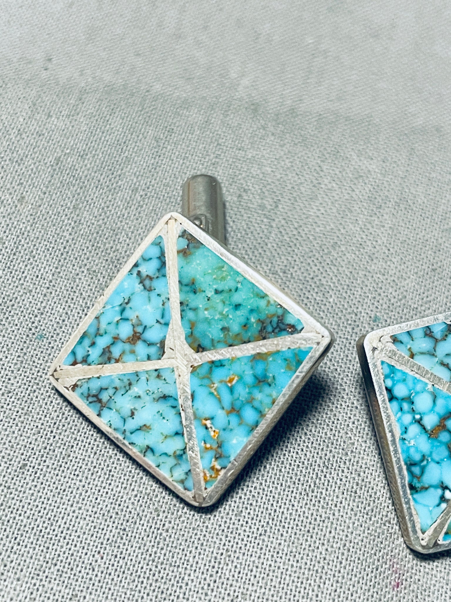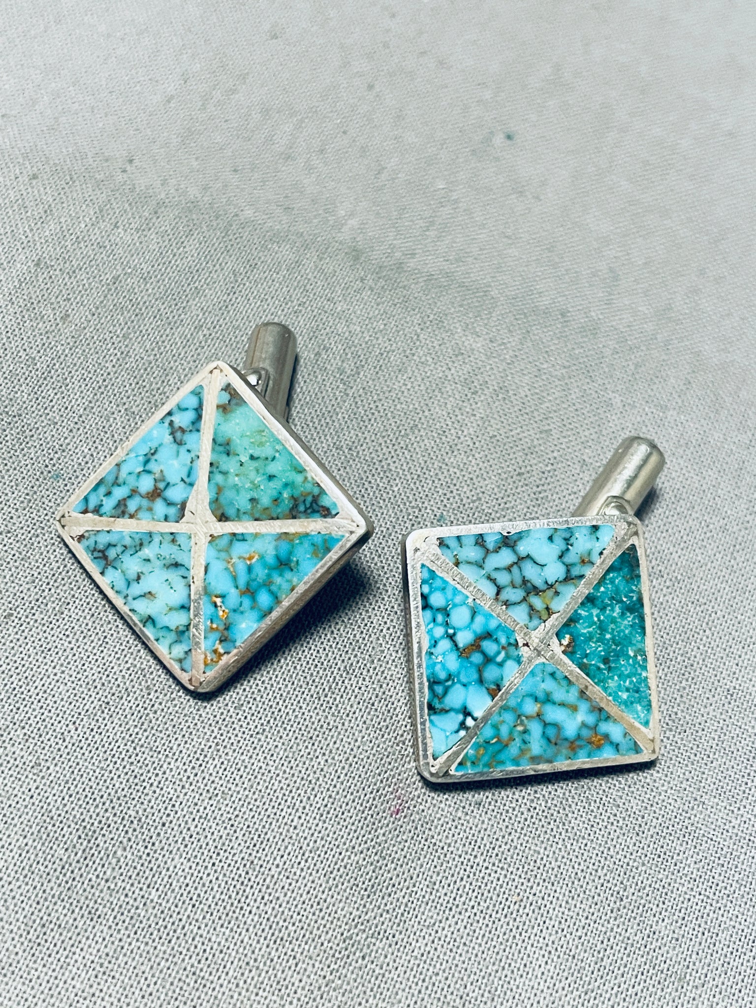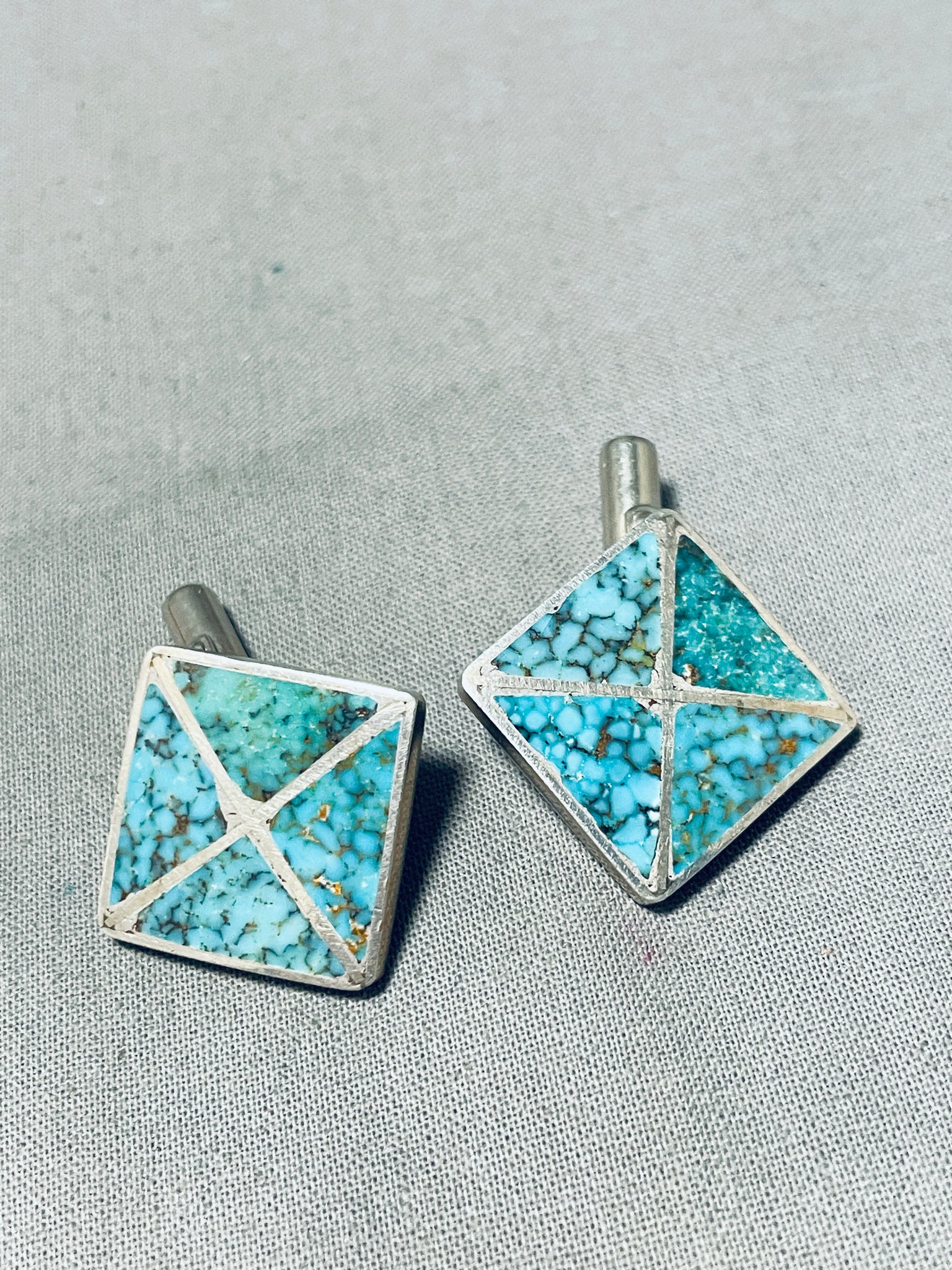 Up for sale is this appealing pair of vintage Zuni cuff links! They feature inlay spiderweb turquoise triangles with silver borders! These cuff links will add instant interest to any outfit! The cuff links measure about 3/4" x 3/4". Sterling silver. Sturdy 14 grams.