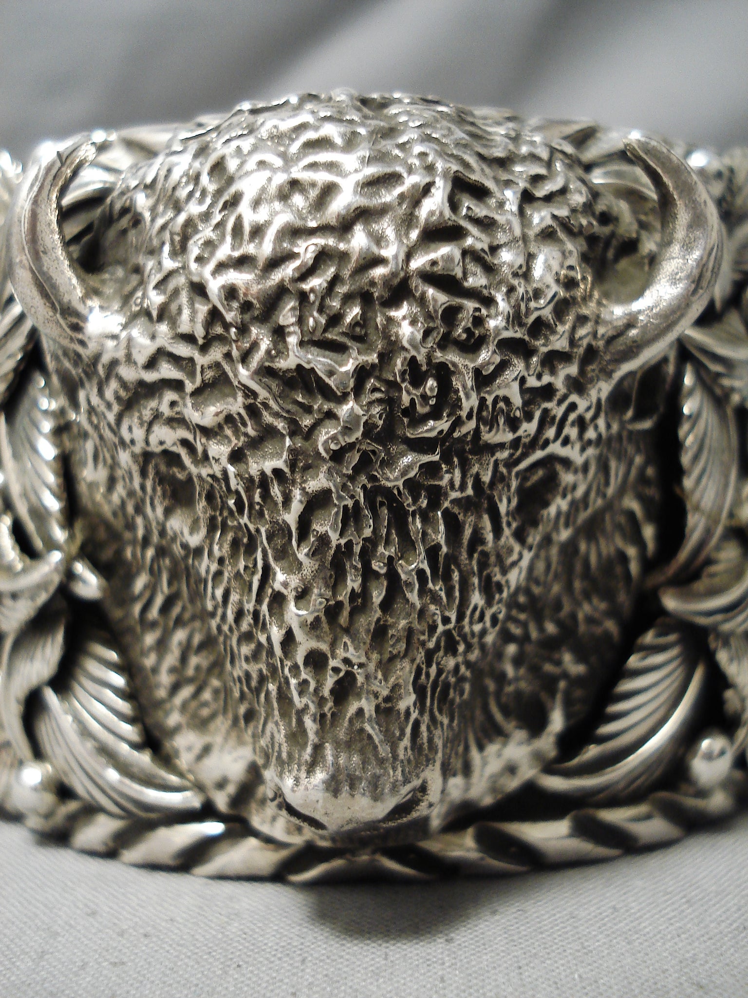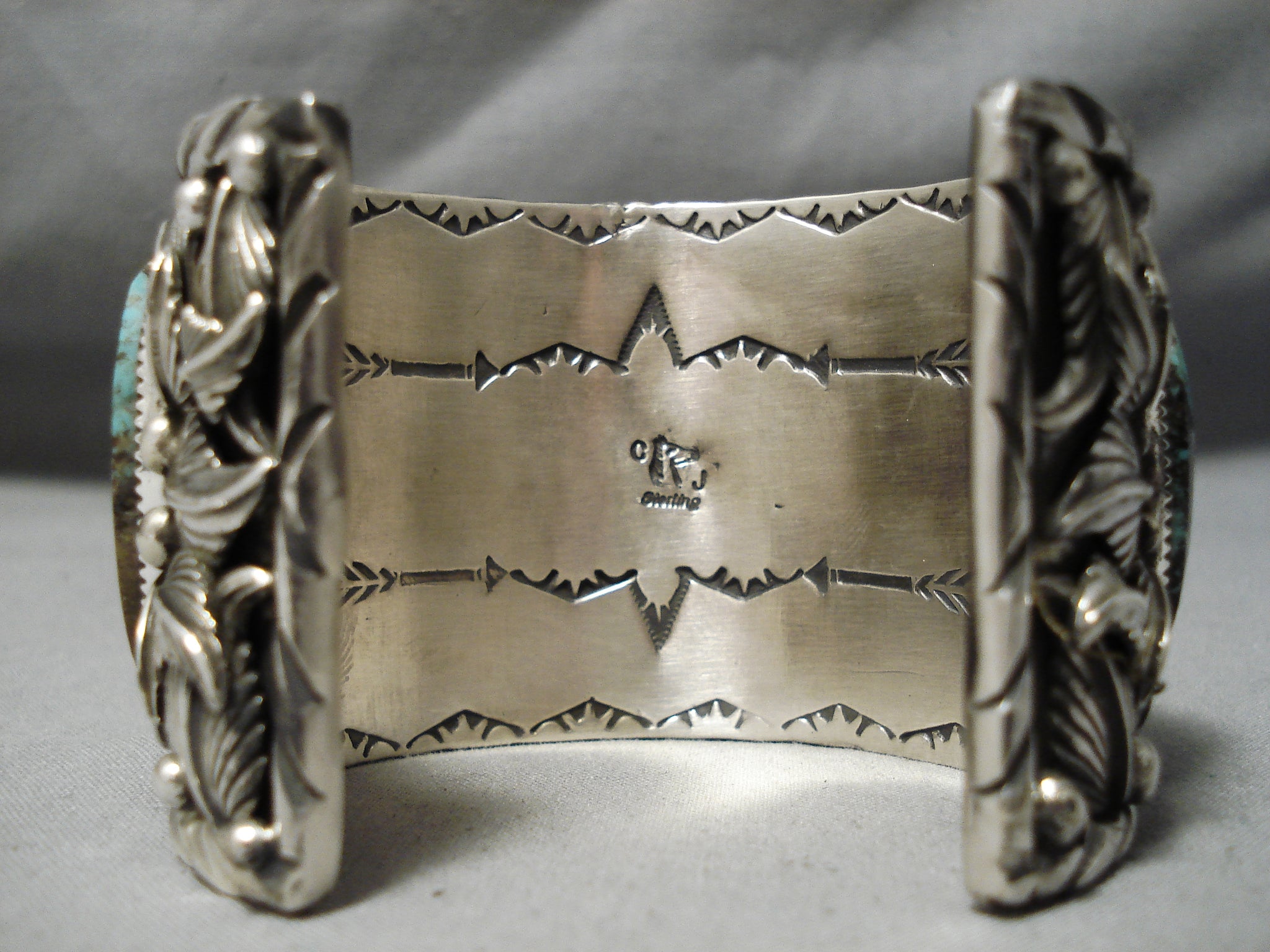 This is a remarkable vintage Navajo heavy and thick silver buffalo bracelet. This incredibly huge bracelet contains two colossal dome shaped turquoise stones on each end. Located in the center is a phenomenal hand carved silver buffalo head that measures around 1-3/4" X 1-1/2". Resting throughout the entire bracelet are impeccable silver works that consist of hand carved leaves, raindrops, and bordering wave works. The bracelet is very wide, thick and sturdy. The stones measure around 1-1/2" x 1". The width of the bracelet measures around 2". Signed by Navajo artist, CJ. Sterling silver, marked. Cir. 1970's+. The inside end to end measures around 5-3/4" with an additional 1-1/2" gap. Sturdy 221 grams.