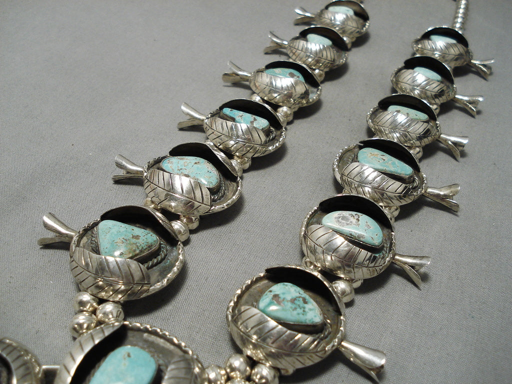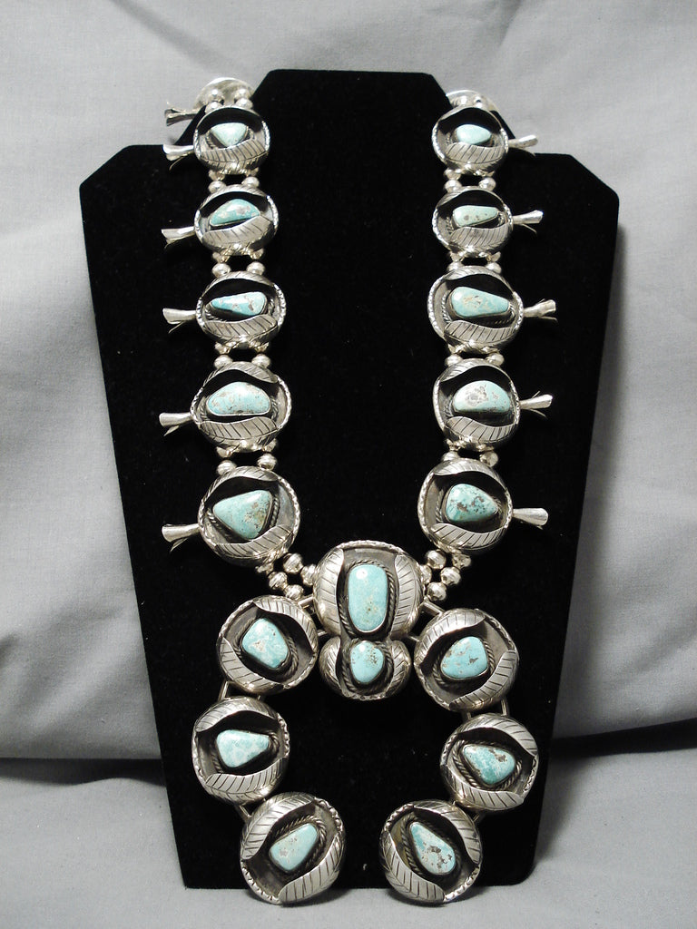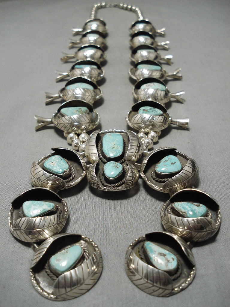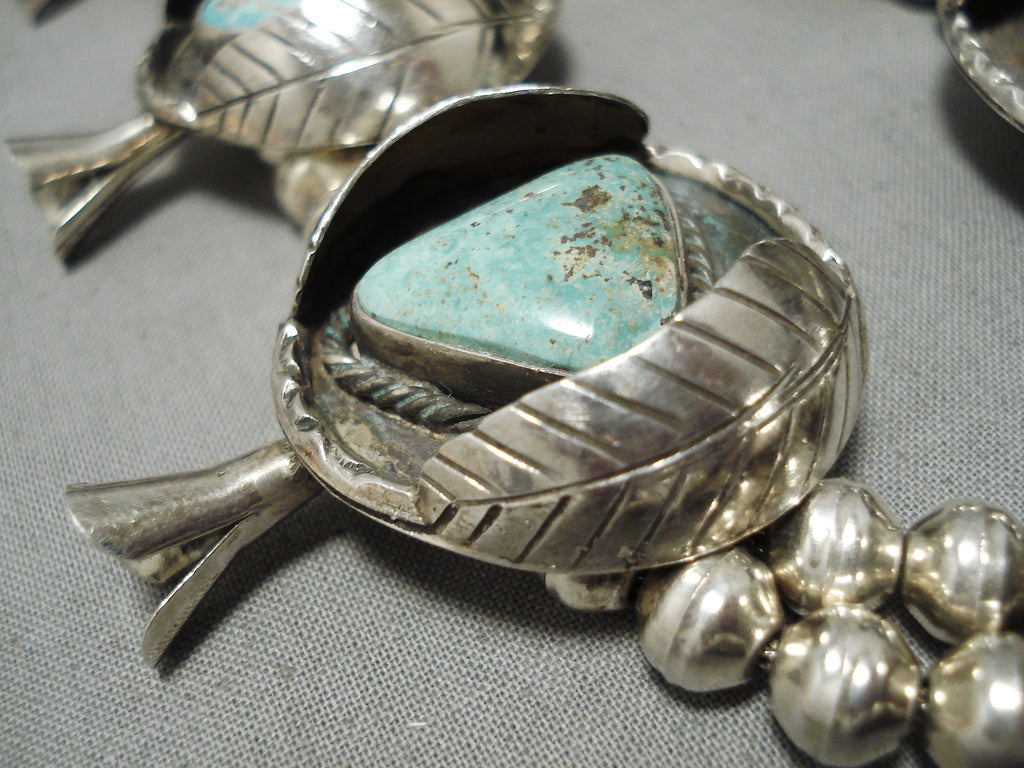 One Of Biggest Vintage Native American Navajo Turquoise Sterling Silver Squash Blossom Necklace