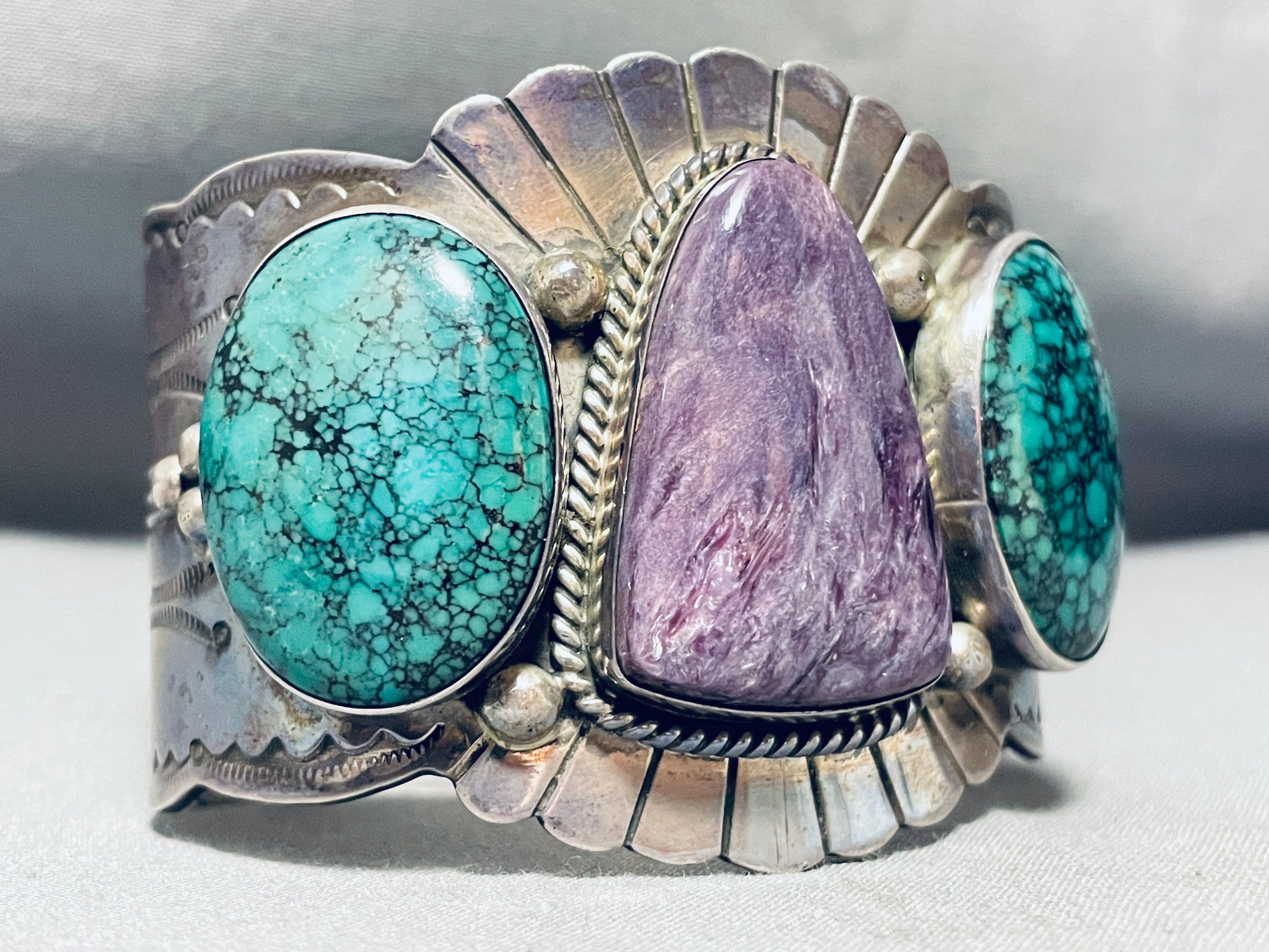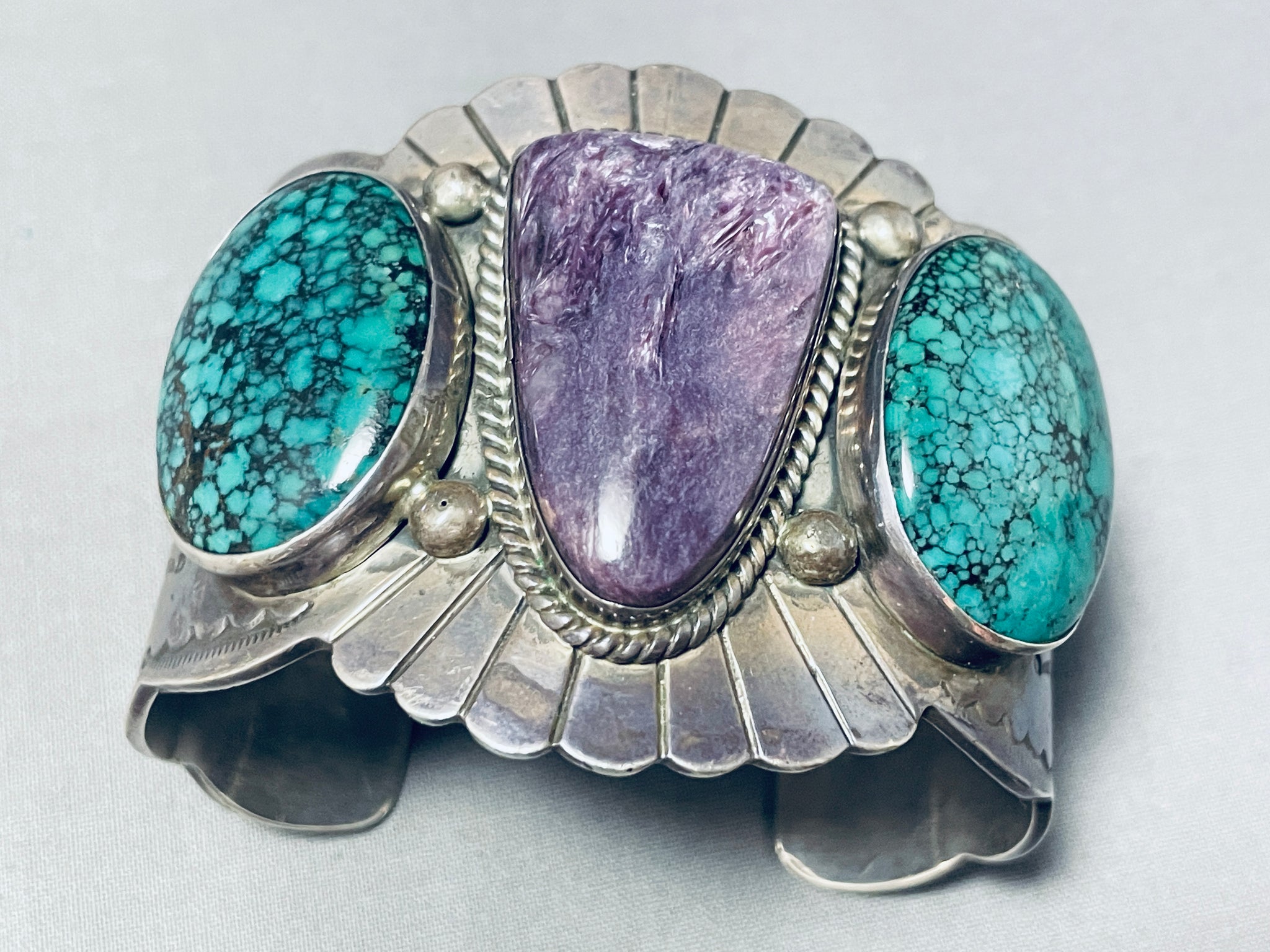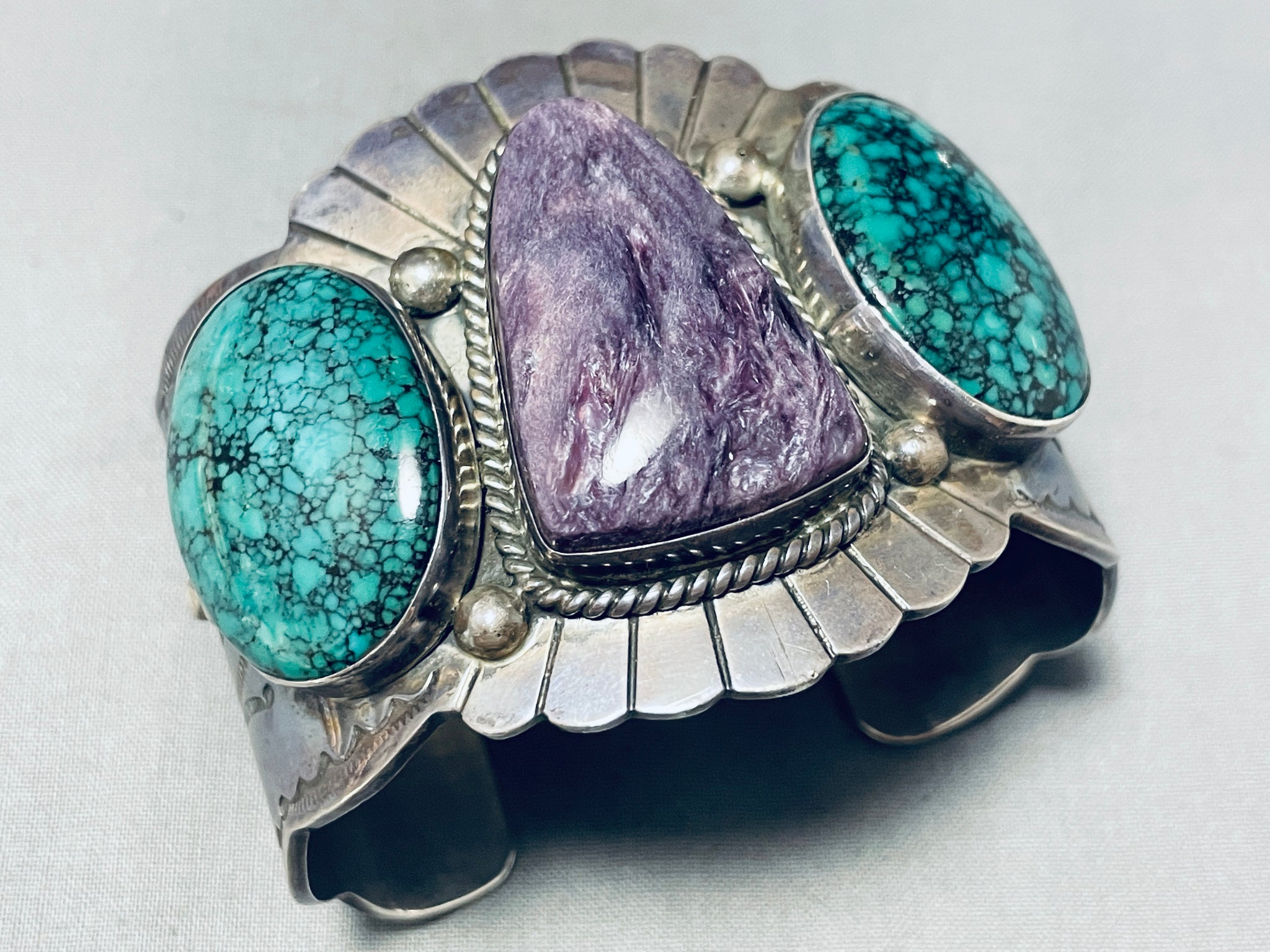 This is a magnificent vintage Navajo three stone very large wide cuff silver bracelet. This impeccable bracelet contains three beautiful stones, two being wonderful large spiderweb matrix green turquoise stones and the center being a large curved triangular shaped Charoite stone. Surrounding the purple stone is a thick silver rope. Situated throughout all of the stones are amazing large silver raindrops. I love the silver stampings that rest throughout the entire cuff of this bracelet including sun bursting patterns in the center with sun work, dotted works and line segments running down each end. The way the edges of the cuff beautifully wave from one end to the other is just astonishing. I love the detailing of this bracelet. The center stone measures around 1-3/8" x 7/8". The width of the bracelet measures around 2-1/8". Sterling silver. Cir. Mid century . The inside end to end measures around 5-3/4" with an additional 1-1/4" gap. Sturdy 140 grams.
