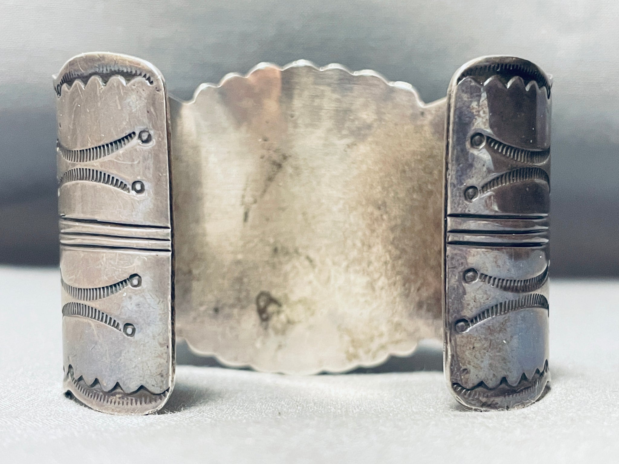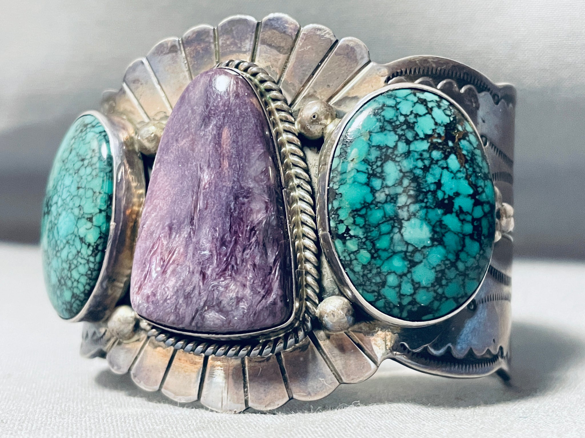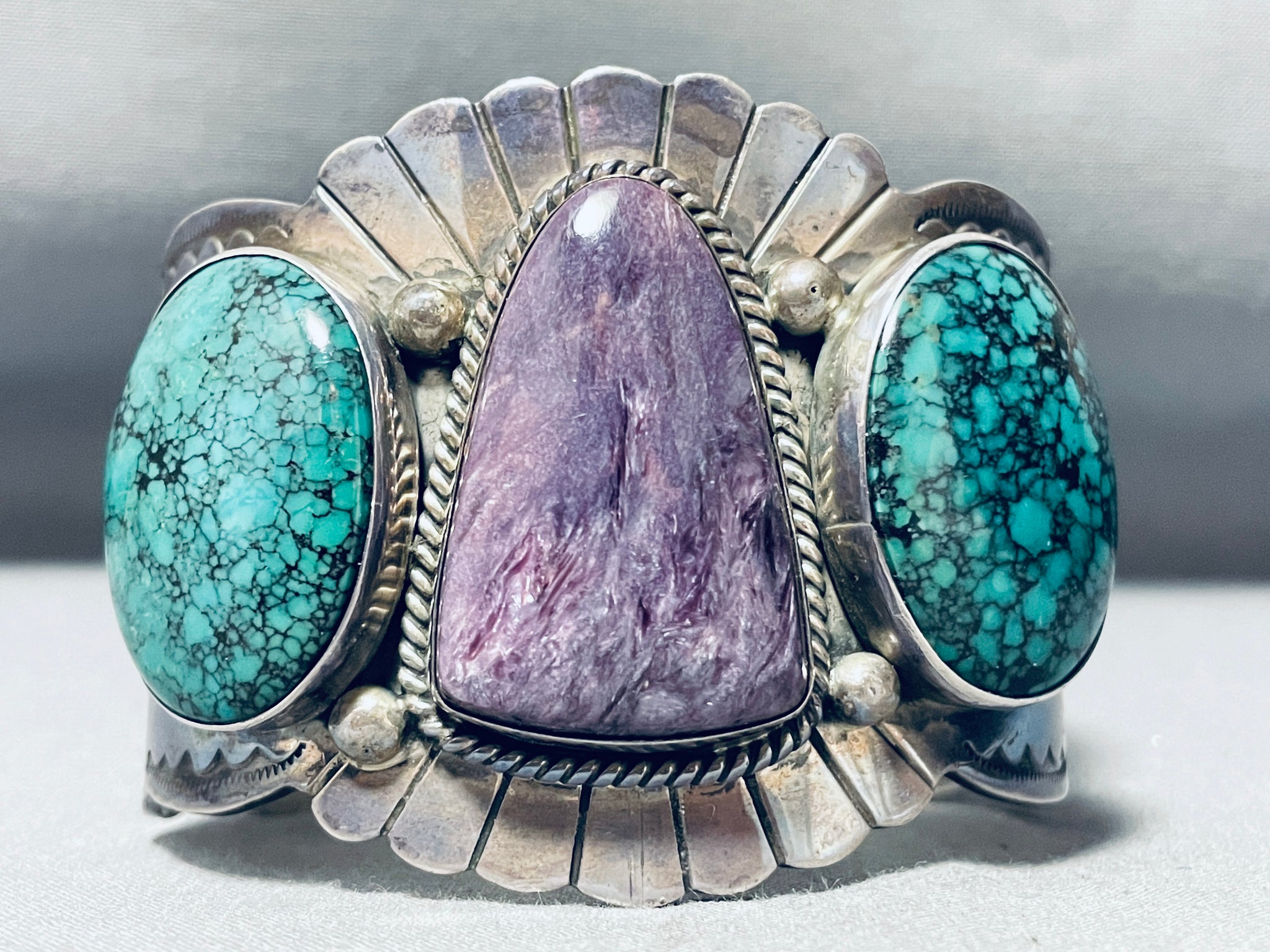This is a magnificent vintage Navajo three stone very large wide cuff silver bracelet. This impeccable bracelet contains three beautiful stones, two being wonderful large spiderweb matrix green turquoise stones and the center being a large curved triangular shaped Charoite stone. Surrounding the purple stone is a thick silver rope. Situated throughout all of the stones are amazing large silver raindrops. I love the silver stampings that rest throughout the entire cuff of this bracelet including sun bursting patterns in the center with sun work, dotted works and line segments running down each end. The way the edges of the cuff beautifully wave from one end to the other is just astonishing. I love the detailing of this bracelet. The center stone measures around 1-3/8" x 7/8". The width of the bracelet measures around 2-1/8". Sterling silver. Cir. Mid century . The inside end to end measures around 5-3/4" with an additional 1-1/4" gap. Sturdy 140 grams.