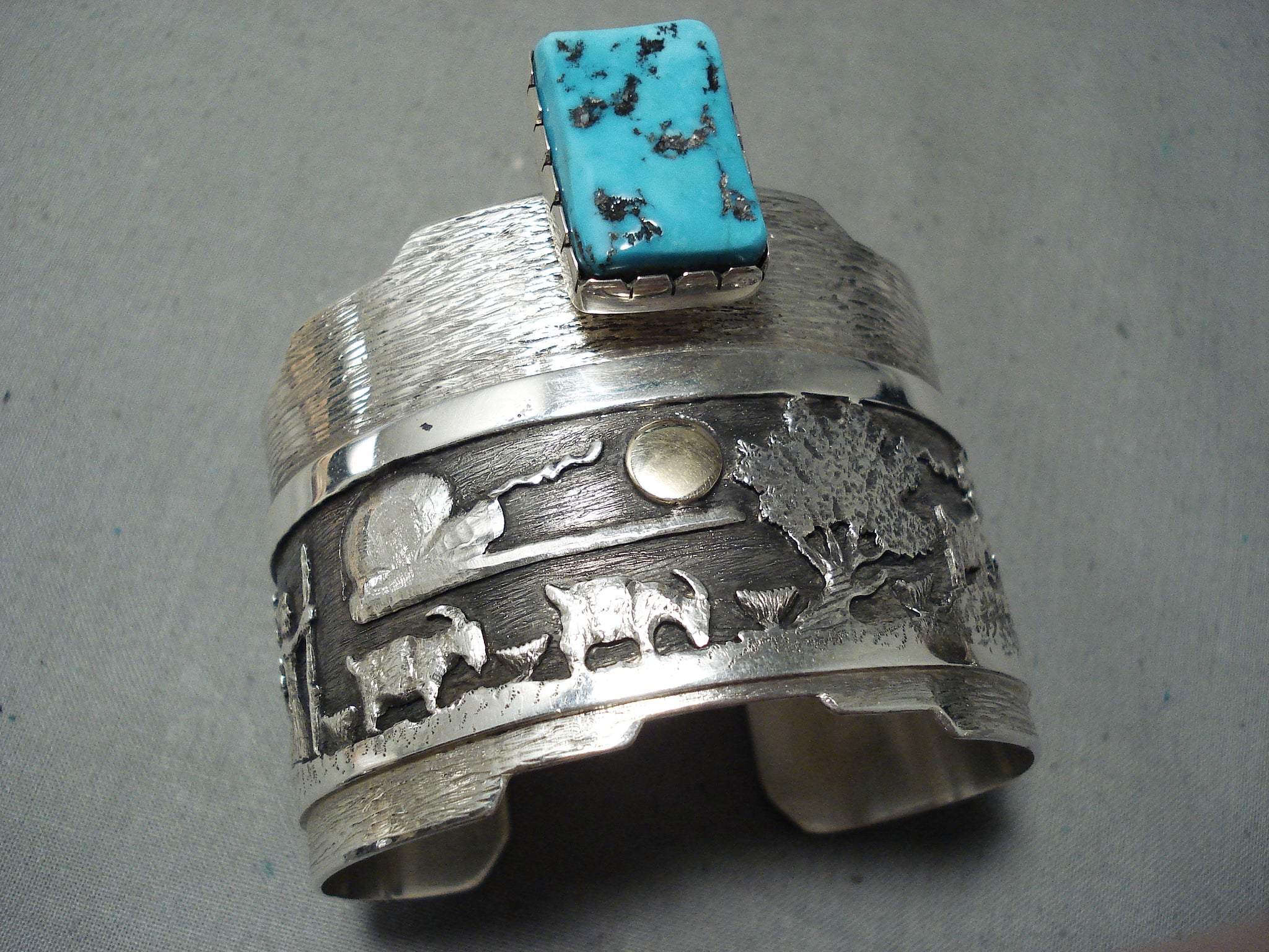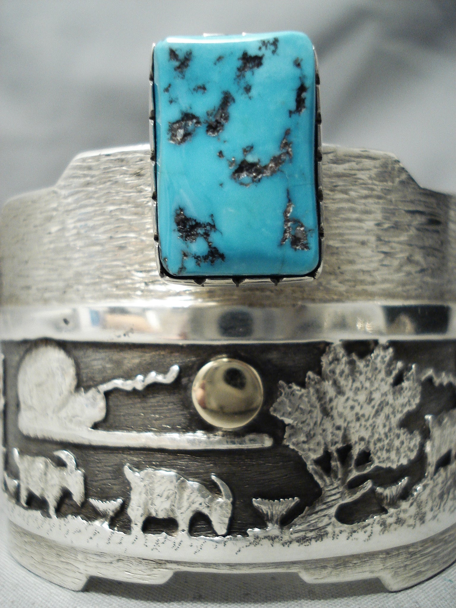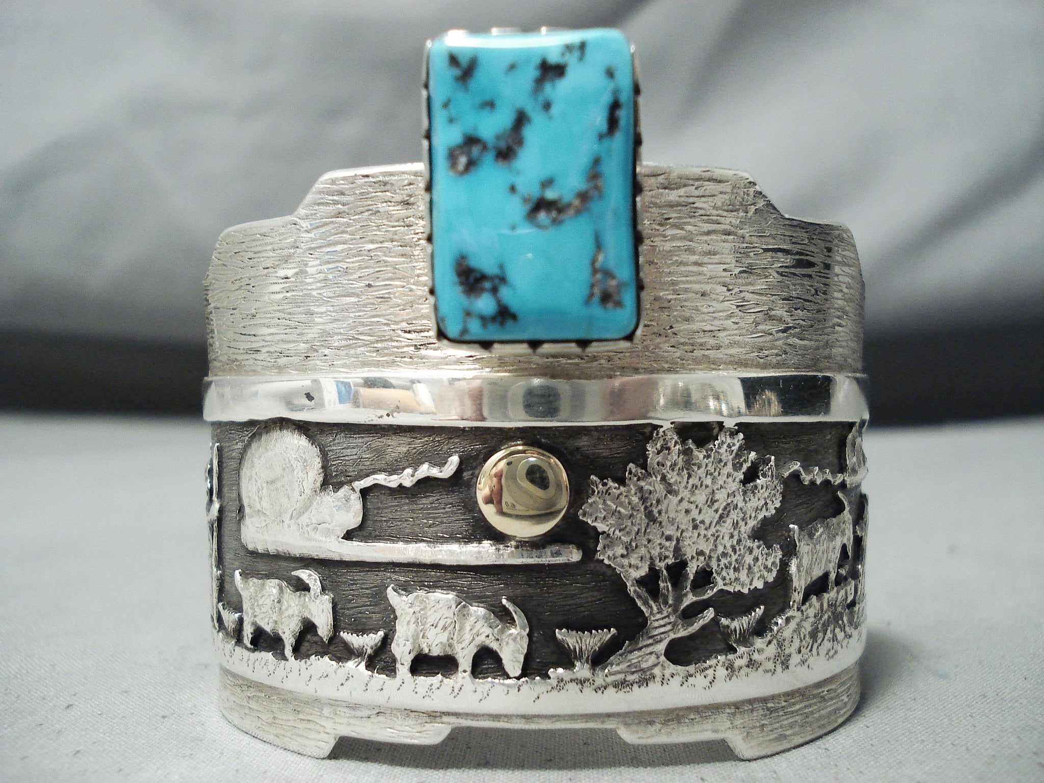 One Of Most Detailed Vintage Native American Navajo Turquoise 14k Gold Sterling Silver Bracelet