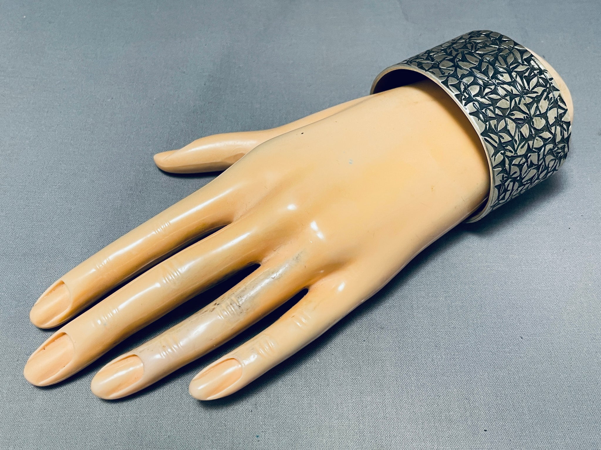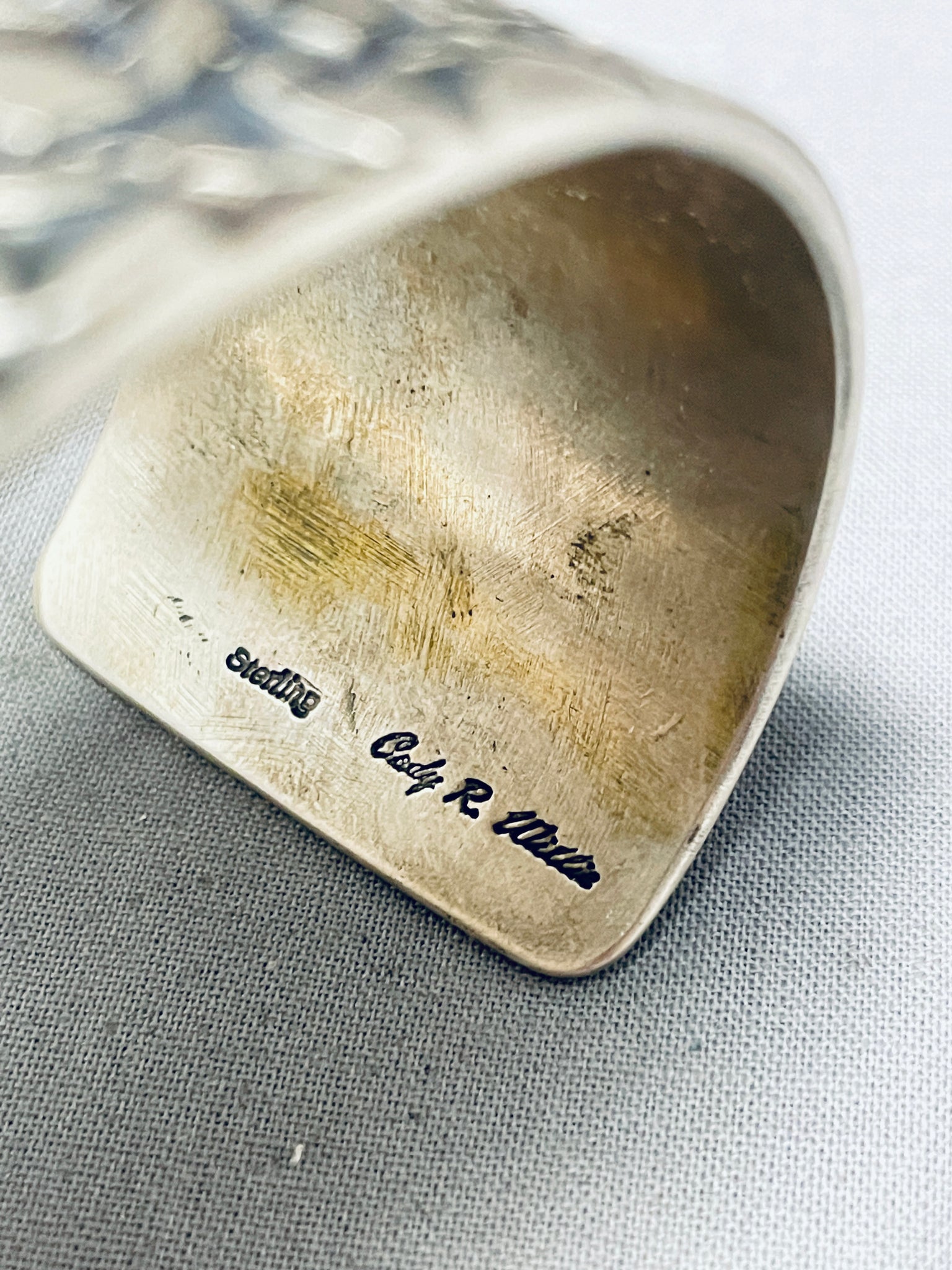 This is an exceptional Navajo all silver wide cuff bracelet. This impeccable bracelet contains a very thick and wide silver cuff that consists of outstanding carvings located throughout. The carvings run from one end of the cuff to the other that consist of amazing floral patterns. I just cannot get over how thick and sturdy this cuff bracelet is. The width of the bracelet measures around 1-1/2". Signed by Navajo artist, Cody Willie . Sterling silver, marked. Cir. 1990's+. The inside end to end measures around 6" with an additional 1-1/4" gap. Sturdy 122 grams.
