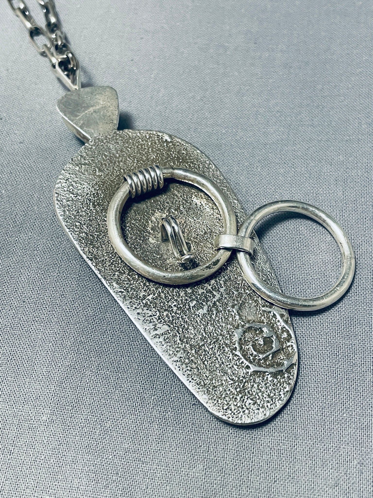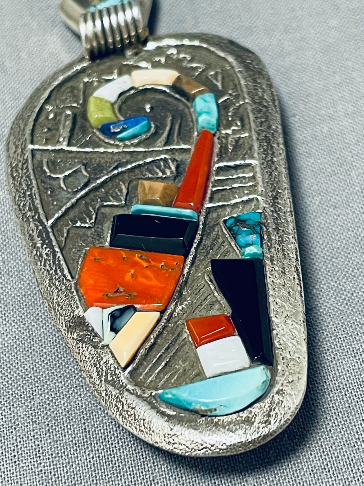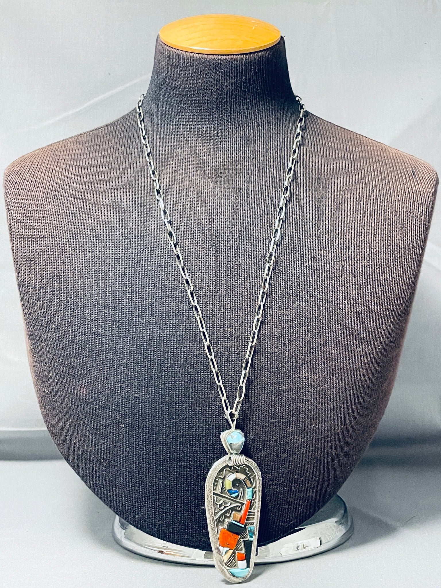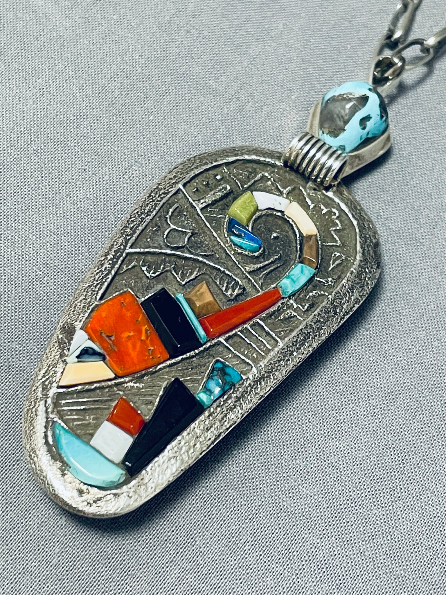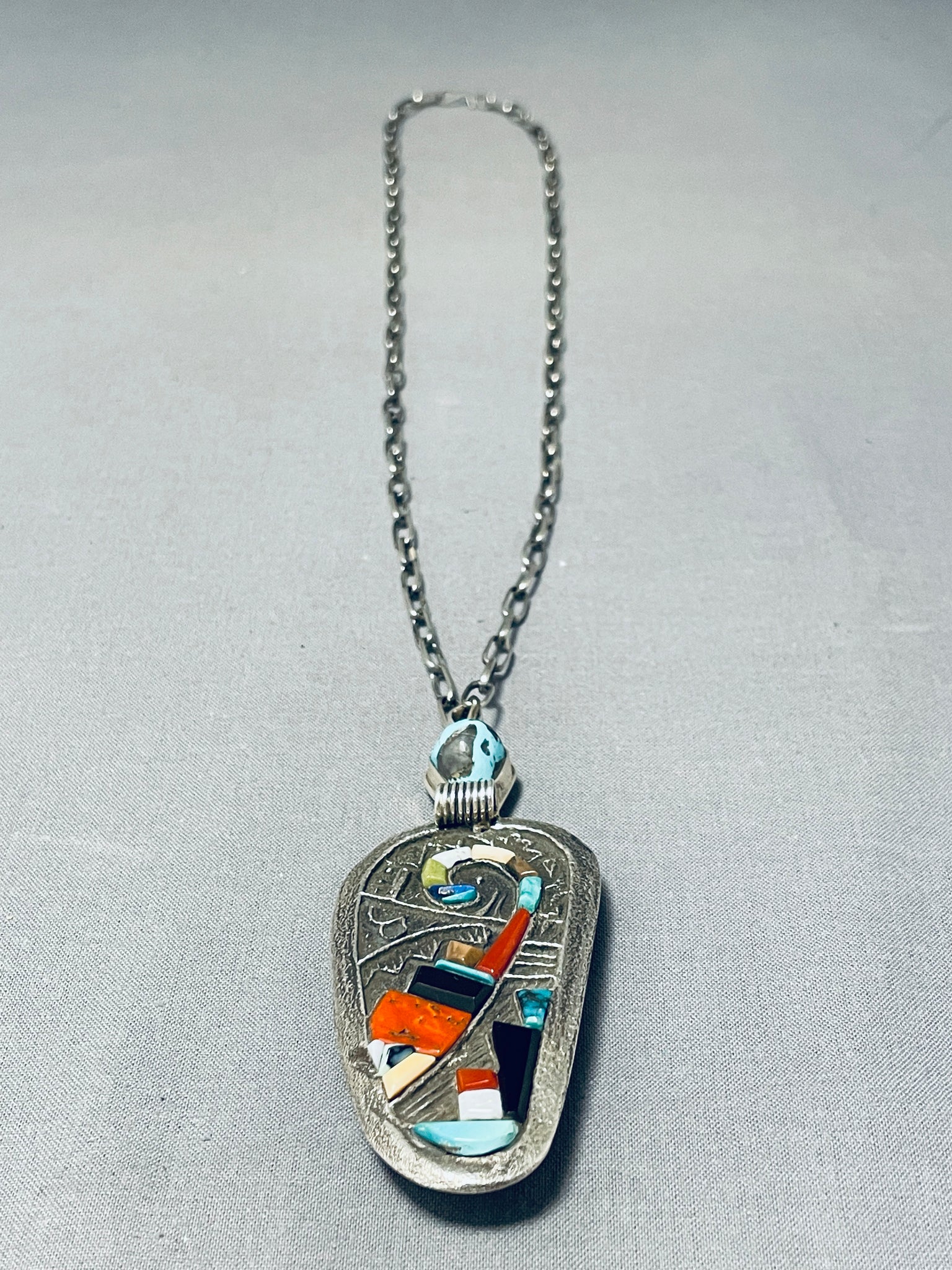 One Of Most Intricate Vintage Native American Navajo Turquoise Inlay Sterling Silver Necklace