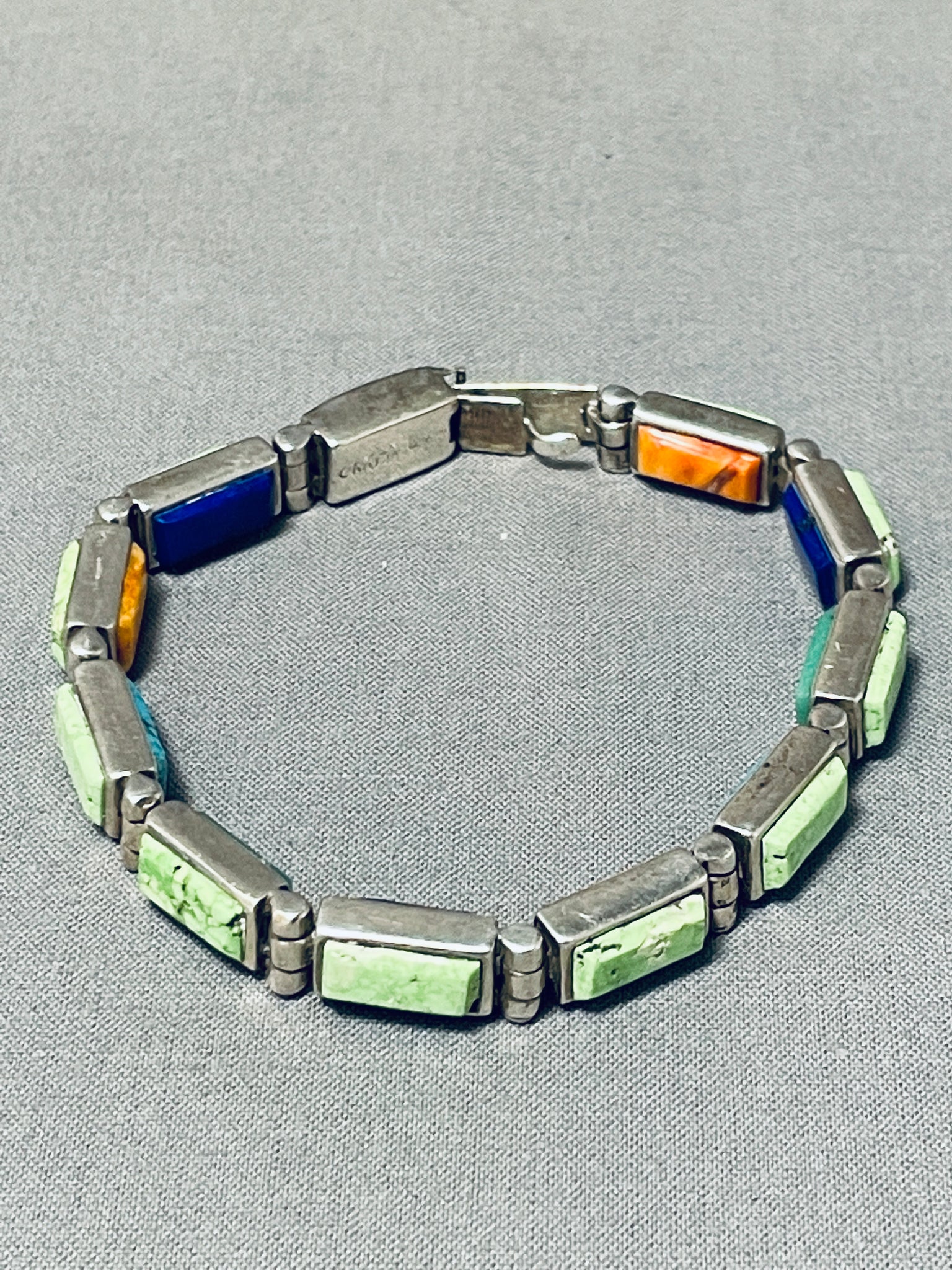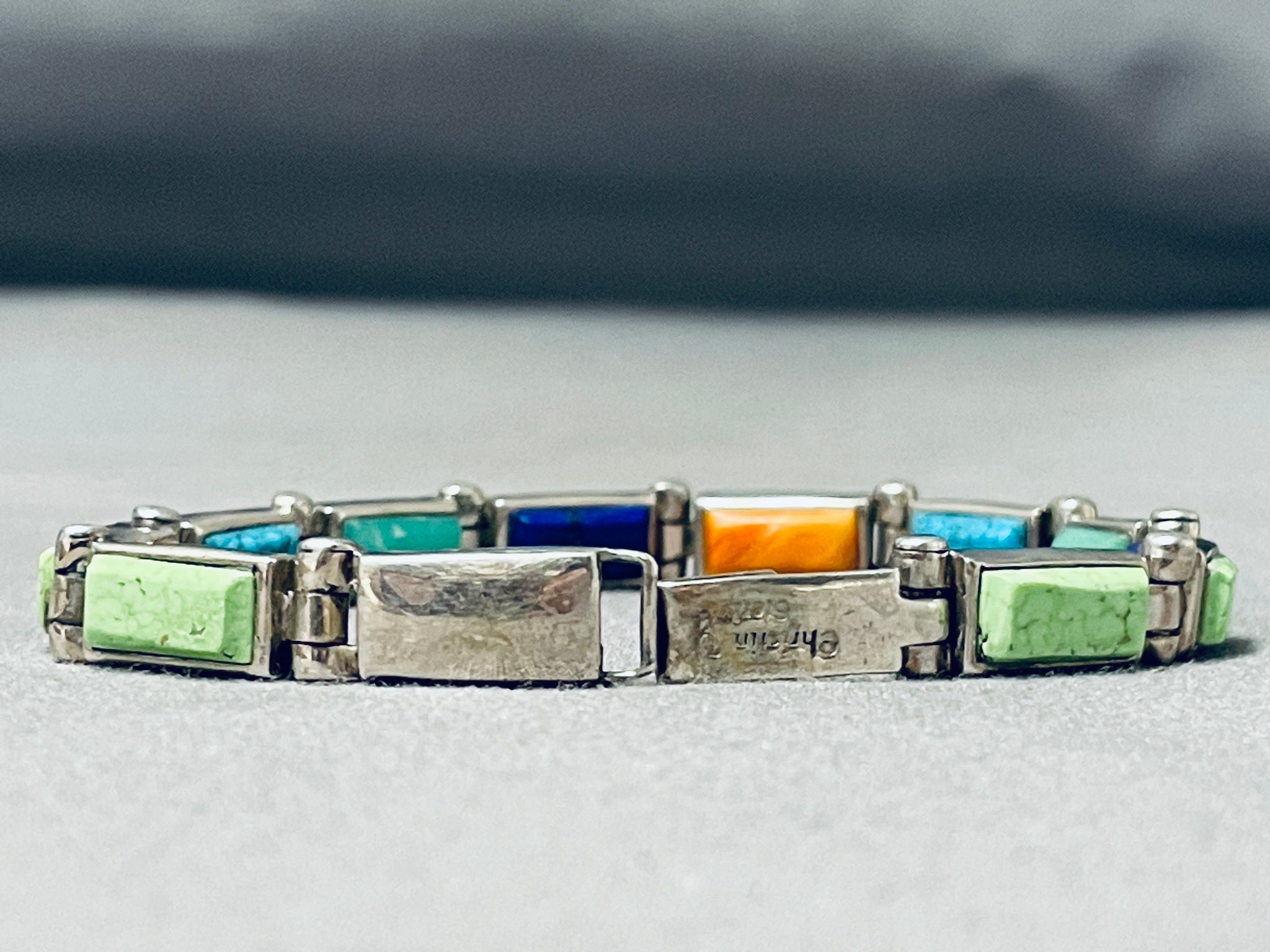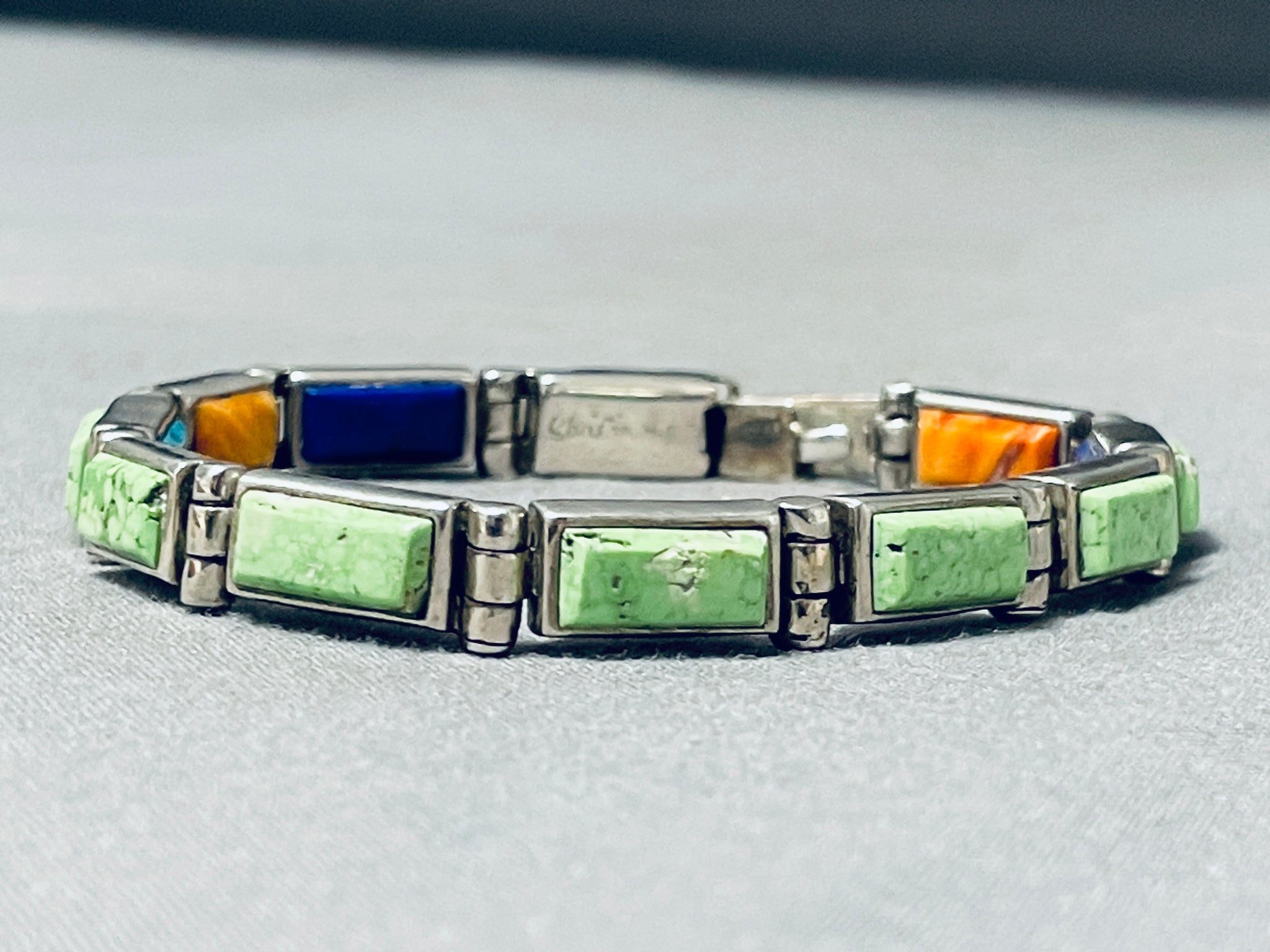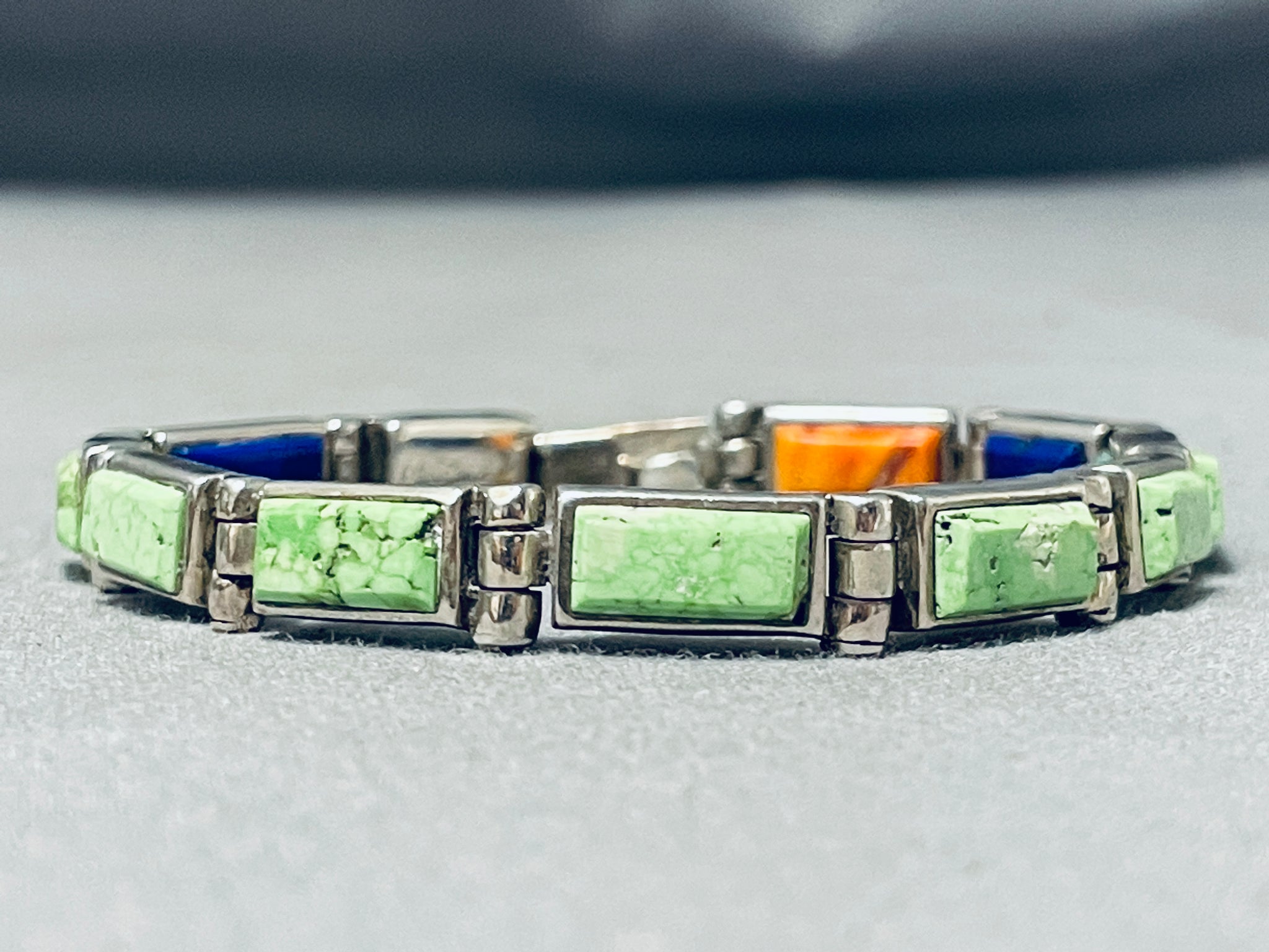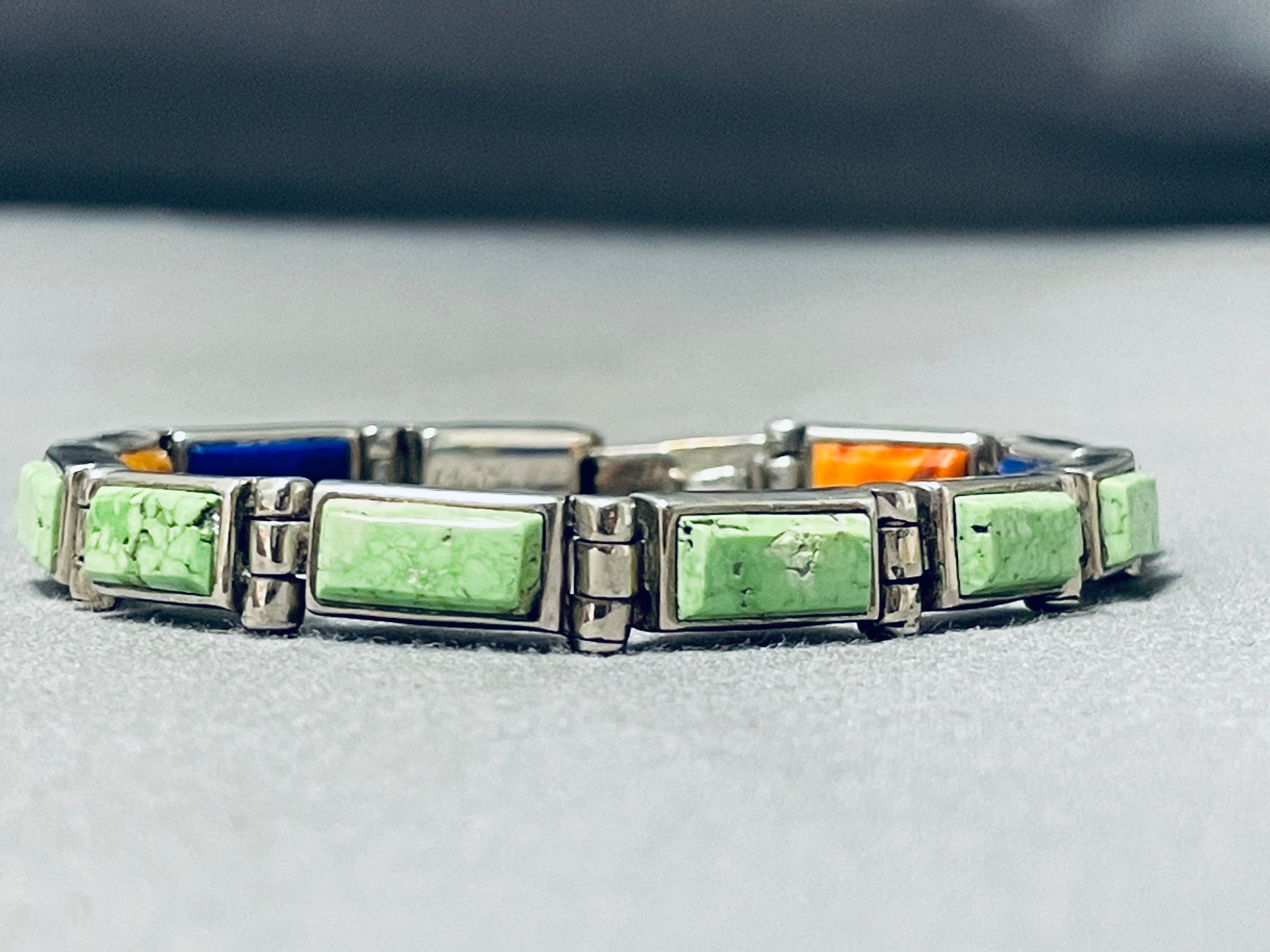 One Of Most Unique Vintage Native American Navajo Green Turquoise Sterling Silver Link Bracelet