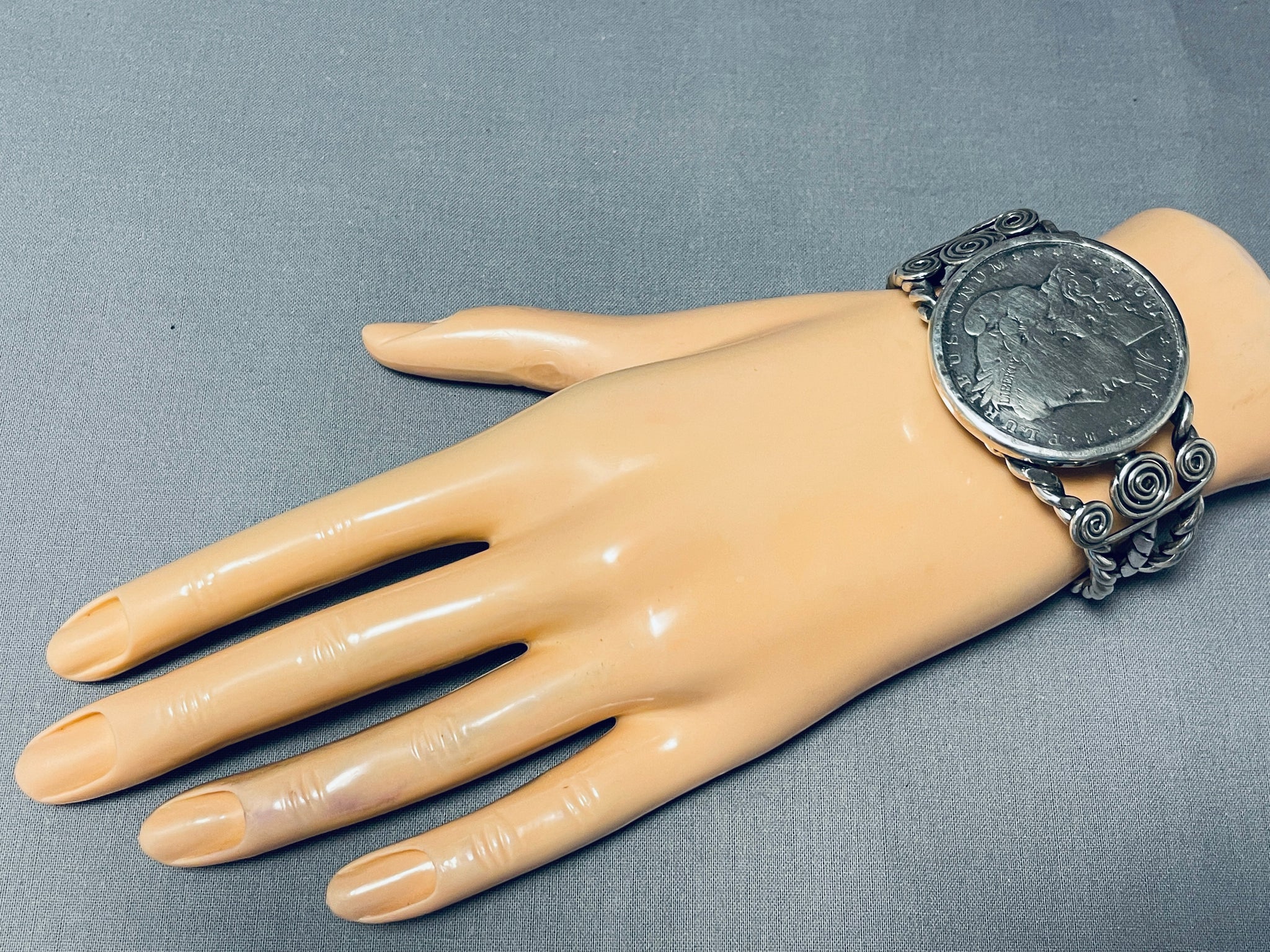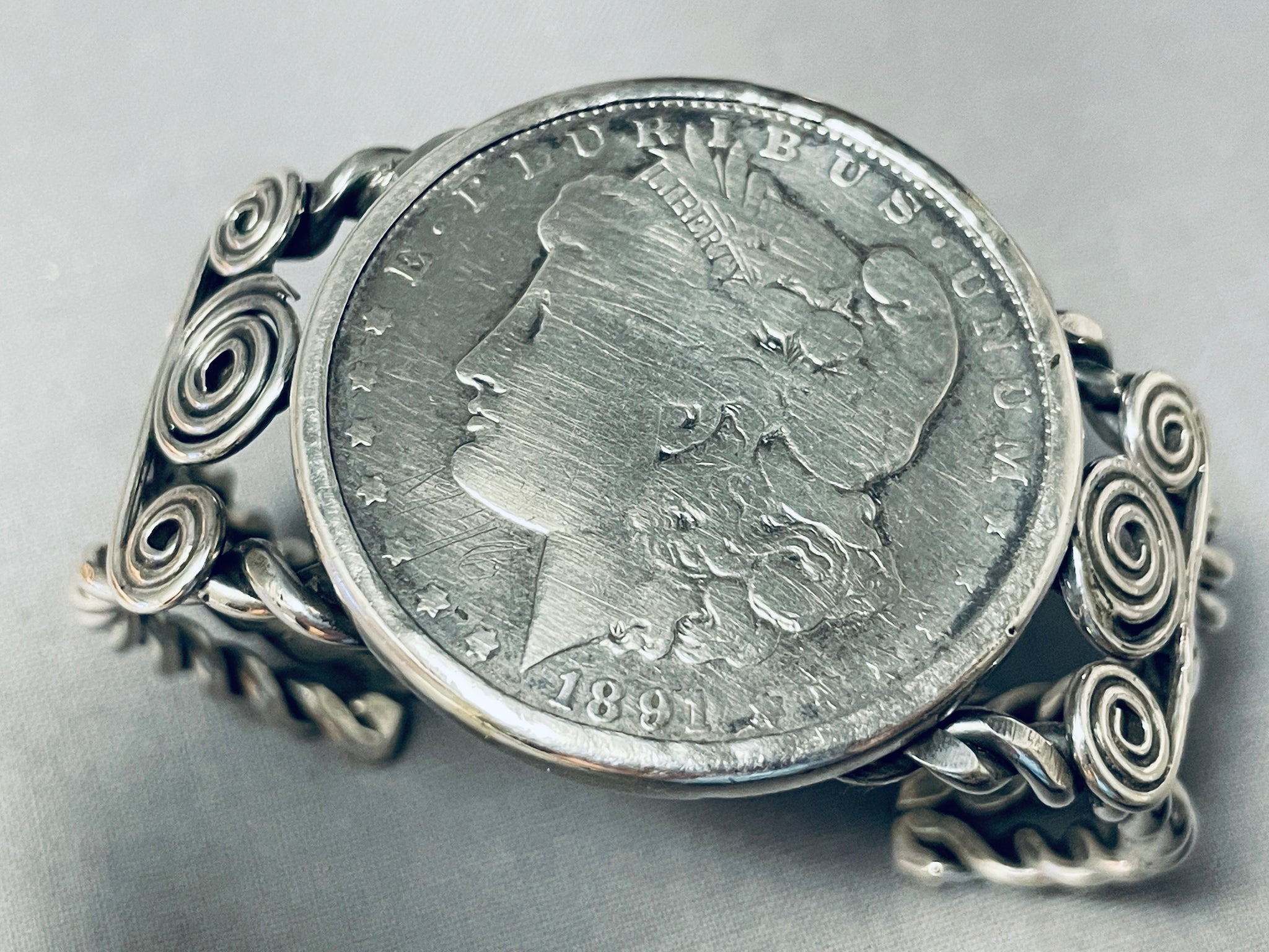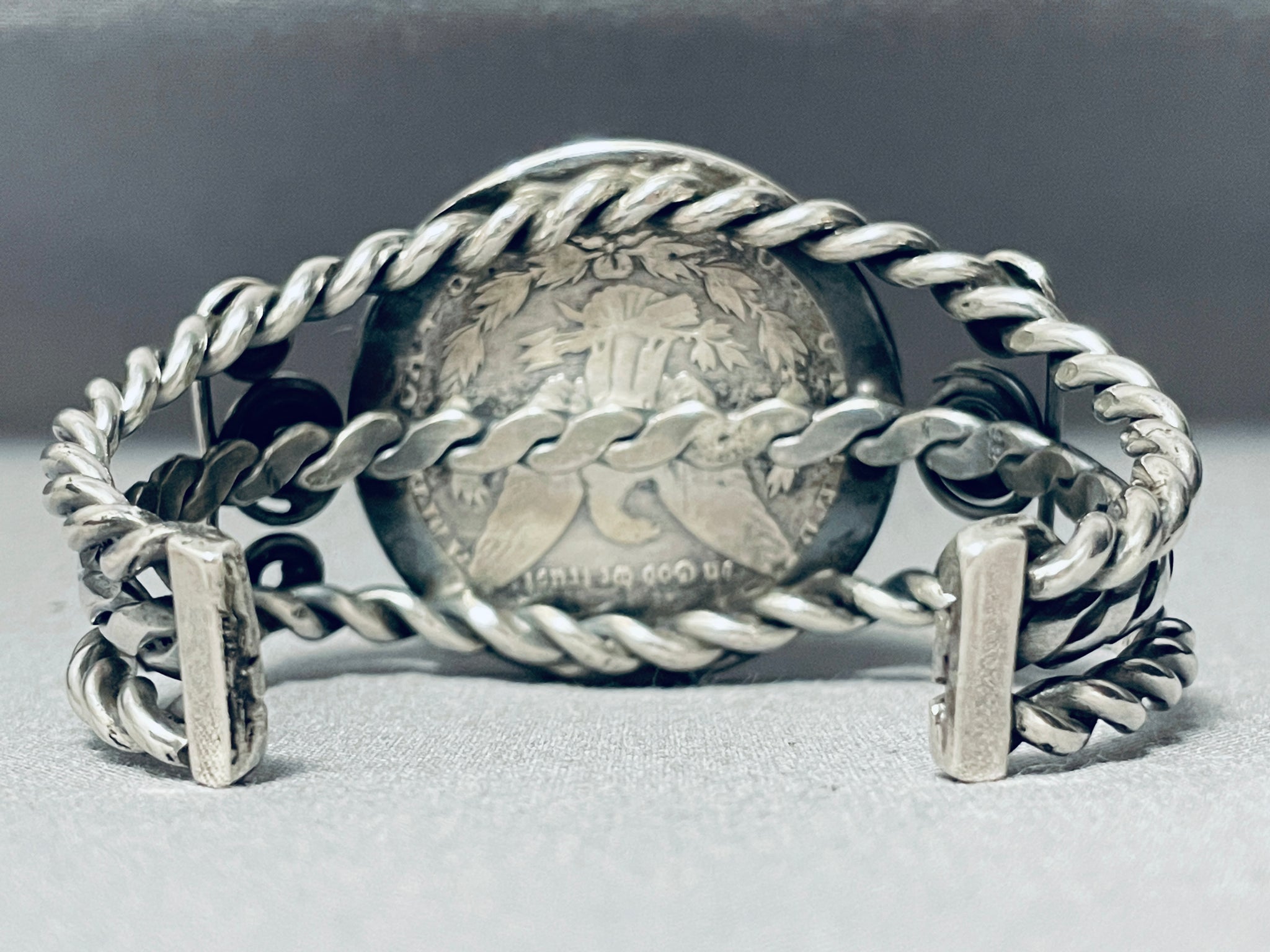 This is a breathtaking Navajo all silver center coin bracelet. This phenomenal bracelet contains a beautiful center silver dollar being from the late 1800's, absolutely amazing! The braccelet consists of a superior triple silver shank cuff that is sturdy and thick and each shank is wonderfully coiled. Resting at the sides of the cuff are beautiful coiled flanks. The intricacy of this bracelet is outstanding. The width of the bracelet measures around 1-1/2". Sterling silver. Cir. Mid century . The inside end to end measures around 5-1/4" with an additional 1-1/4" gap. Sturdy 66 grams.