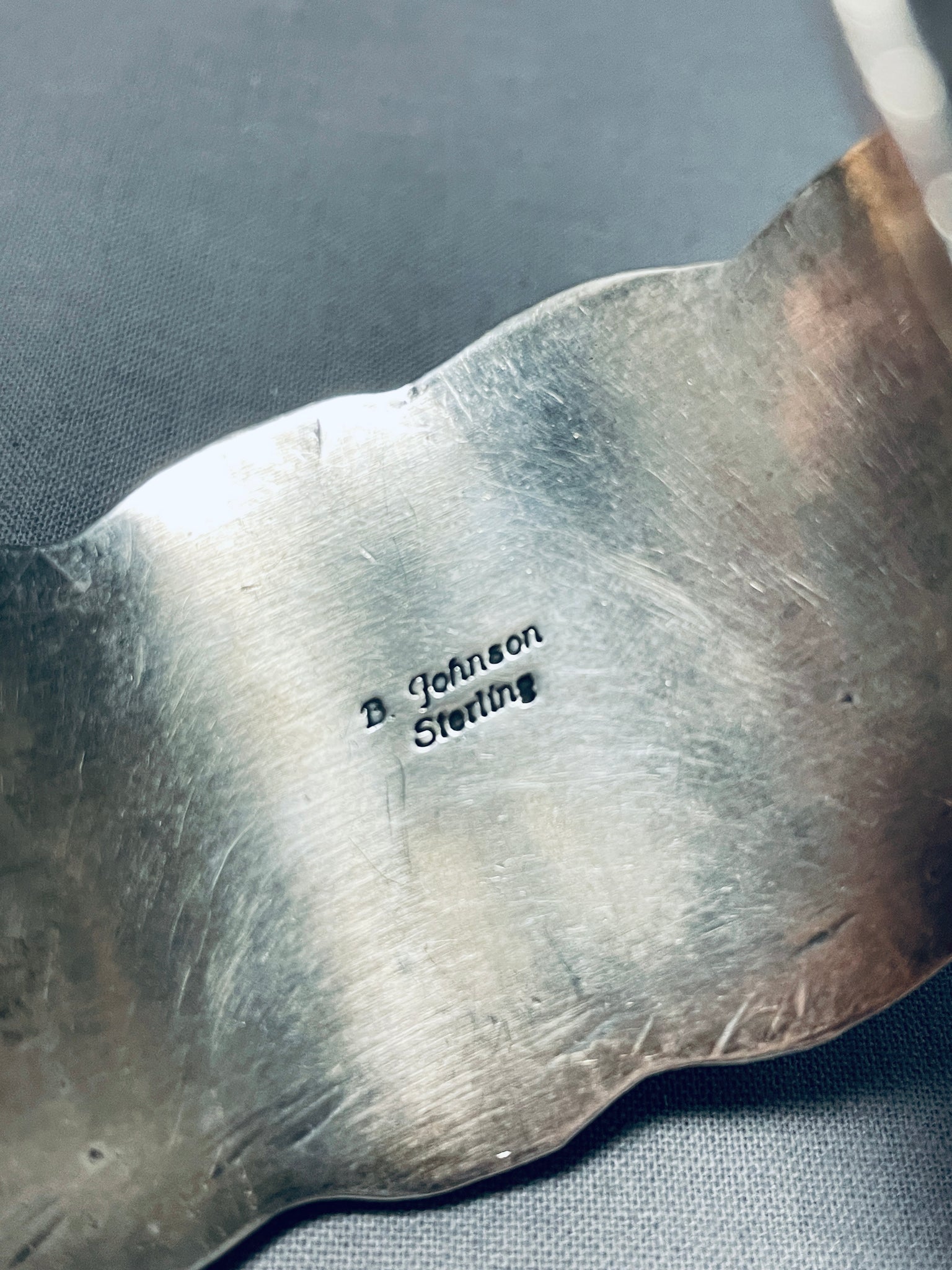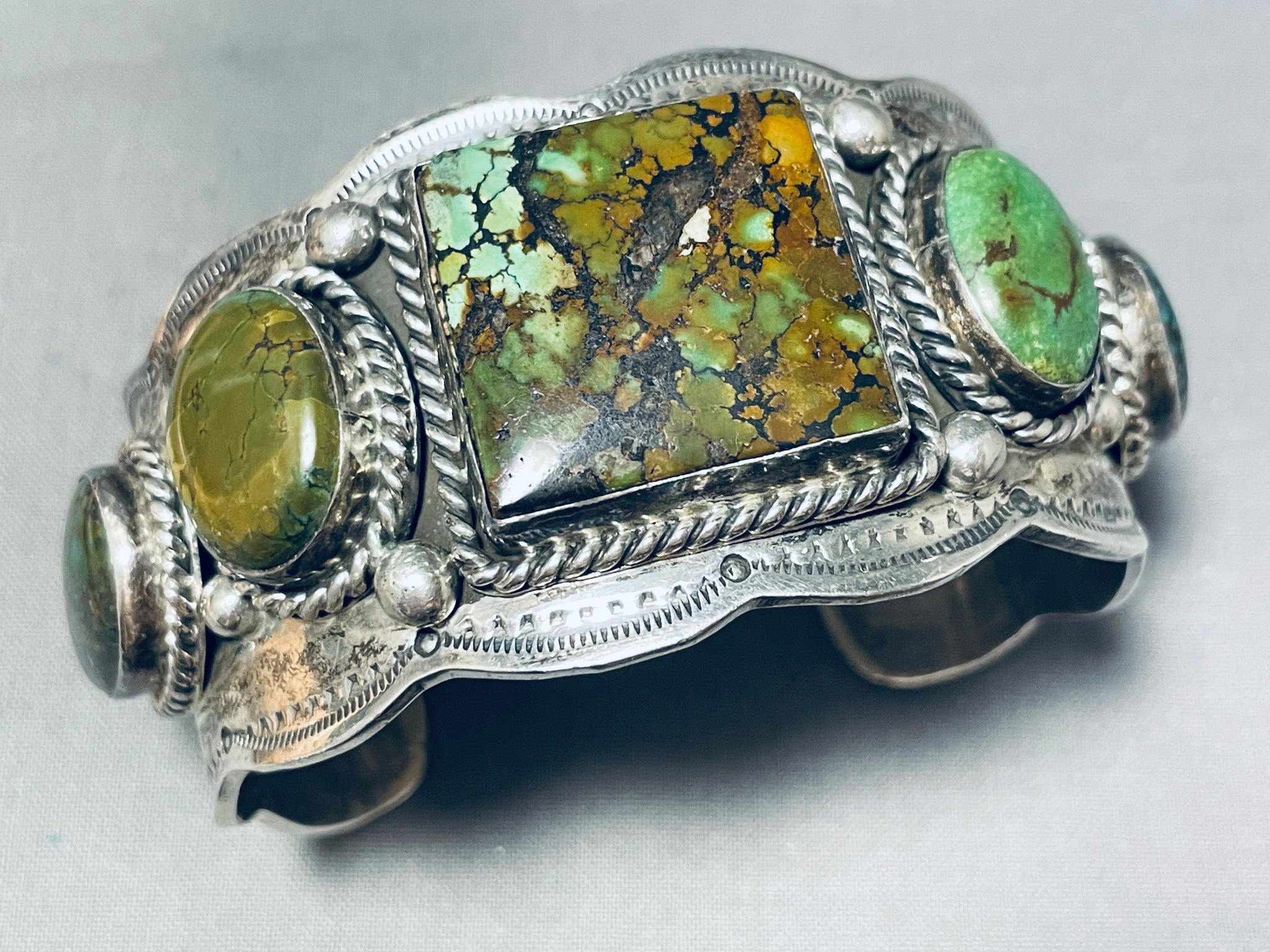 This is an impressive vintage Navajo five stone silver cuff bracelet. This remarkable bracelet contains five outstanding large chunky different shaped turquoise stones that appear to be from the amazing Royston turquoise mine. The center largest stone is square shaped with accenting oval shaped stones and teardrop shaped turquoise stones. Surrounding each stone are marvelous thick silver ropes with accenting silver raindrops. The edges of the cuff beautifully wave from one end to the other. Bordering the edges are fascinating sun stampings with accenting silver dotted works. The thickness of this bracelet is just incredible. The center stone measures around 1" x 1". The width of the bracelet measures around 1-1/2". Signed by Navajo artist, Bob Johnson. Sterling silver, marked. Cir. 1970's+. The inside end to end measures around 5-3/4" with an additional 1-1/4" gap. Sturdy 123 grams.