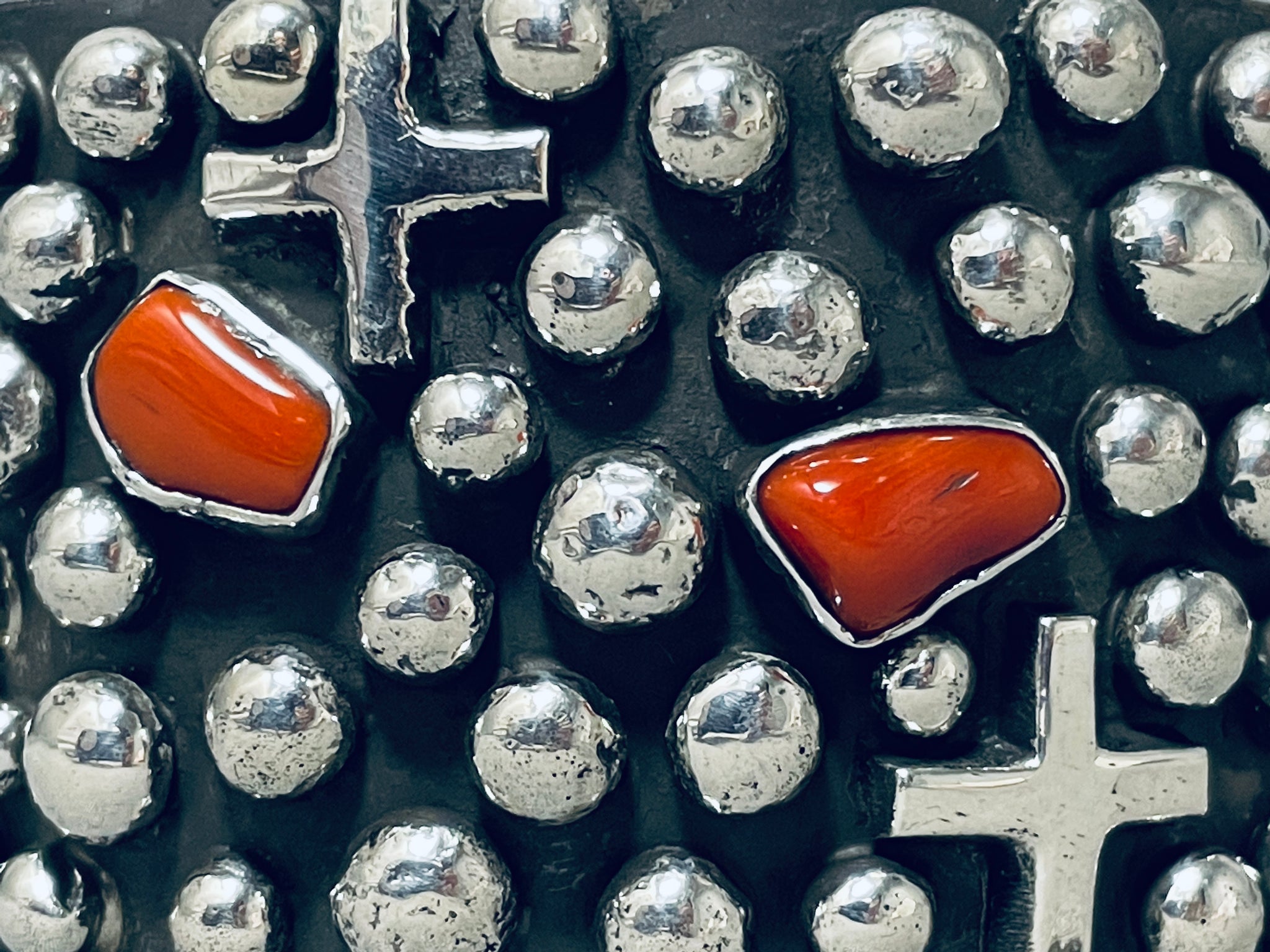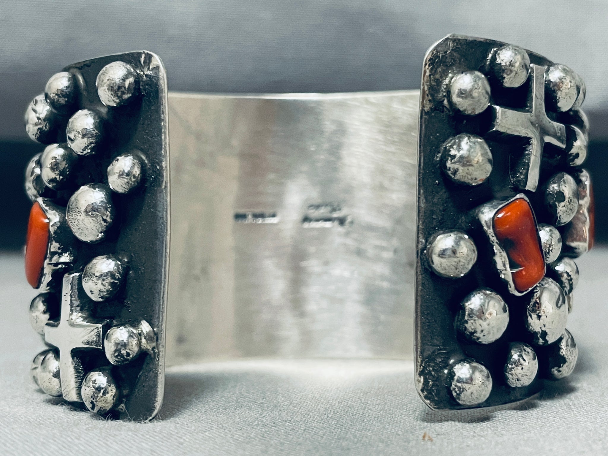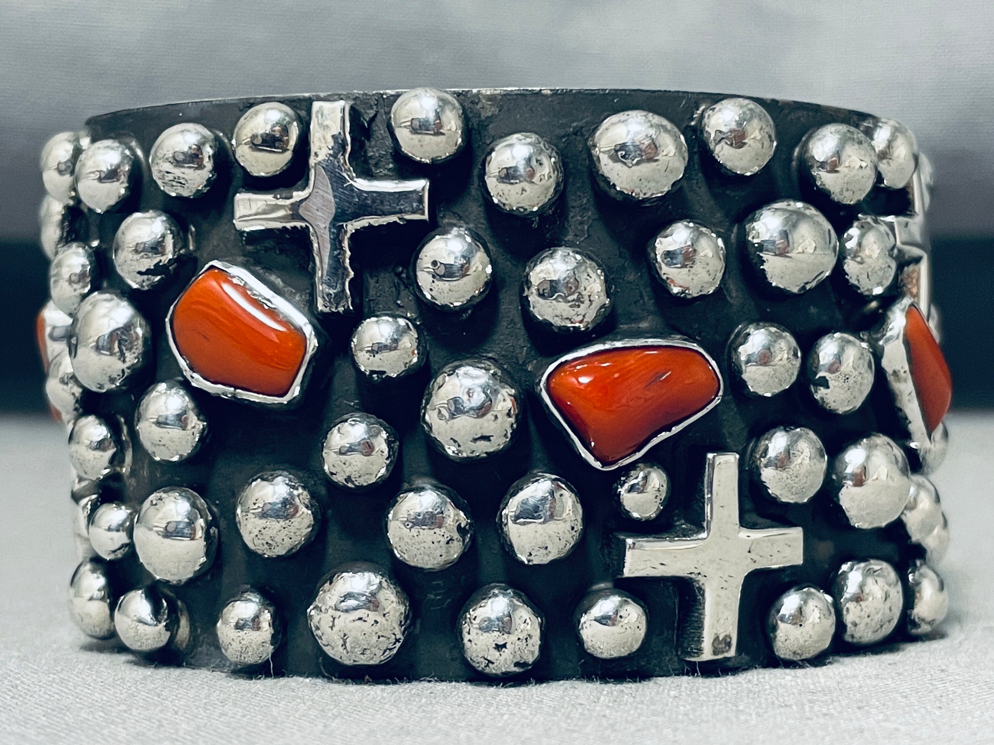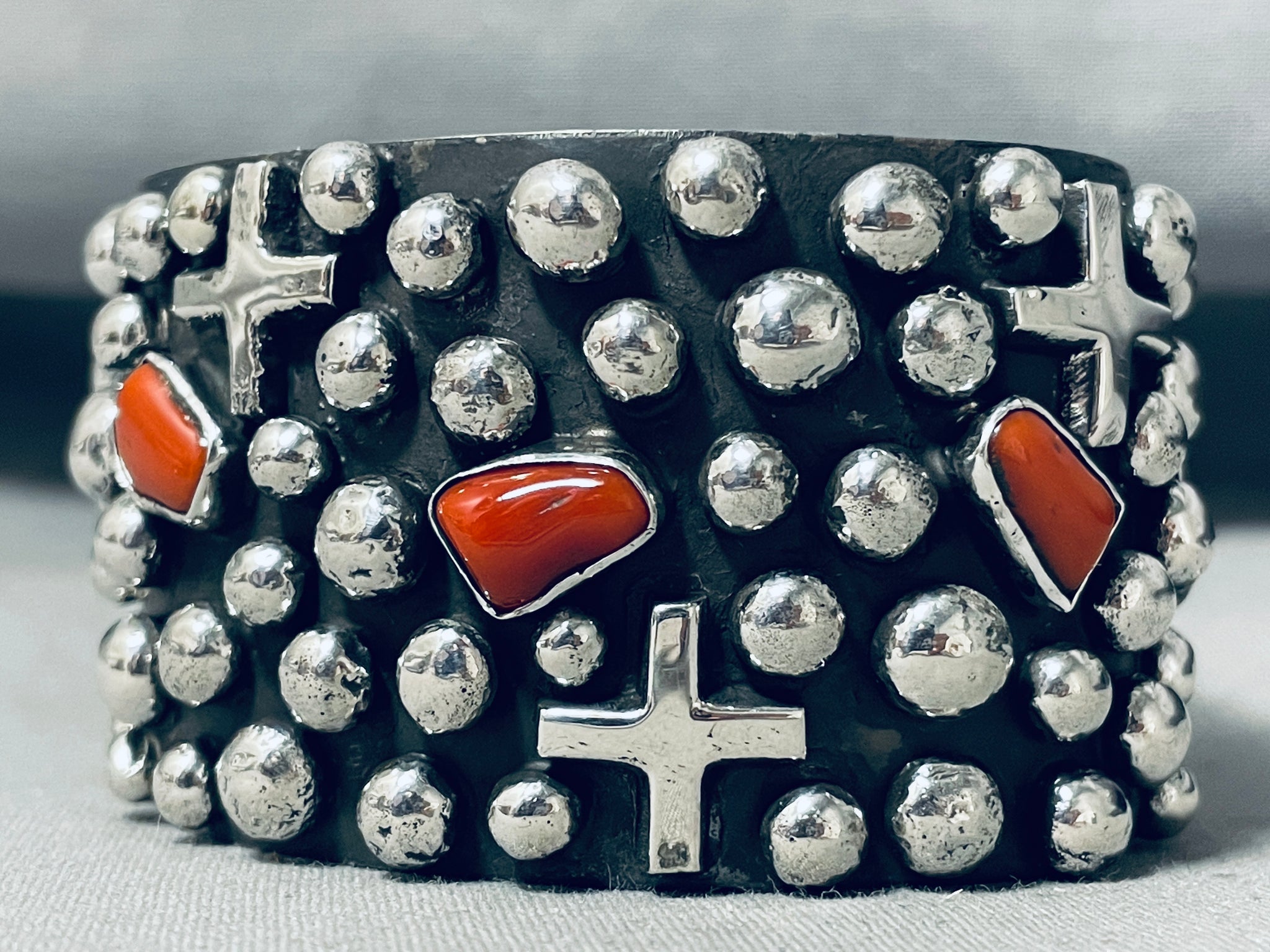One Of The Best Ever Native American Navajo Coral Cross Sterling Silver Bracelet