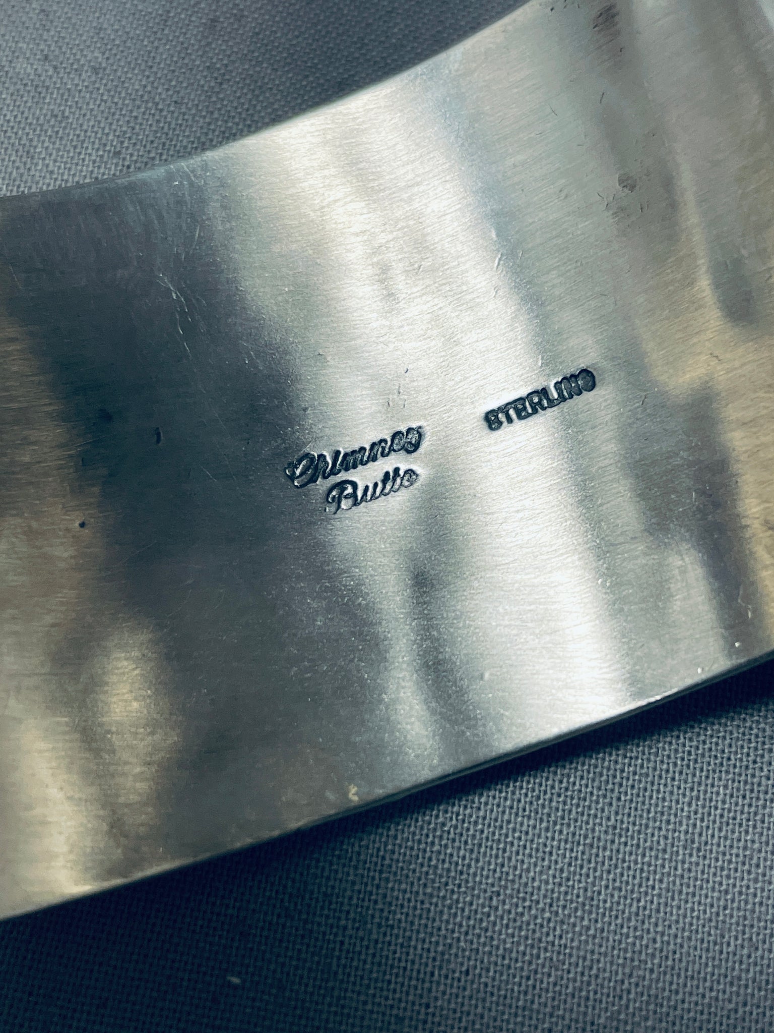 This is a magnificent Navajo very wide cuff coral silver bracelet. This bracelet is amazing and consists of a sturdy and thick wide silver cuff. Located throughout the cuff are 6 beautiful chunky coral stones. Accenting the entire cuff are superior handmade large graduating silver raindrops with accenting silver cross patterns. I absolutely love the detailing on this coral bracelet. The stones measure around 3/8" x 1/4". The width of the bracelet measures around 1-1/2". Signed by Navajo artist, Chim Butte. Sterling silver, marked. The inside end to end measures around 5-1/2" with an additional 1" gap. Sturdy 101 grams.