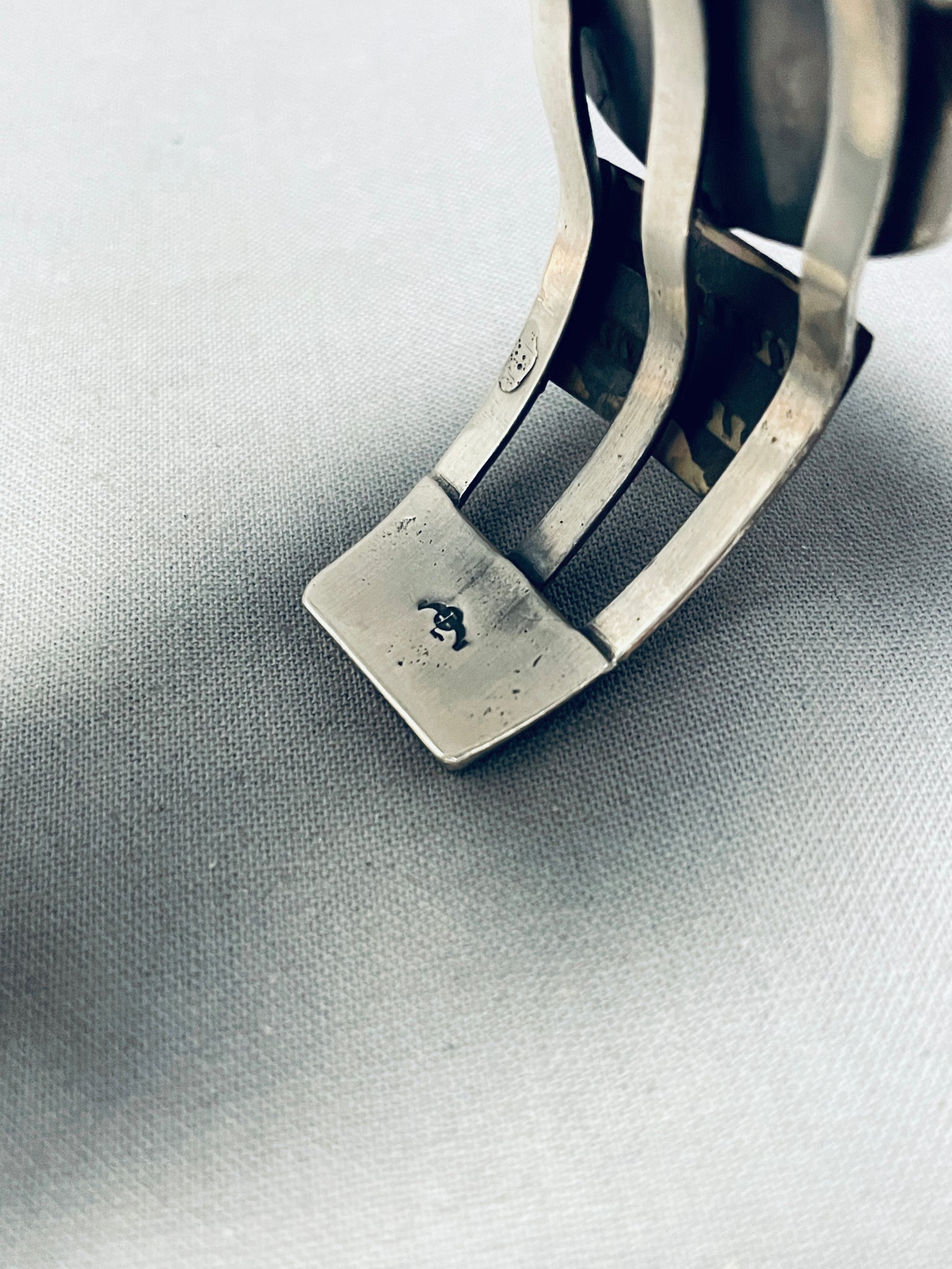 This is an exceptional vintage Navajo chunky turquoise silver bracelet handmade in the very famous Navajo Guild. The Navajo Guild is where a lot of famous Navajo artists learned to make jewelry. This spectacular bracelet contains 5 outstanding large graduating chunky spiderweb turquoise stone that appear to be from the impeccable Carico Lake turquoise mine. Surrounding each stone are fascinating silver ropes and large silver raindrops. This bracelet includes a superior thick and sturdy triple silver shank cuff with end tiered silver flanks. The center stone measures around 1-3/8" x 7/8". The width of the bracelet measures around 1-1/2". Signed by Navajo artist, (Navajo Guild). Sterling silver, marked. Cir. 1970's+. The inside end to end measures around 6-3/4" with an additional 1" gap. Sturdy 96 grams.