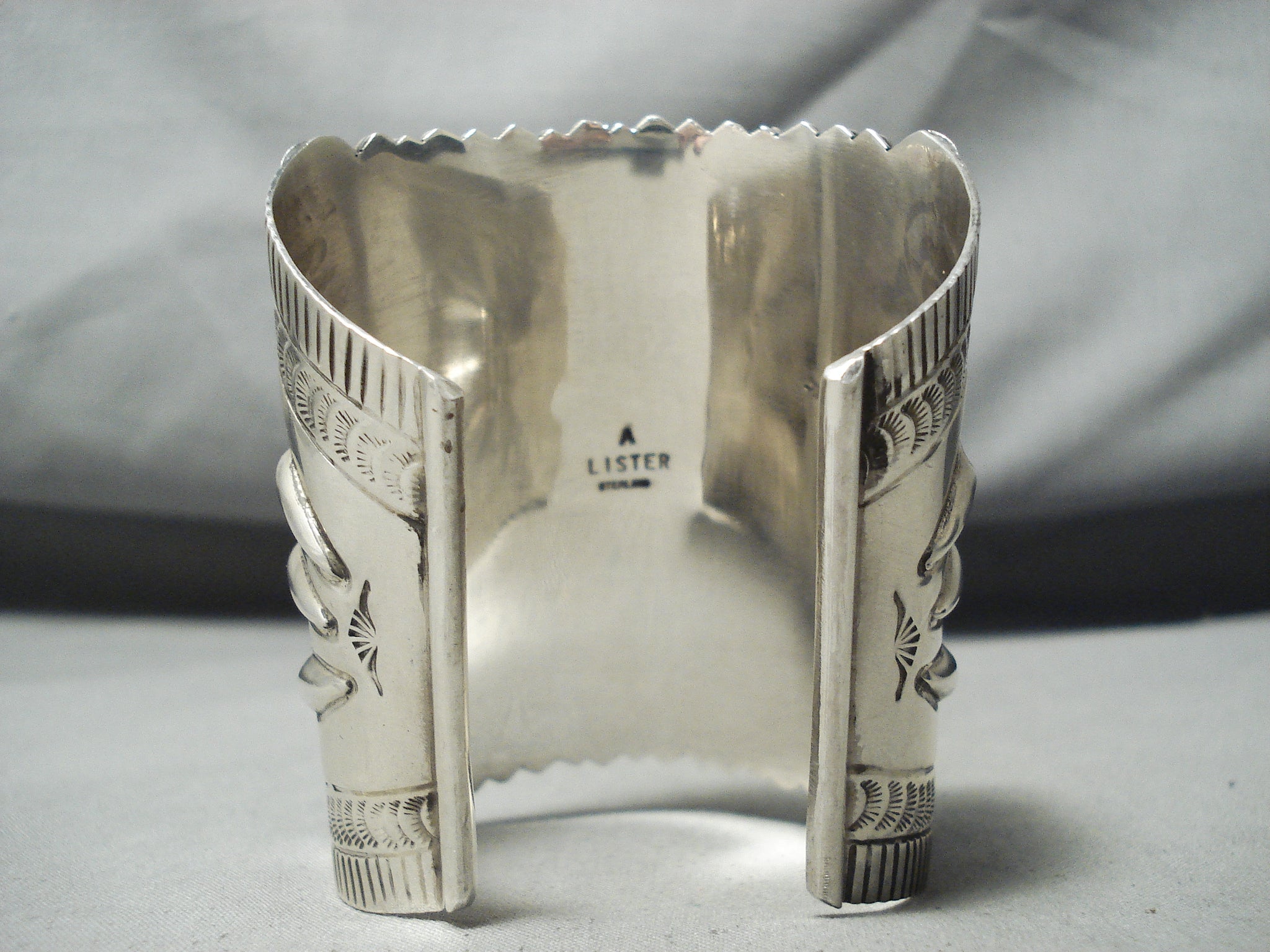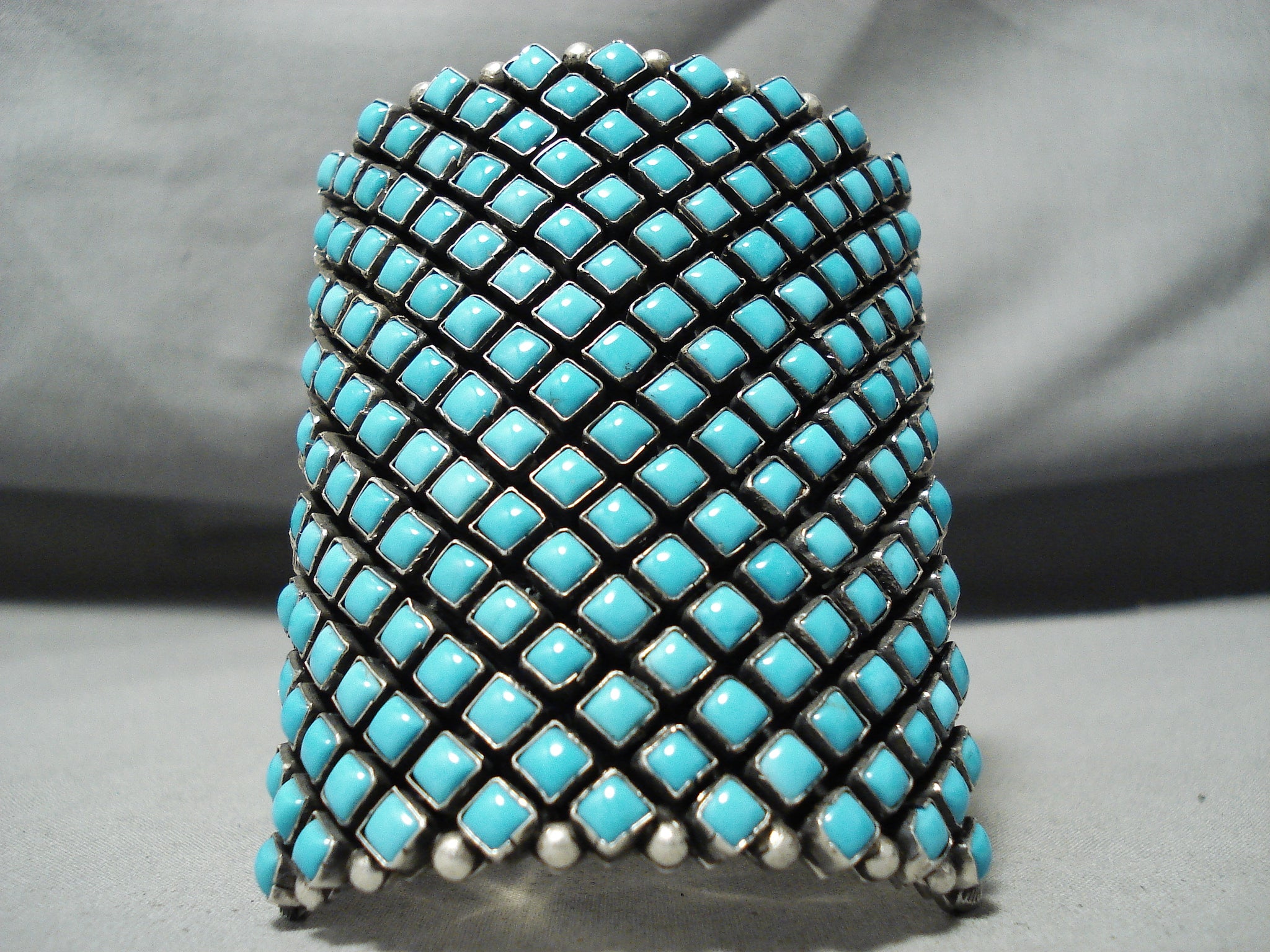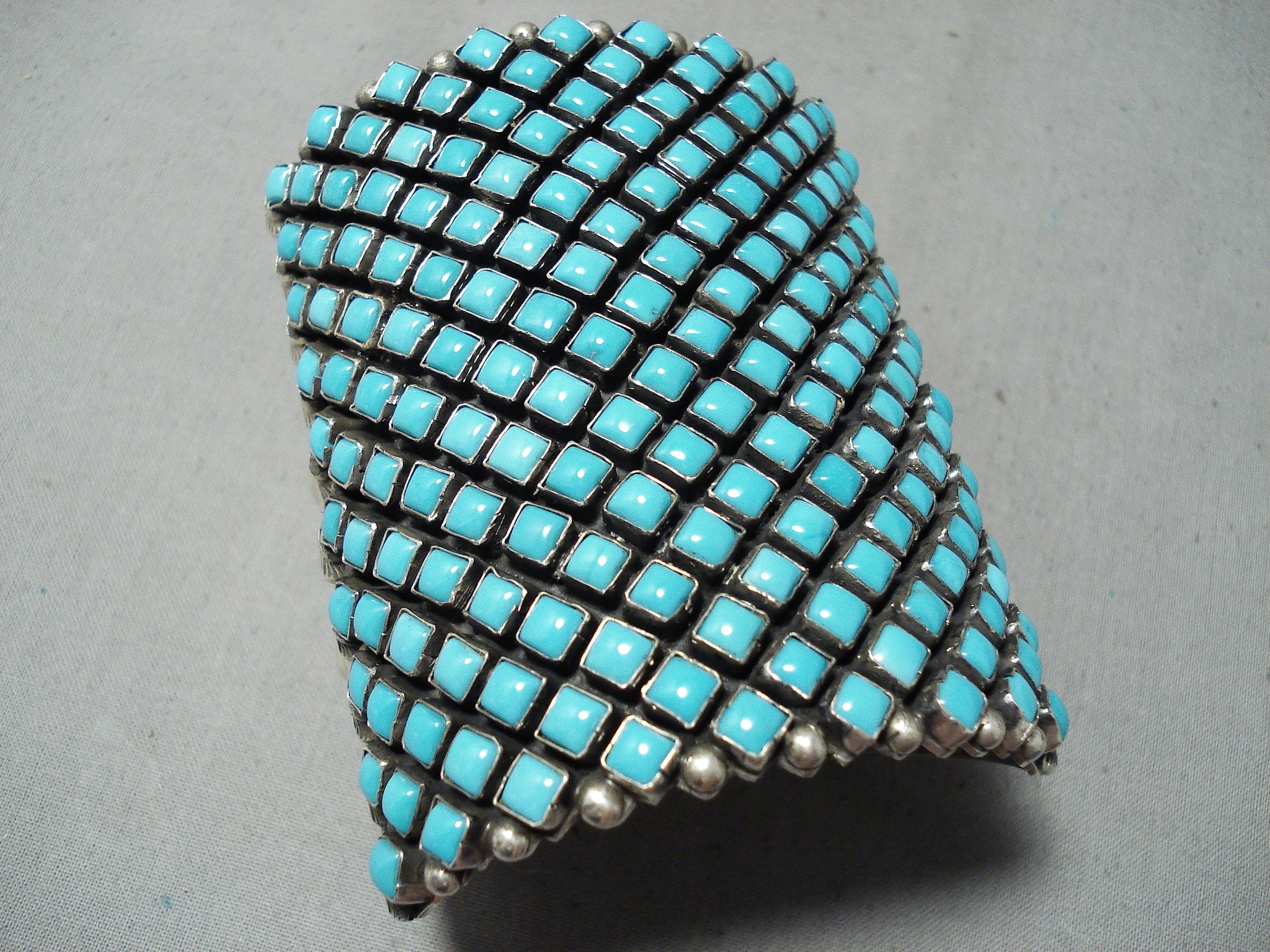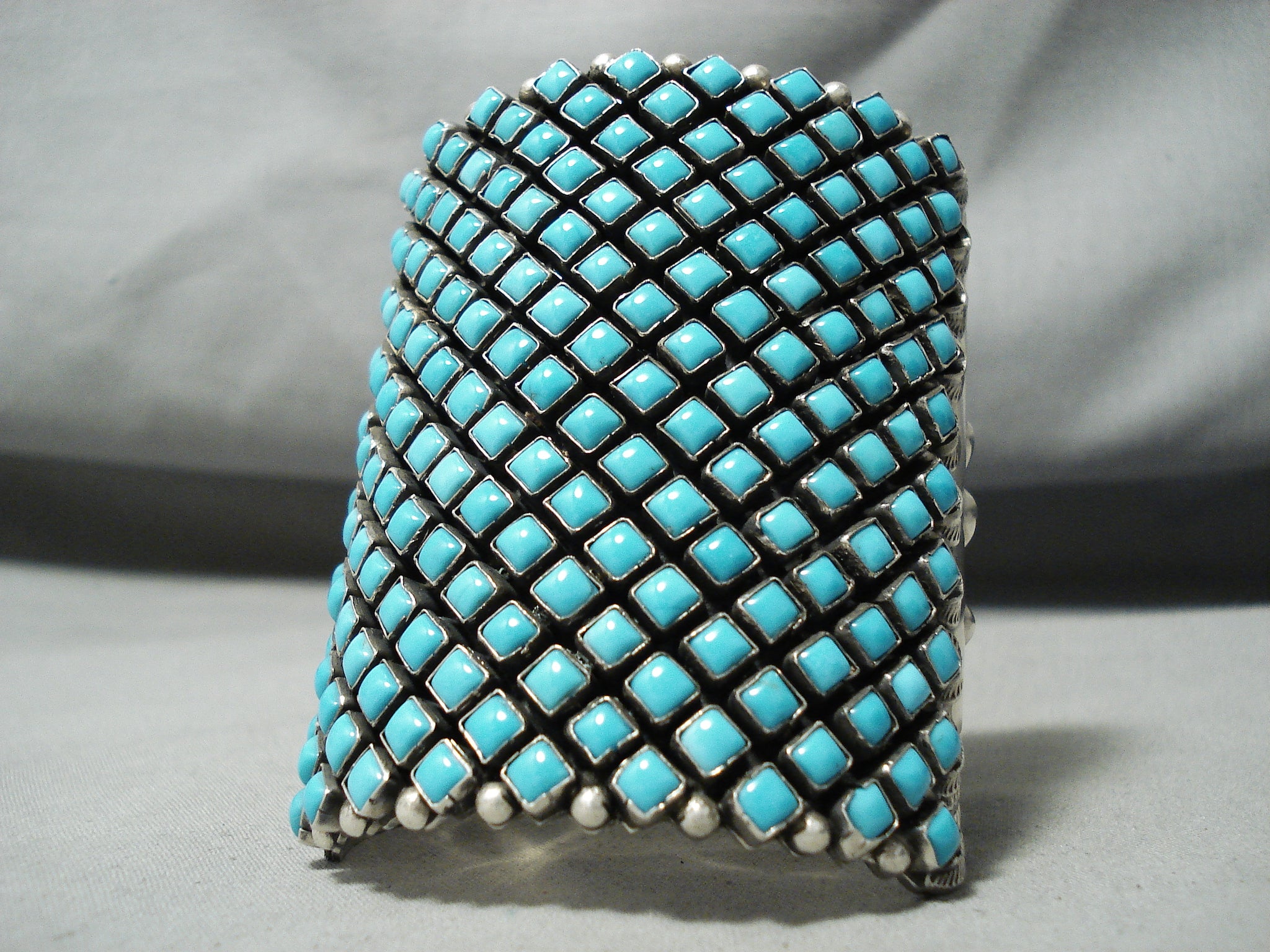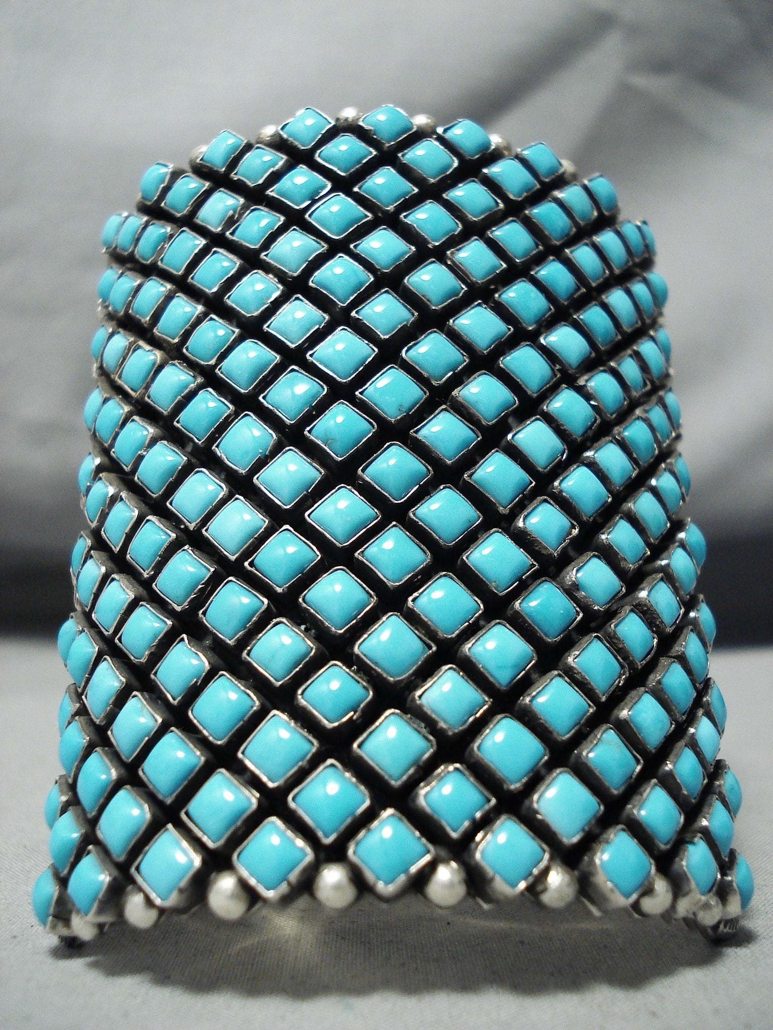 This is a tremendous vintage Navajo turquoise very tall silver bracelet handmade by the very famous artist, Alice Lister. This bracelet contains a mind blowing plethora of diamond shaped turquoise stones that are completely hand cut. Surrounding the stones on the edges are amazing silver raindrops and shells. Located at the ends of the sturdy and thick silver cuff are remarkable silver channel works, sun stampings, line segments and repoussed shells. The stones measure around 3/8" x 3/8". The width of the bracelet measures around 3". Signed by Navajo artist, Alice Lister . Sterling silver, marked.. The inside end to end measures around 5-1/2" with an additional 1" gap. Sturdy 147 grams.
