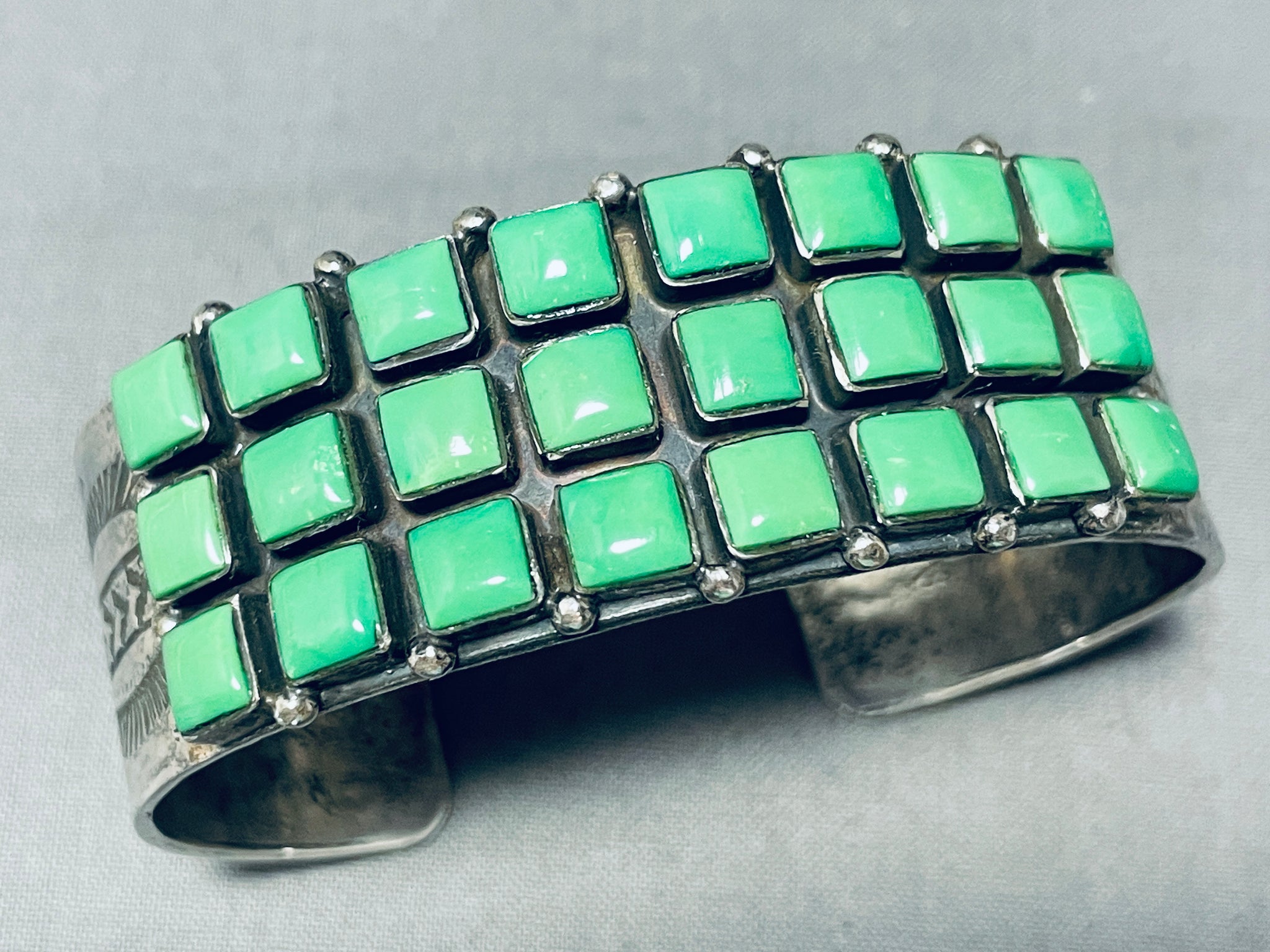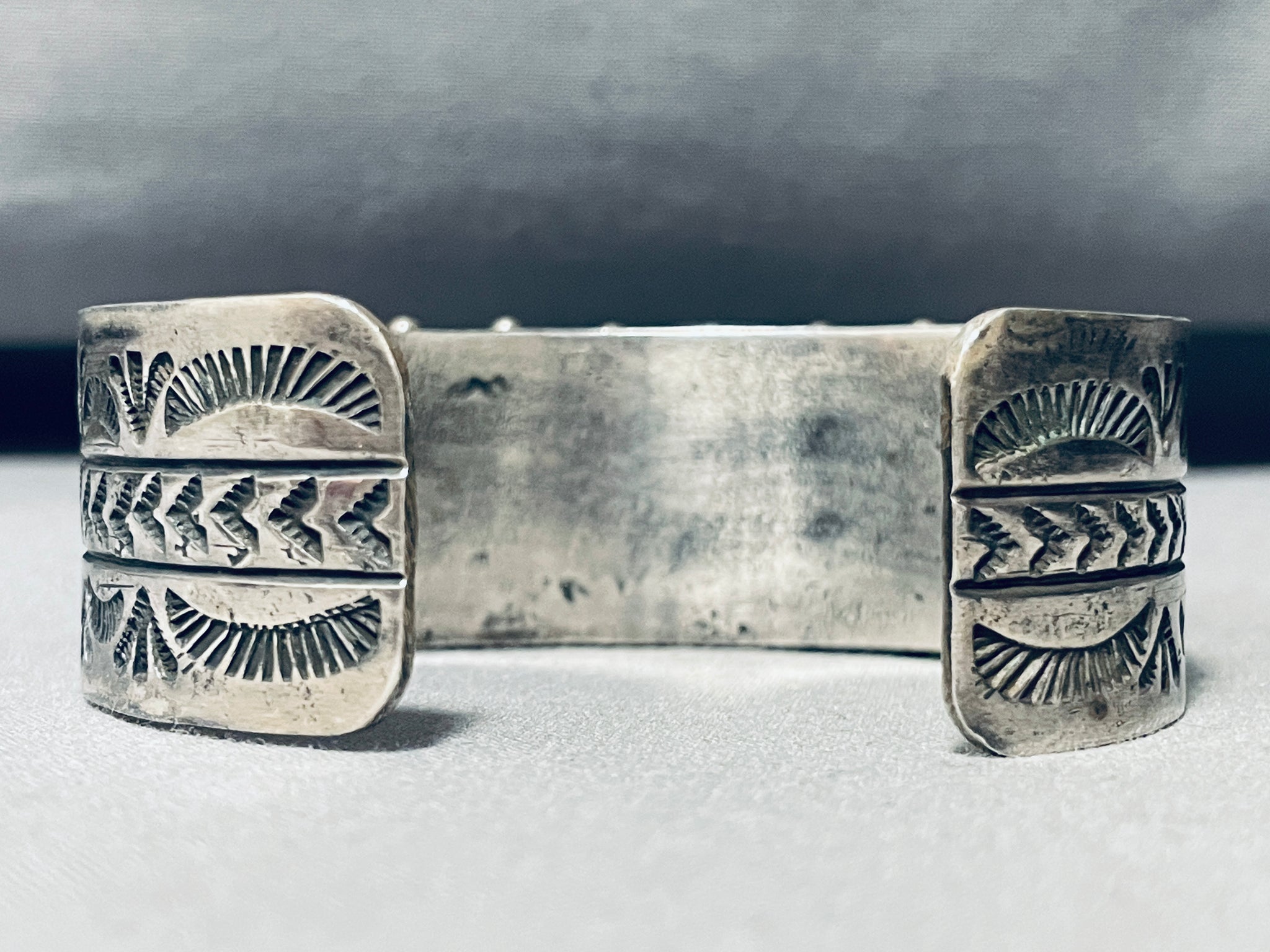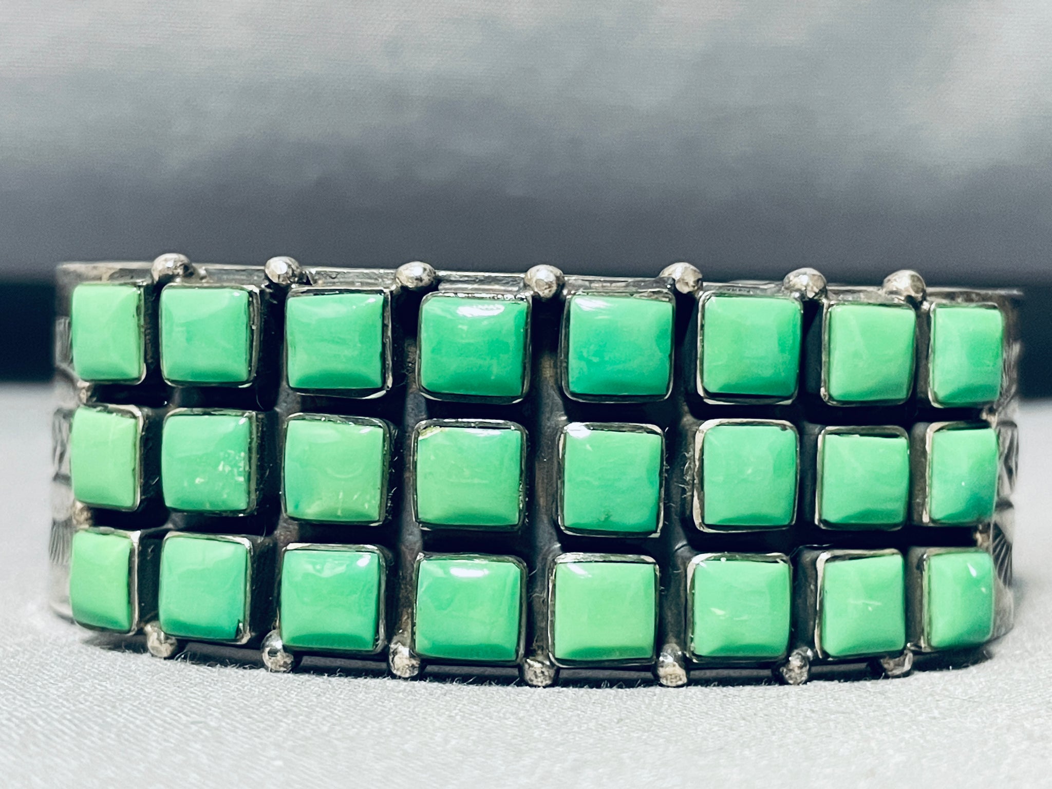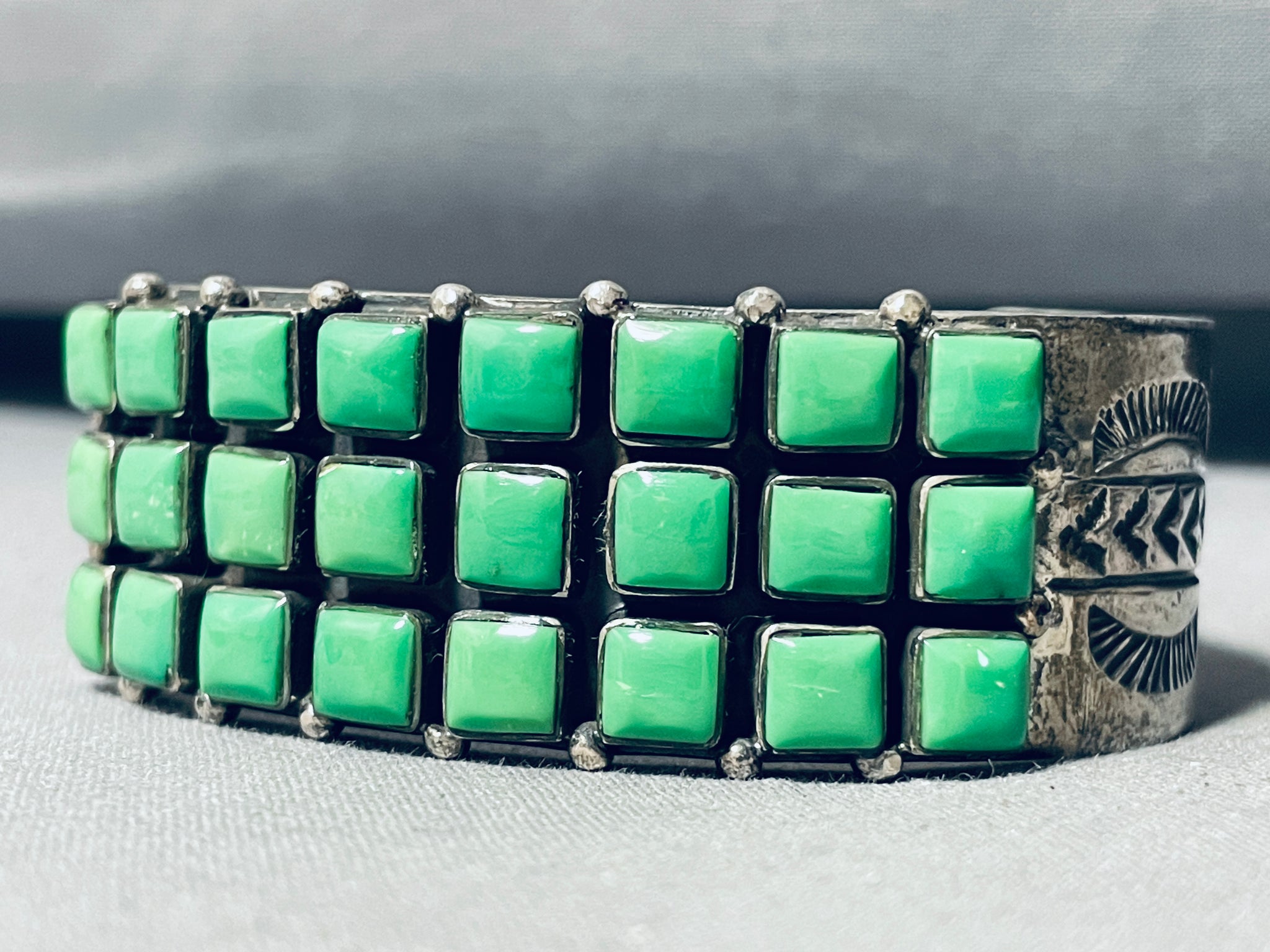 This is an incredible vintage Navajo three row stone silver cuff bracelet. This impressive bracelet contains three beautiful rows of hand cut square shaped vibrant green colored stones. Surrounding the edges of the outer stones are silver raindrops. Running down the ends of the wide thick and sturdy silver cuff are amazing stamp works that consist of sun works, teepee patterns and line segments. The stones measure around 1/4" x 1/4". The width of the bracelet measures around 7/8". Sterling silver. Cir. Mid century . The inside end to end measures around 5-3/4" with an additional 1" gap. Sturdy 59 grams.