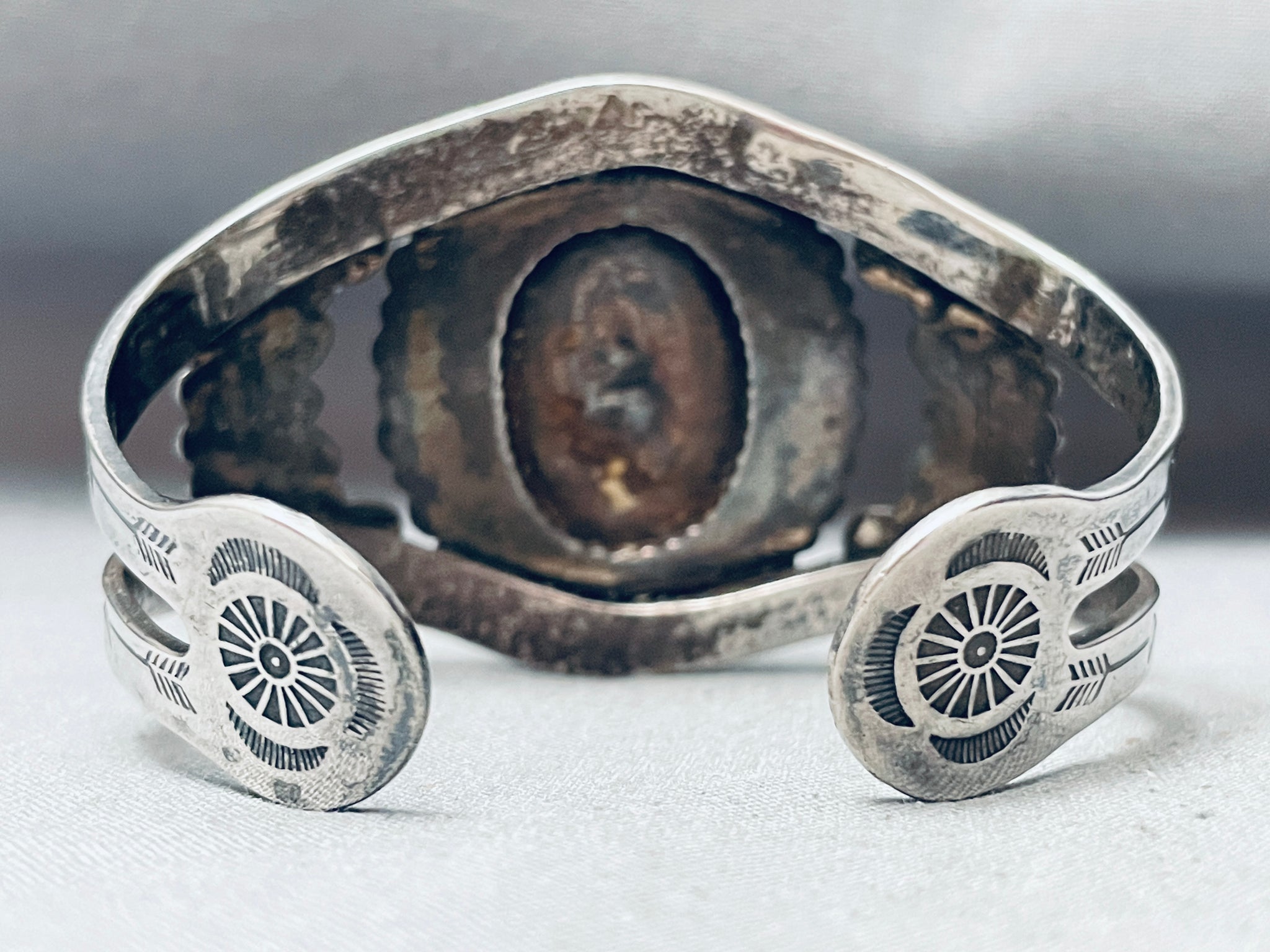 This is a superlative vintage Navajo large single stone silver bracelet. This fascinating bracelet contains a large dome shaped spiderweb turquoise stone that appears to be from the beautiful Red Mountain turquoise mine. Surrounding the stone are impeccable silver works that consist of wave works, ropes and raindrops. Resting at the sides of the bracelet are marvelous silver fan flanks. Running down the ends of the double silver shank cuff are amazing corn plants with accenting arrows and sun stampings. Such a wonderful bracelet. The center stone measures around 1-1/4" x 1". The width of the bracelet measures around 1-5/8". Sterling silver. Cir. Mid century . The inside end to end measures around 5-1/2" with an additional 3/4" gap. Sturdy 49 grams.