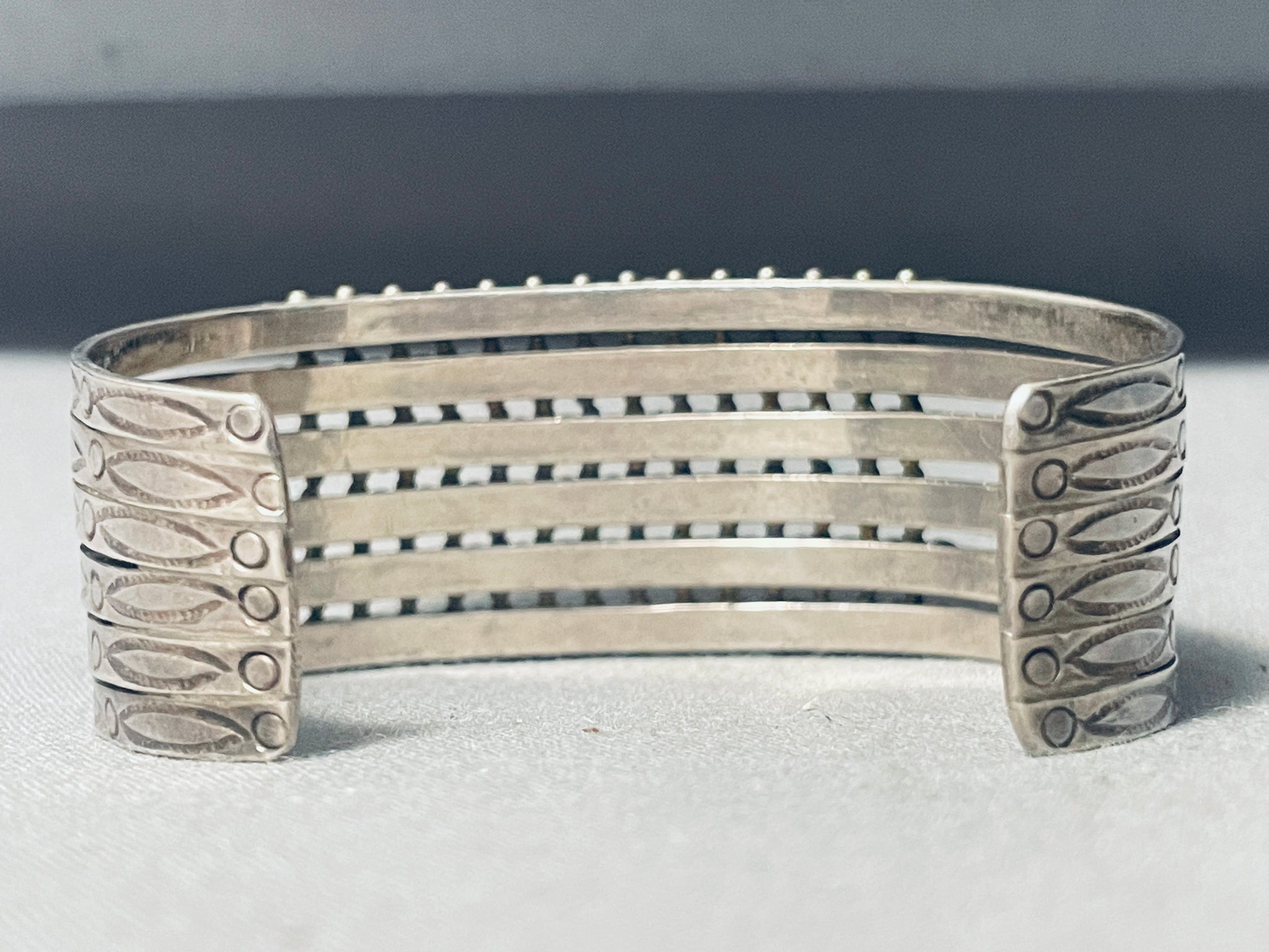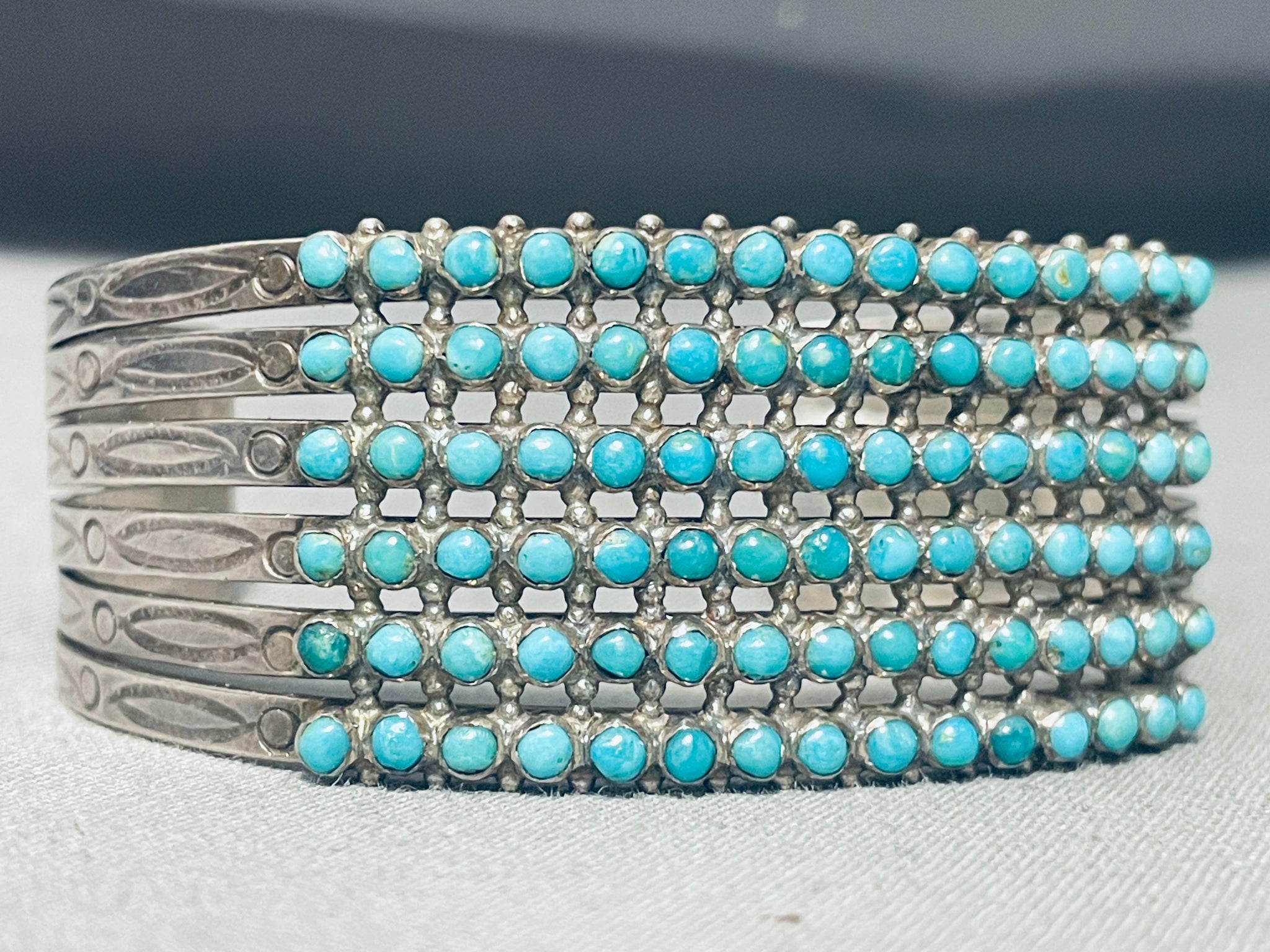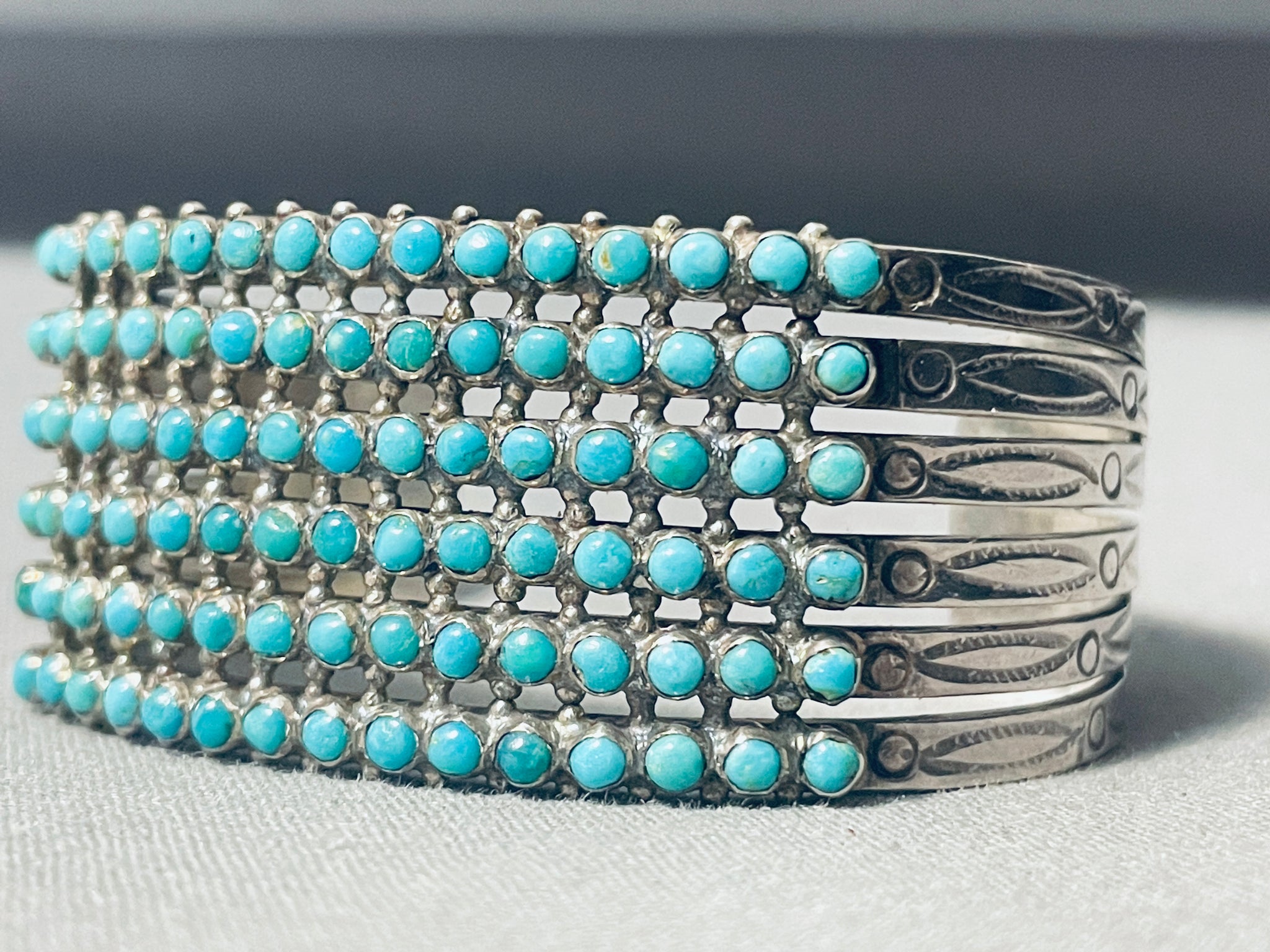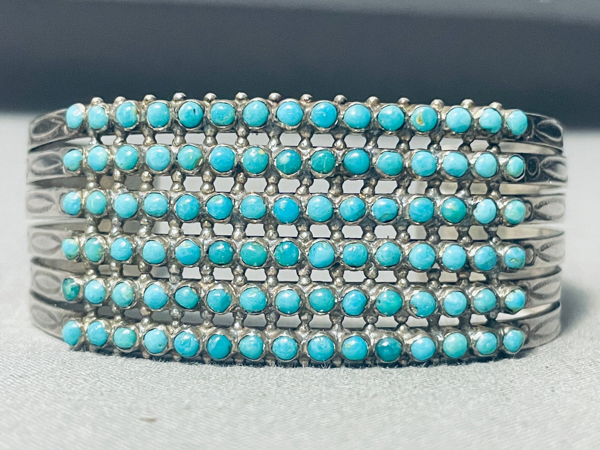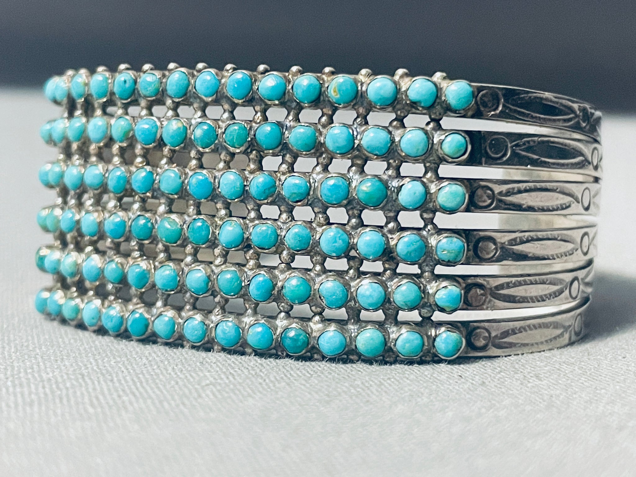 This is a superior vintage Zuni multiple turquoise stone silver cuff bracelet. This remarkable bracelet contains 6 amazing rows of fascinating snake eye shaped turquoise stones, a total of 90 beautiful stones. Situated throughout all of the stones are marvelous silver raindrops. This bracelet contains a fabulous sturdy 6 silver shank cuff with outstanding cloud and dotted stampings running down both ends. The width of the bracelet measures around 7/8". Sterling silver. Cir. Mid century . The inside end to end measures around 4-3/4" with an additional 1-1/4" gap. Sturdy 31 grams.