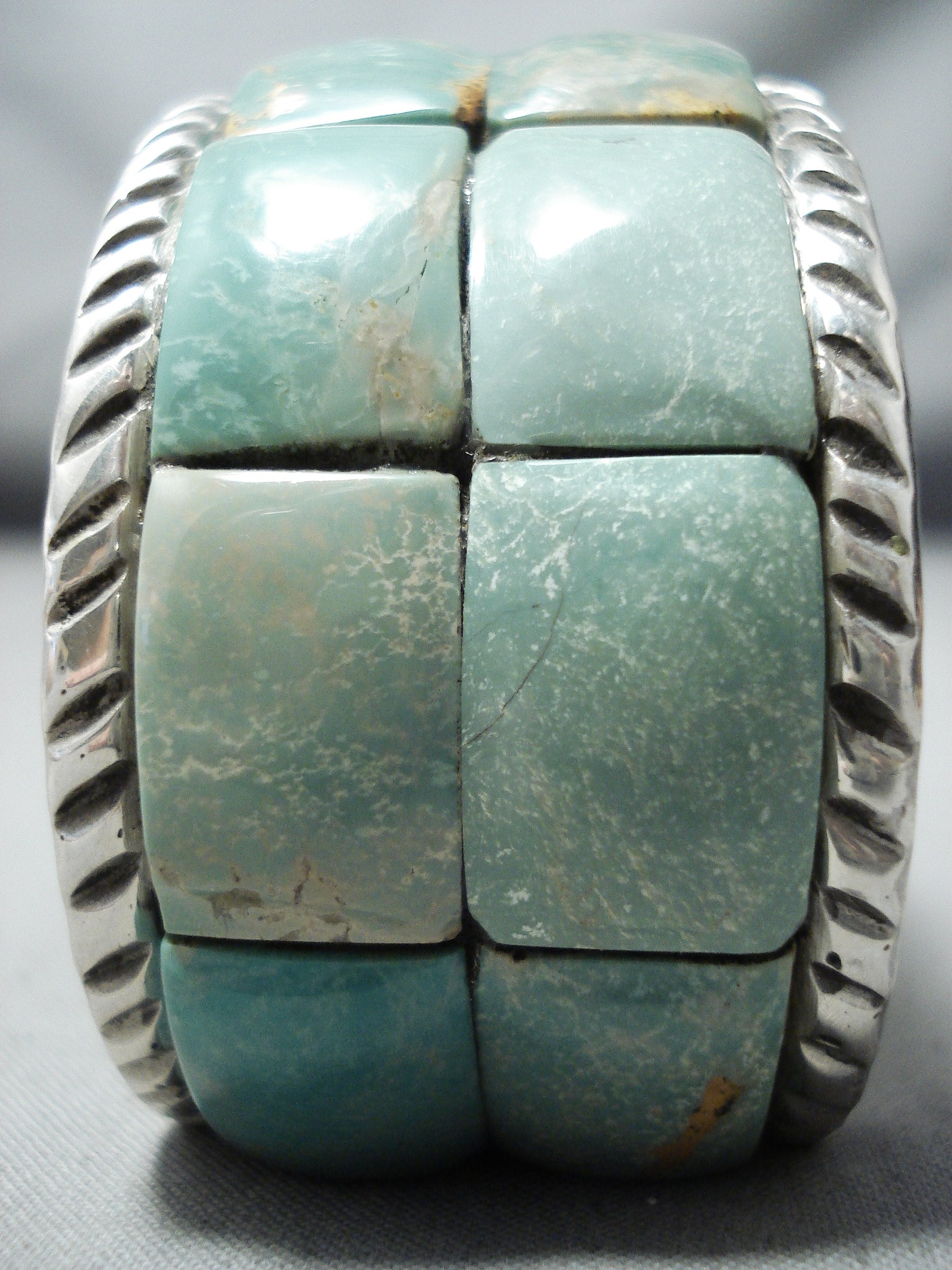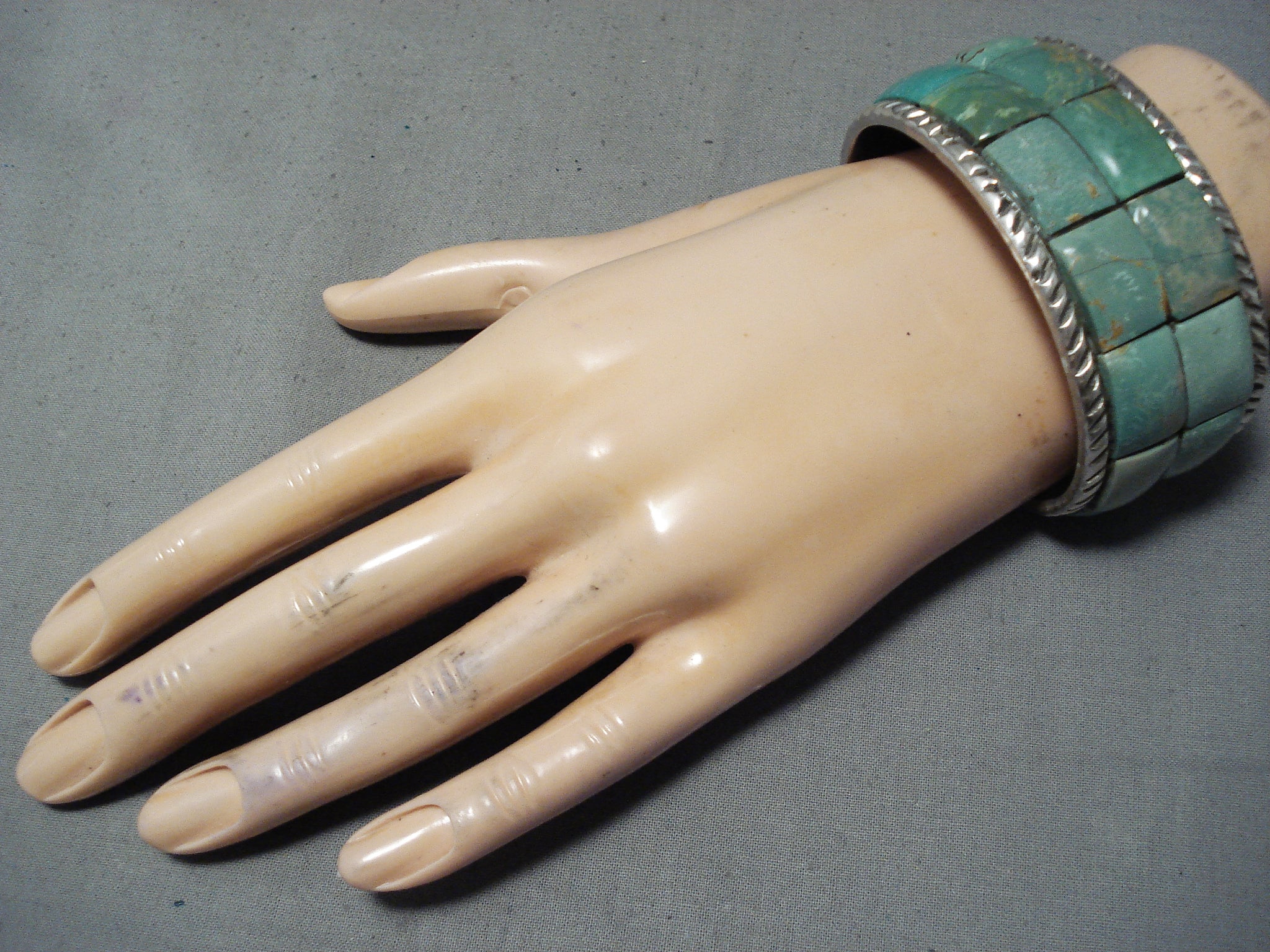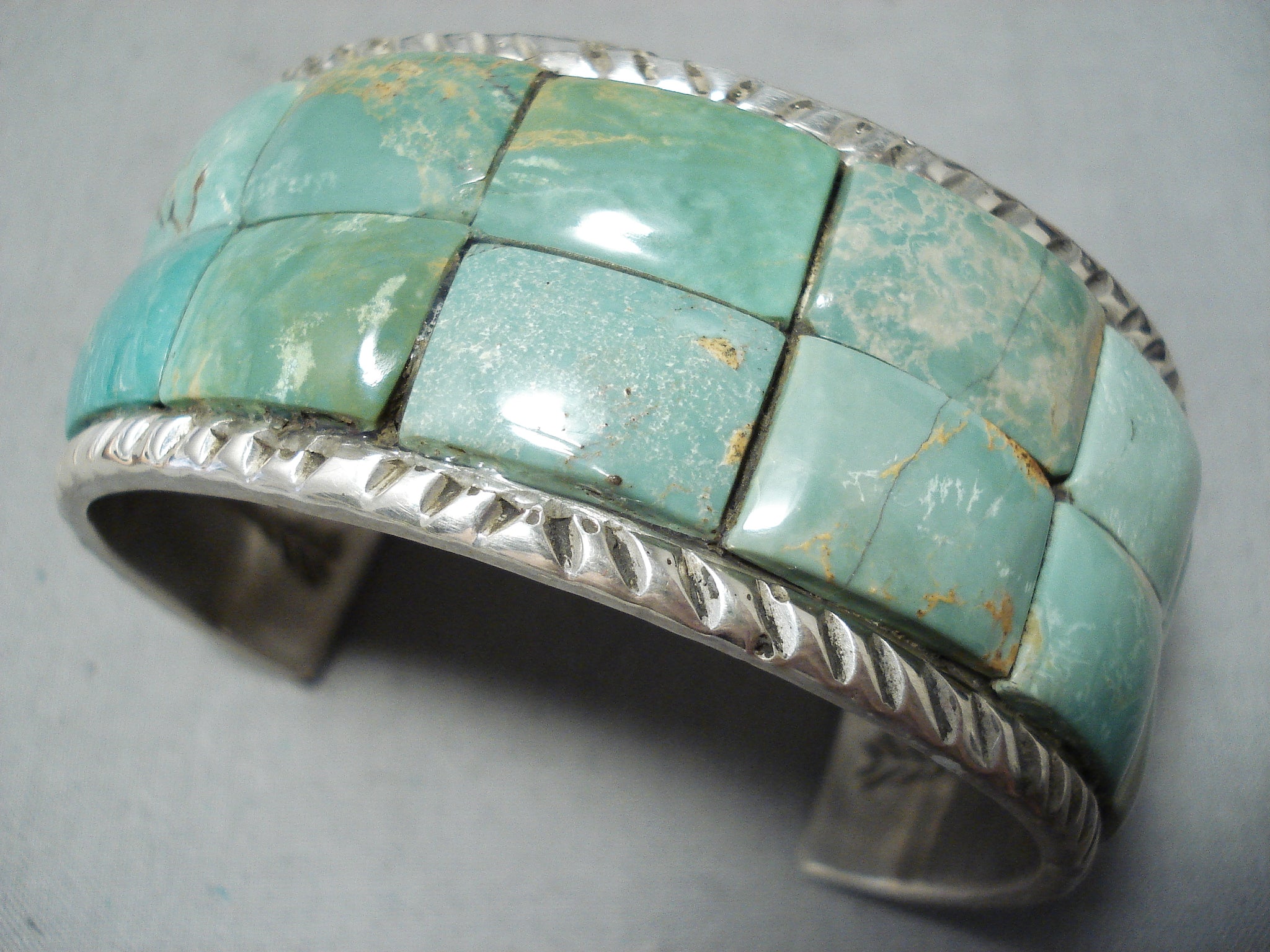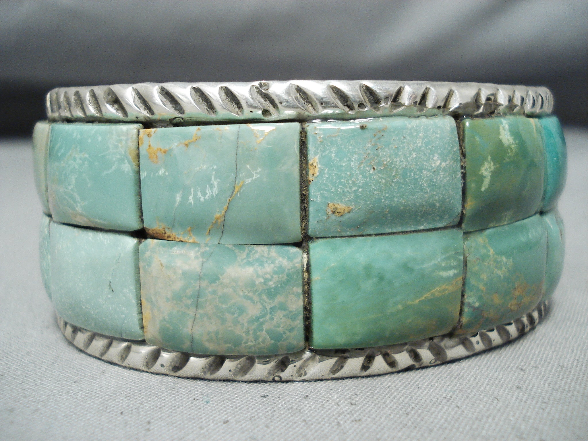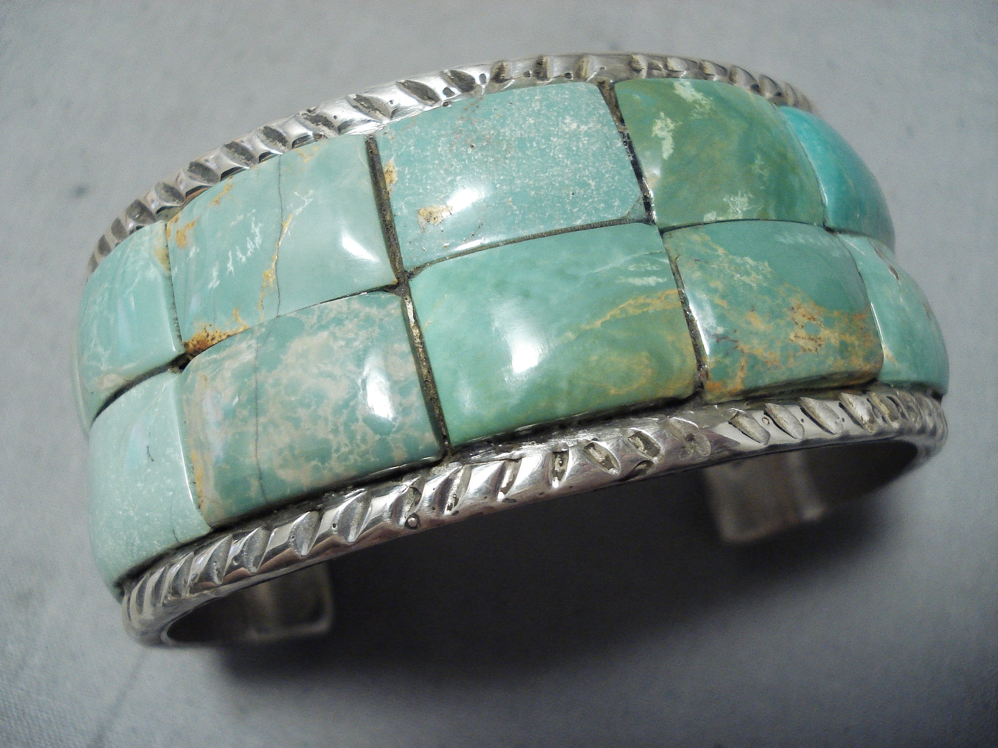 One Of The Best Native American Navajo Green Turquoise Inlay Sterling Silver Bracelet