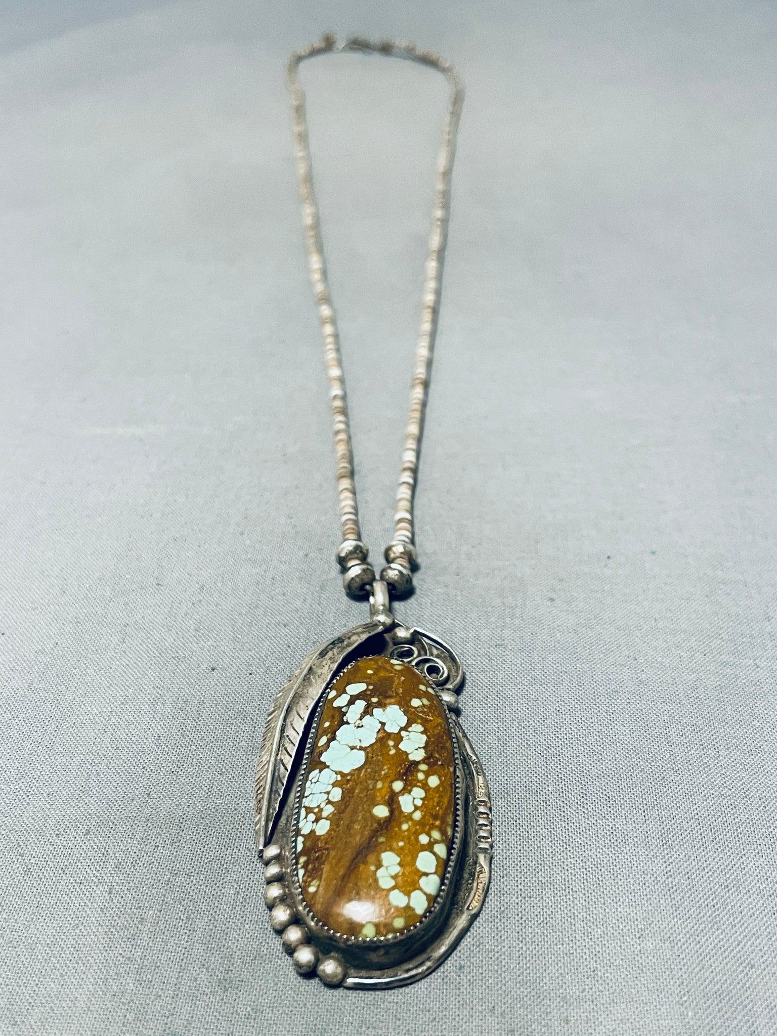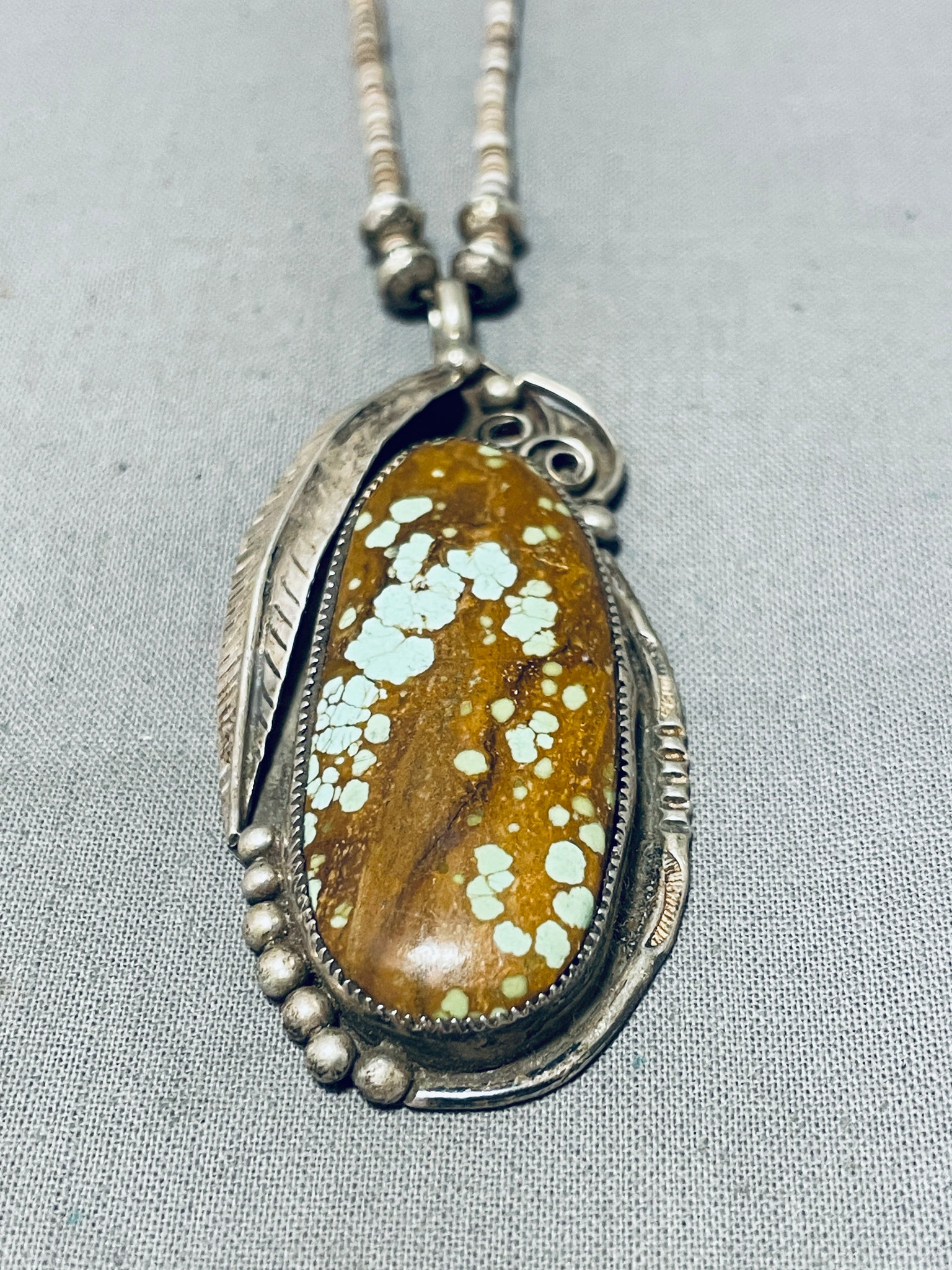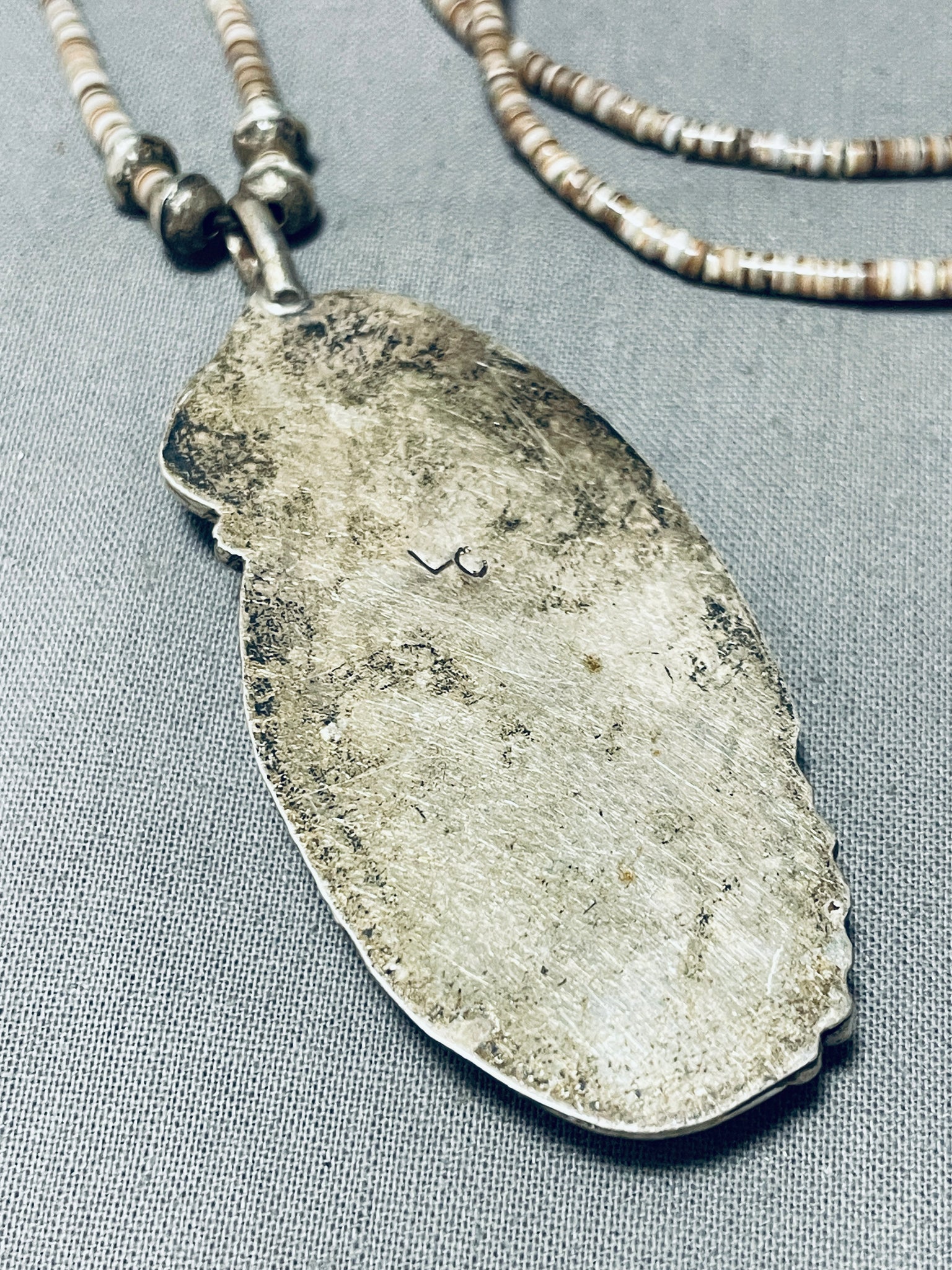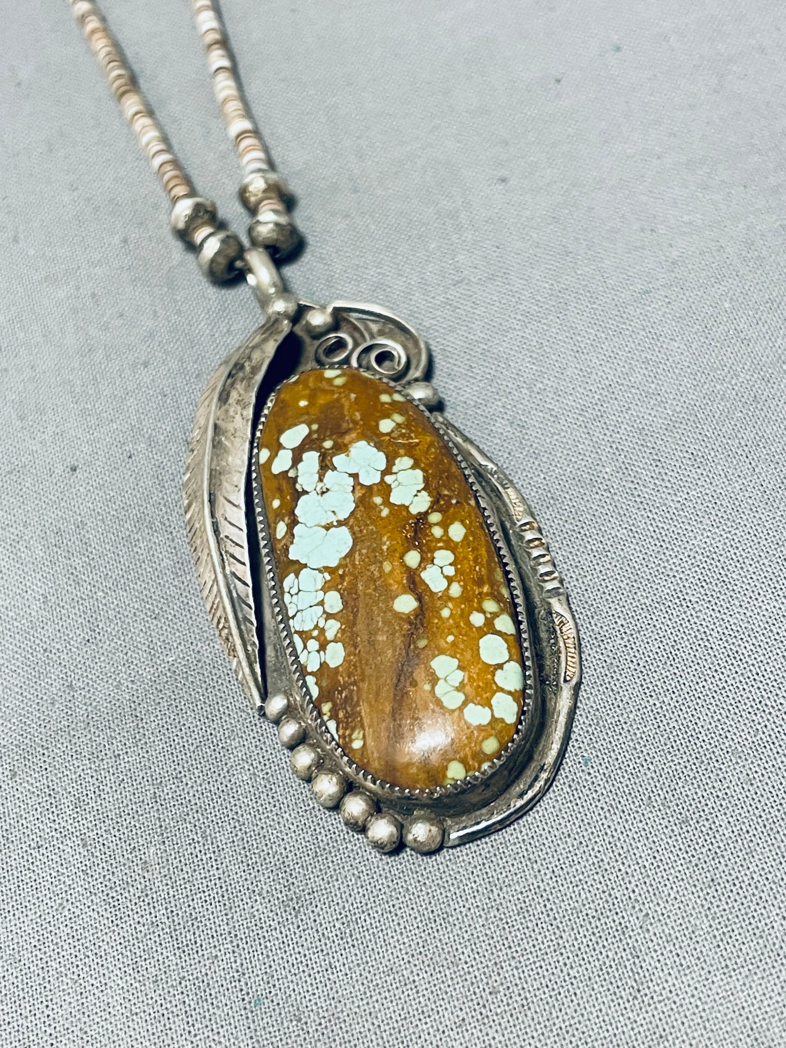 The #8 turquoise mine, nestled in the high deserts of Eureka County, Nevada, stands as a legendary source of this cherished gemstone. Renowned for its distinctive vibrant blue hue and characteristic golden to reddish-brown matrix, #8 turquoise is held in high regard among collectors and artisans worldwide. The mine's history is steeped in Native American lore, with the stone being treasured by indigenous tribes for centuries. The complex geological formations of the #8 mine yield turquoise of exceptional quality, characterized by its hardness and ability to take a high polish. This makes it a prized choice for crafting exquisite jewelry and ornamental pieces. Though the mine's production has been sporadic, the allure of #8 turquoise endures, and its scarcity only adds to its desirability. As a testament to its enduring appeal, #8 turquoise continues to captivate gem enthusiasts and those who appreciate the profound cultural significance embedded within each radiant stone. Sterling silver. Signed by Navajo artist, L.C. The length of the necklace measures around 30". Sturdy 25 grams. Cir Mid Century +