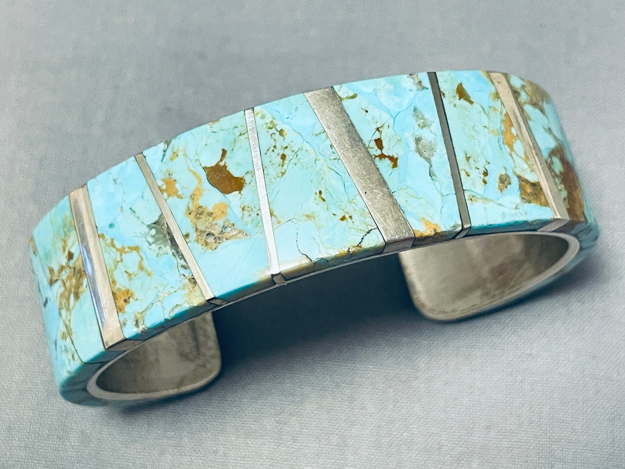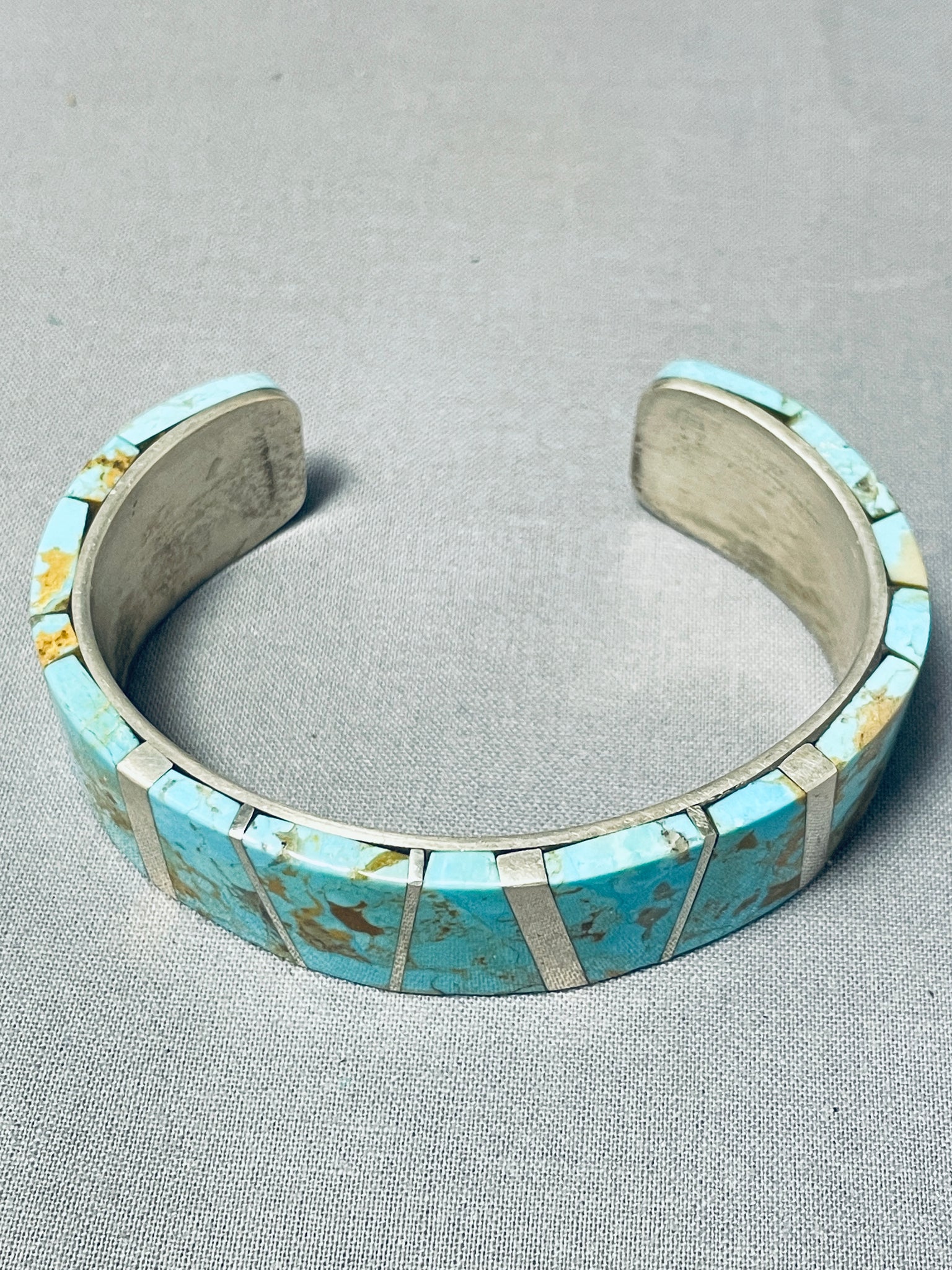 One Of The Best Vintage Native American Navajo #8 Turquoise Inlay Sterling Silver Bracelet