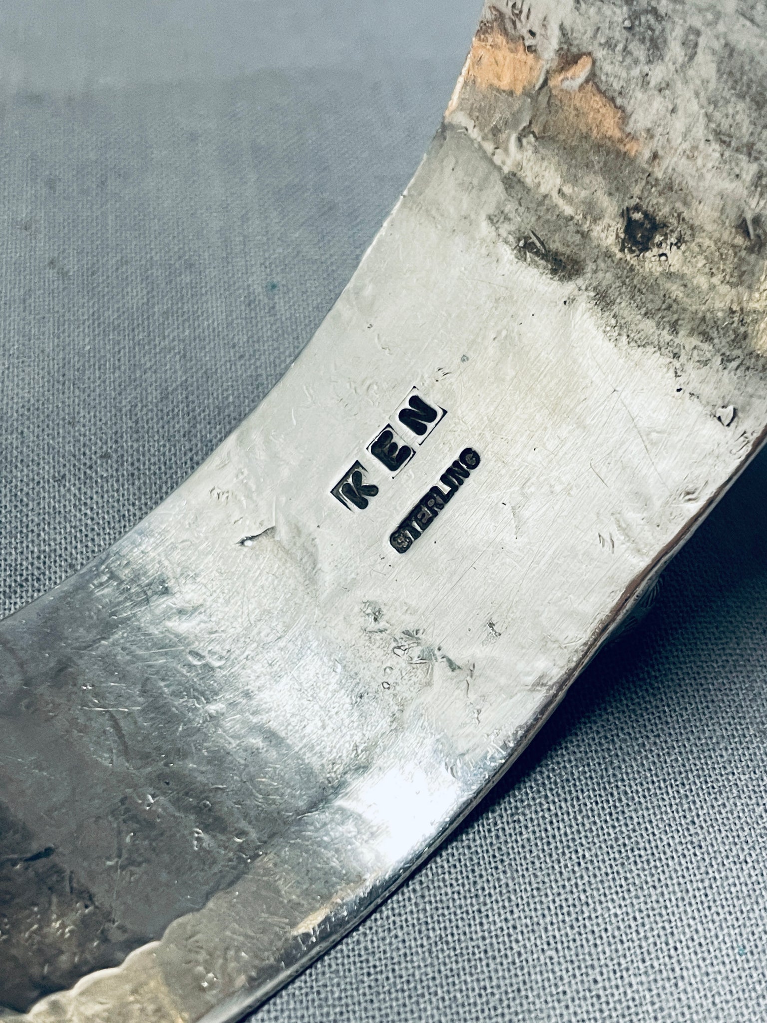 SHOWSTOPPER HERE, LOOK AT THAT STONE! This is an incredible vintage Navajo single stone spiderweb matrix turquoise stone silver cuff bracelet. This impeccable bracelet contains a beautiful center spiderweb turquoise matrix stone that is a fascinating blue coloration with dark blue colored matrix. Running down each end of the thick and sturdy wide silver cuff are amazing sun stampings with accenting line segments. Such a remarkable bracelet. The center stone measures around 1" x 3/4". The width of the bracelet measures around 1-1/8". Signed by Navajo artist, KEN. Sterling silver, marked. Cir. 1970's+. The inside end to end measures around 6-1/4" with an additional 1-1/4" gap. Sturdy 61 grams.