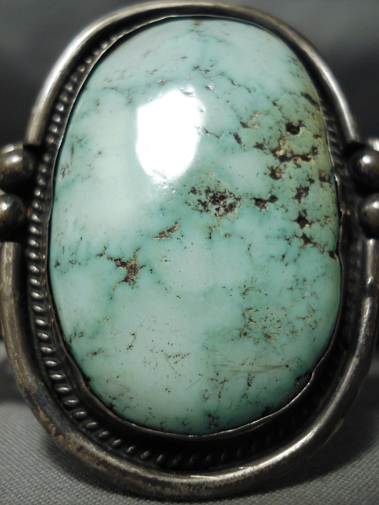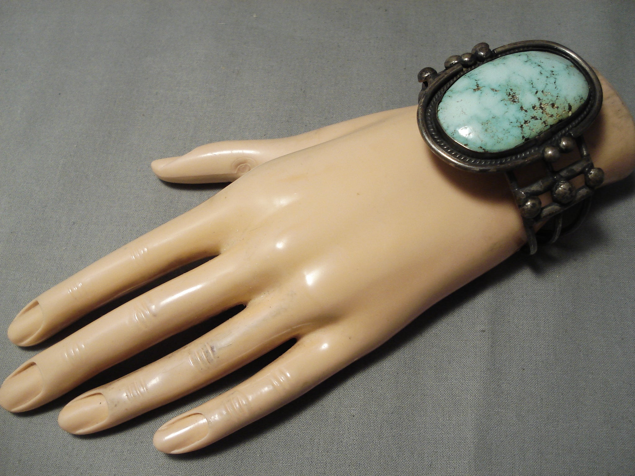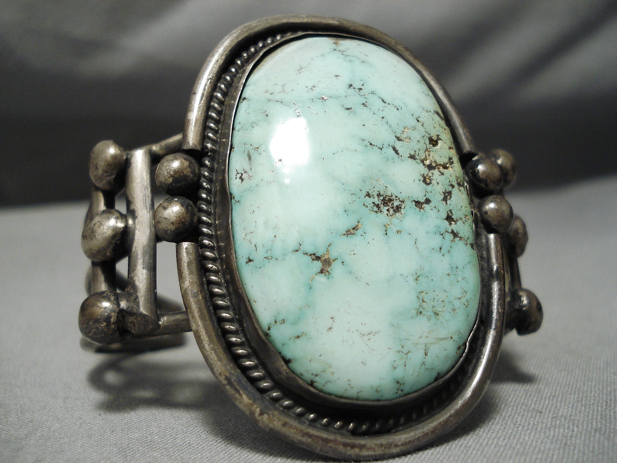 This is a superlative vintage Navajo single stone silver bracelet. This bracelet contains a large dome shaped Carico Lake turquoise stone being one of the best Carico Lake turquoise bracelets we have collected in a while. The old natural patina on the entire bracelet is just phenomenal. Accenting the cuff and stone are colossal handmade silver beads with thick silver flanks. The center stone measures around 1-7/8" x 1-1/8". The width of the bracelet measures around 1-1/8". Sterling silver. Cir. Mid century . The inside end to end measures around 5-1/4" with an additional 1-1/4" gap. Sturdy 72 grams.
