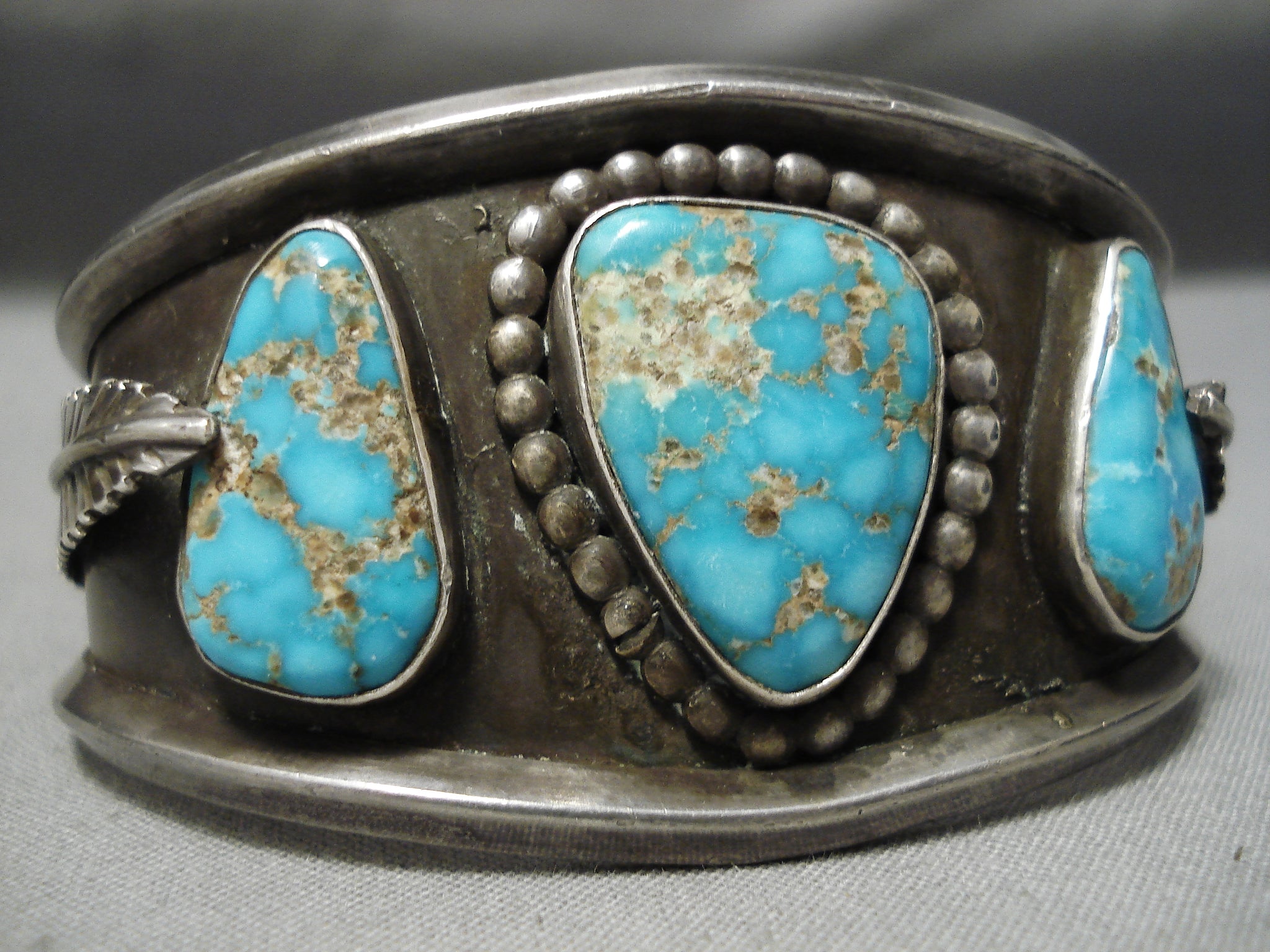 This is an impressive vintage Navajo three stone silver bracelet. This is one of the finest old blue spiderweb turquoise bracelets we have collected this year. Surrounding the center stone are wonderful silver raindrops. Located at the ends of the heavy and thick silver cuff are remarkable large hand carved silver leaves. The center stone measures around 7/8" x 5/8". The width of the bracelet measures around 1-1/2". Sterling silver. Cir. Mid century . The inside end to end measures around 5-1/2" with an additional 1-1/4" gap. Sturdy 68 grams.