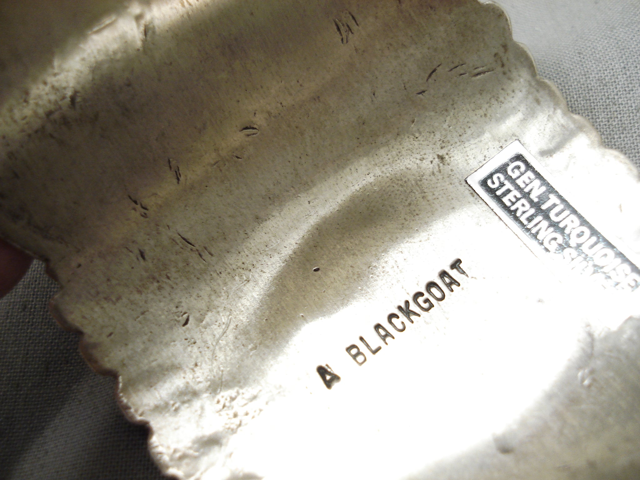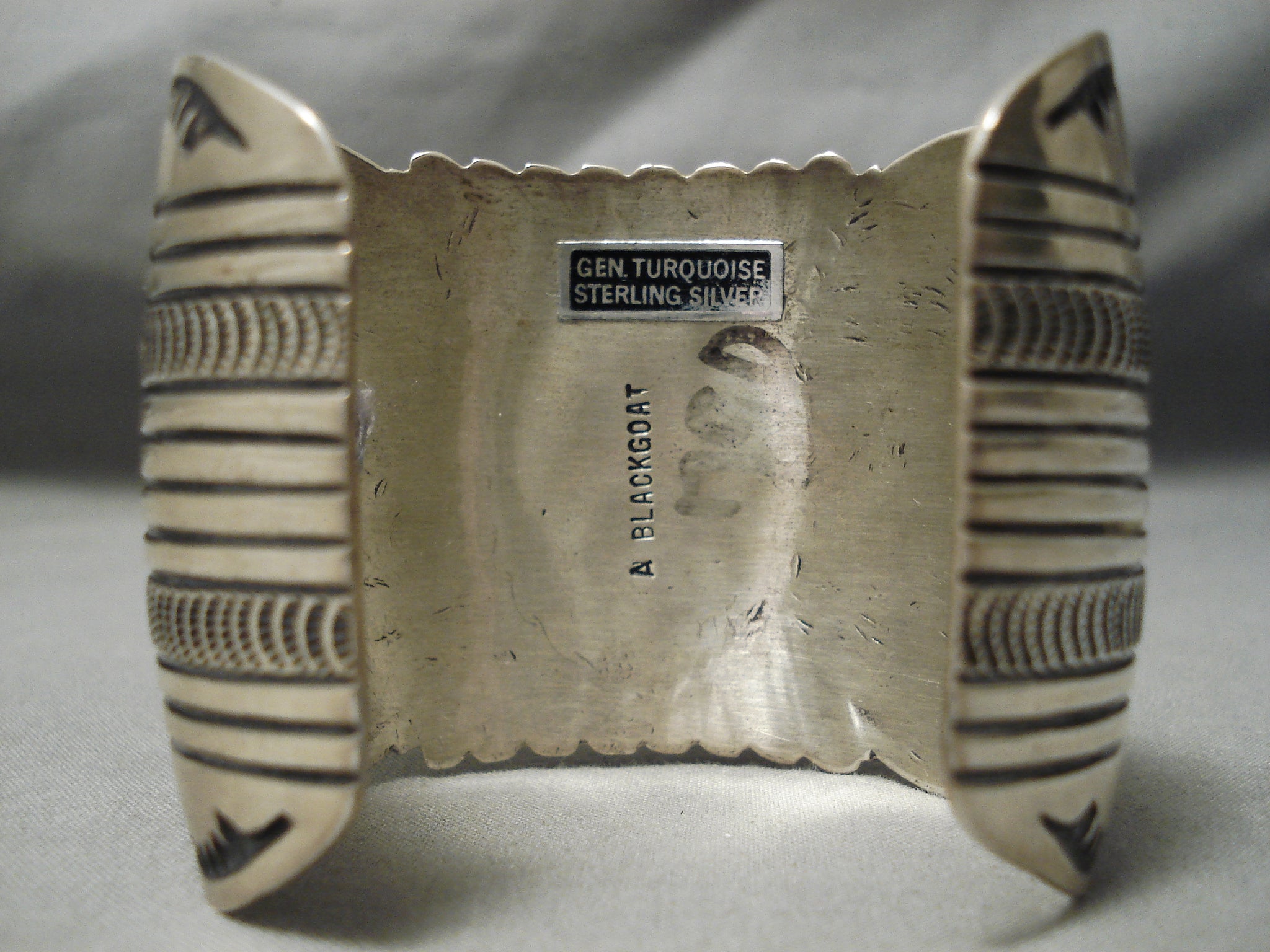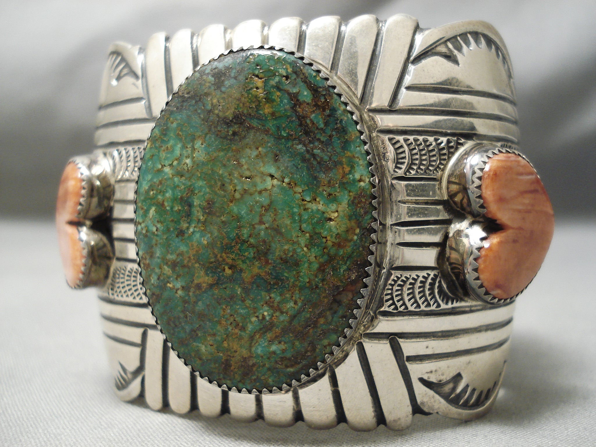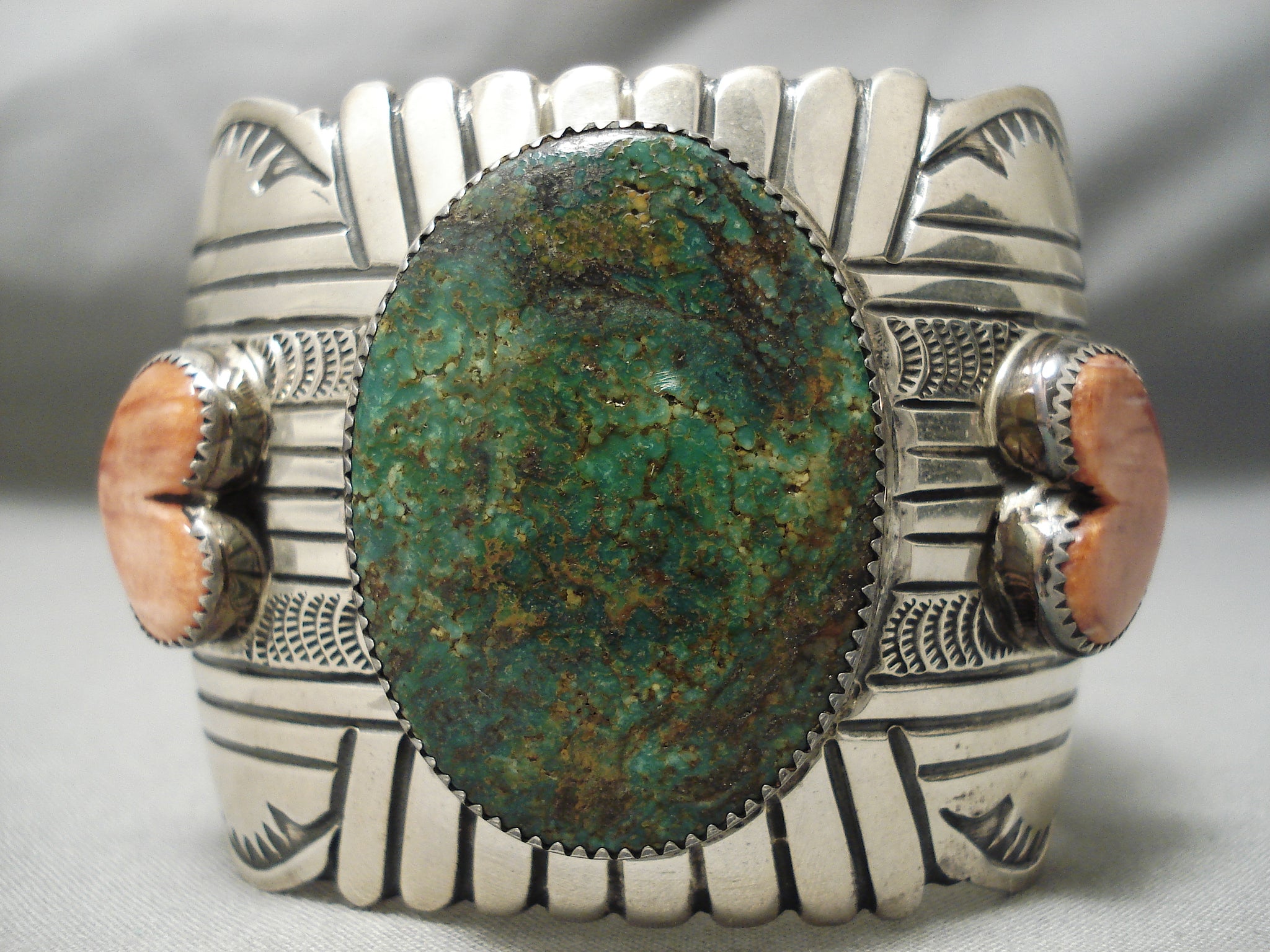 This is a magnificent vintage Navajo wide silver bracelet. This piece contains a large center dome shaped green Kings Manassa turquoise stone. Resting at the sides of the stone are impeccable heart shaped spiny oyster shells. The cuff on this piece is very wide and sturdy consisting of amazing sun bursting and sun stampings that rest on the entire cuff. The center stone measures around 1-5/8" x 1-1/8". The width of the bracelet measures around 2". Signed by Navajo artist, Arny Blackgoat . Sterling silver. Cir. 1970's+. The inside end to end measures around 5-3/4" with an additional 1-1/4" gap. Sturdy 110 grams.