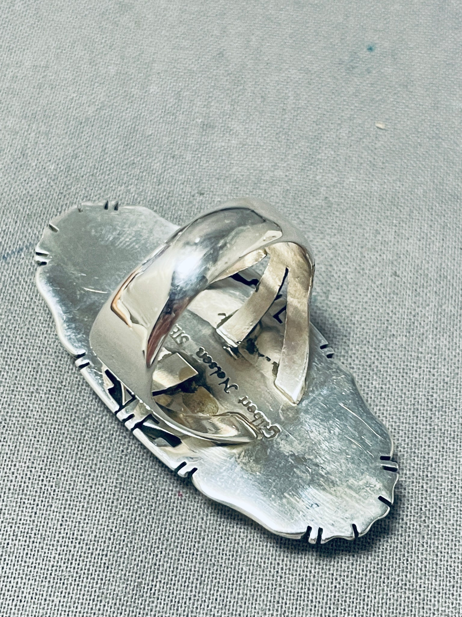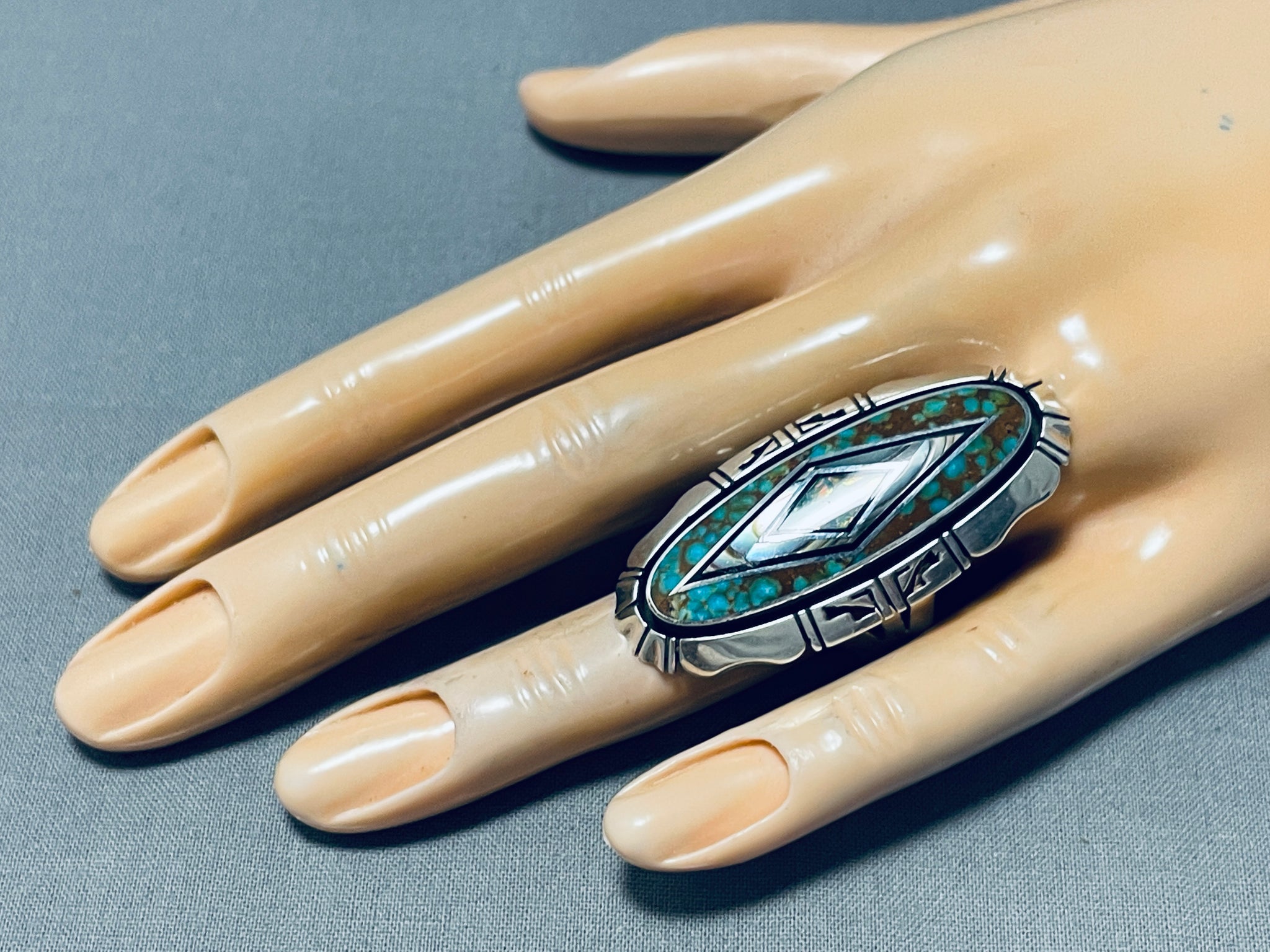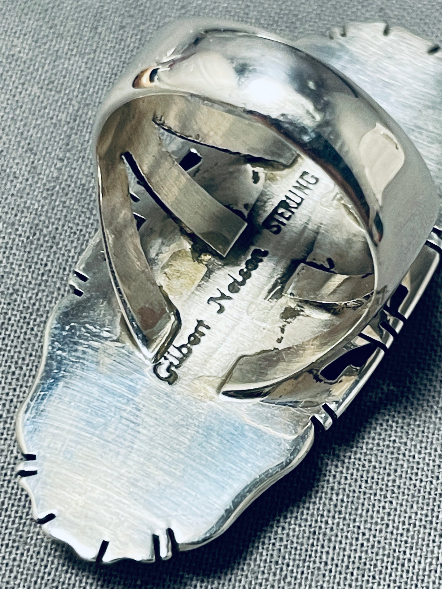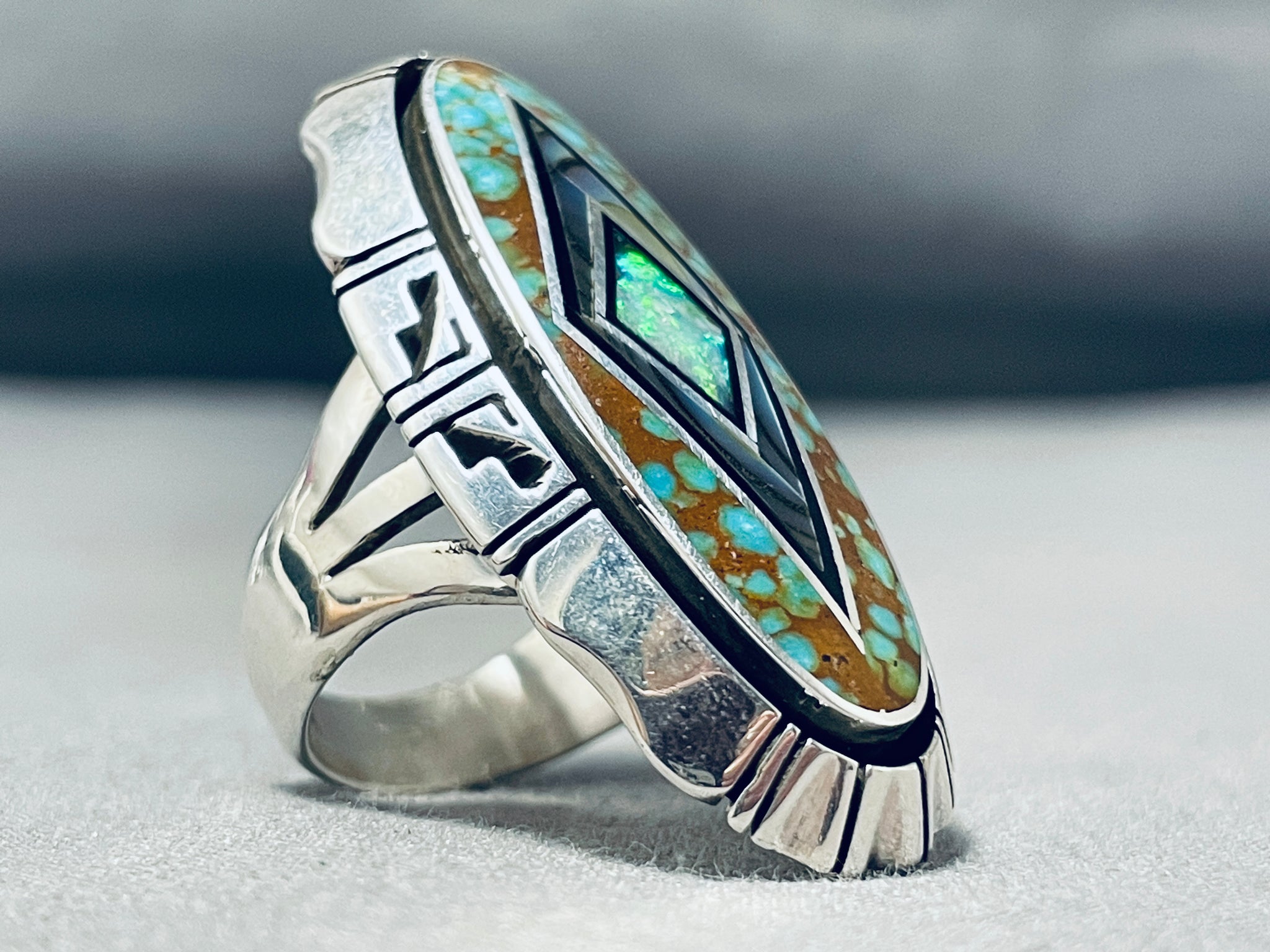 We are proud to offer this stunning Navajo silver ring. What an eye-catching piece we have here! This elongated ring reallyhas extraordinary detailing going on! Look closely to appreciate the handcarved scalloped and open-cut border, while the inside oval is almost-shadowbox with the magnificent inlay design of #8 turquoise mine, opal and abalone! It's a really exquisite piece! The ring face measures around 1-3/4" x 7/8". Signed by Navajo artist, Gilbert Nelson. The ring size is around 9. Sterling silver, marked. Sturdy 18 grams.