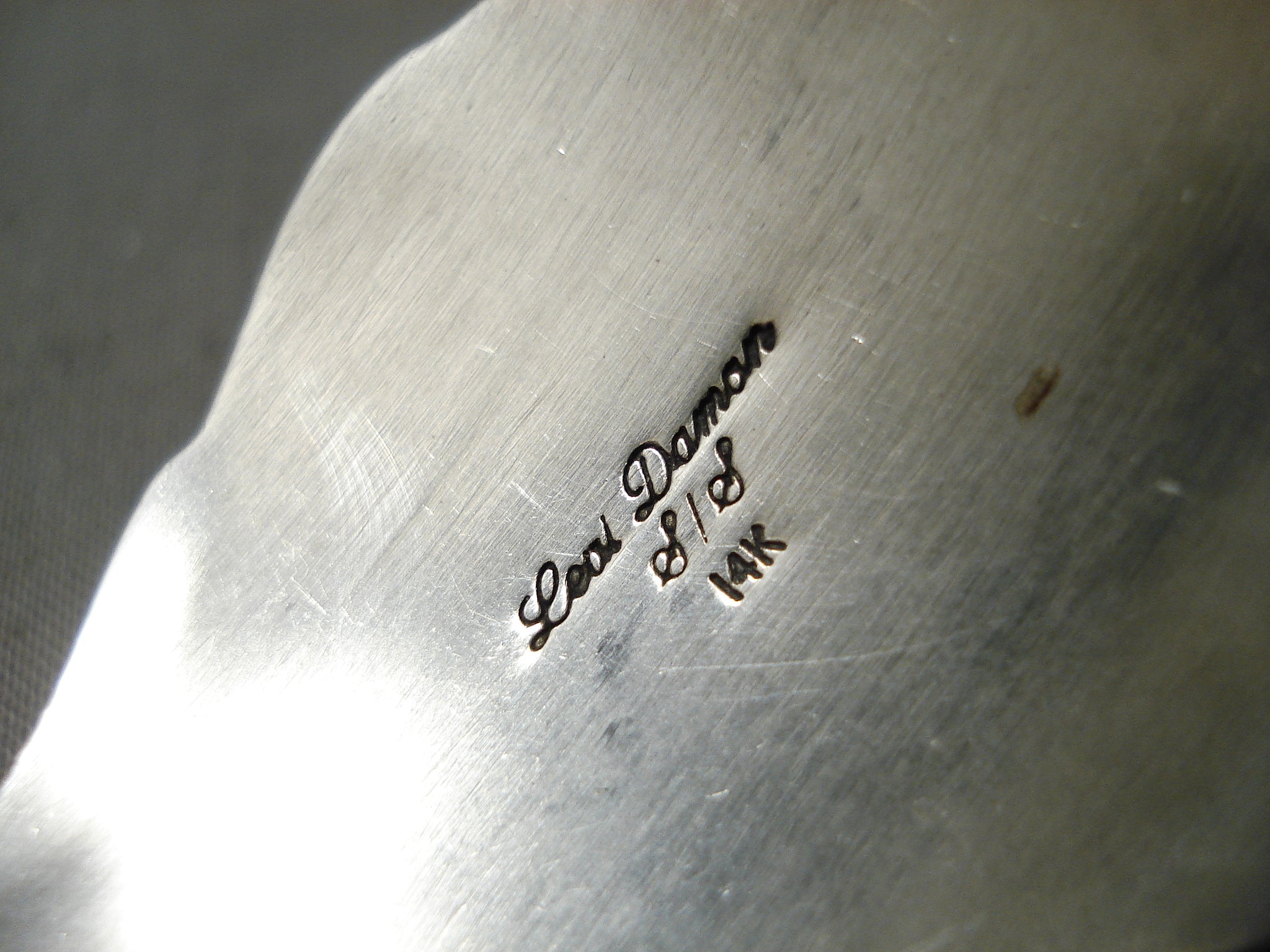 This is a remarkable vintage Navajo silver and gold bracelet handmade by master overlay silversmith artist, Neon Damon. He is one of the best overlay silver smtih artists in history. This very unique waving silver cuff bracelet is very this and sturdy. The bracelet consists of phenomenal gometric patterns with real 14k gold accents. The chisel works located throughout the cuff are absolutely impeccable. The width of the bracelet measures around 1-3/8". Signed by Navajo artist, Neon Damon. Sterling silver and 14k gold, marked . Cir. 1970's+. The inside end to end measures around 5-1/2" with an additional 1-1/2" gap. Sturdy 77 grams.