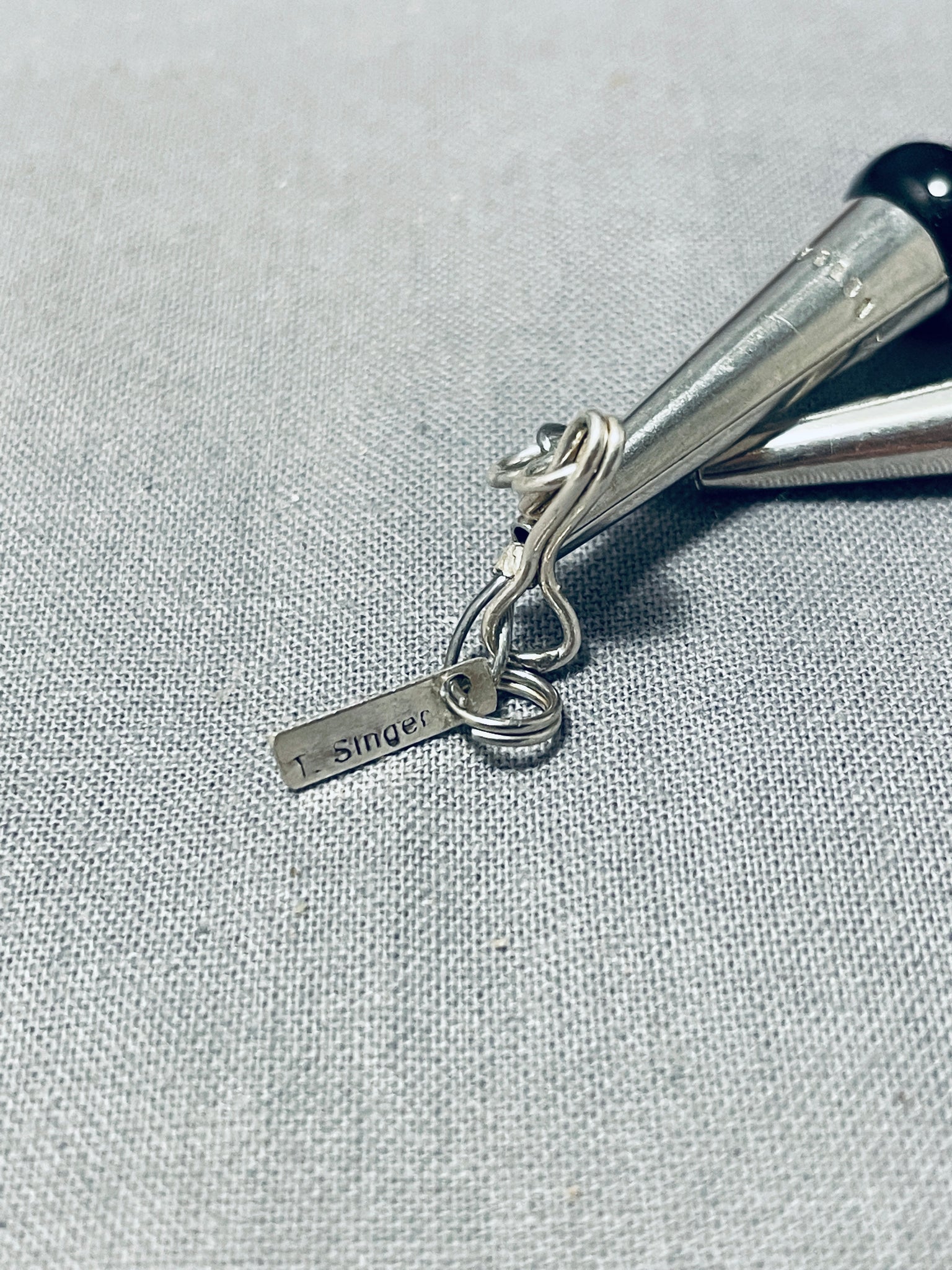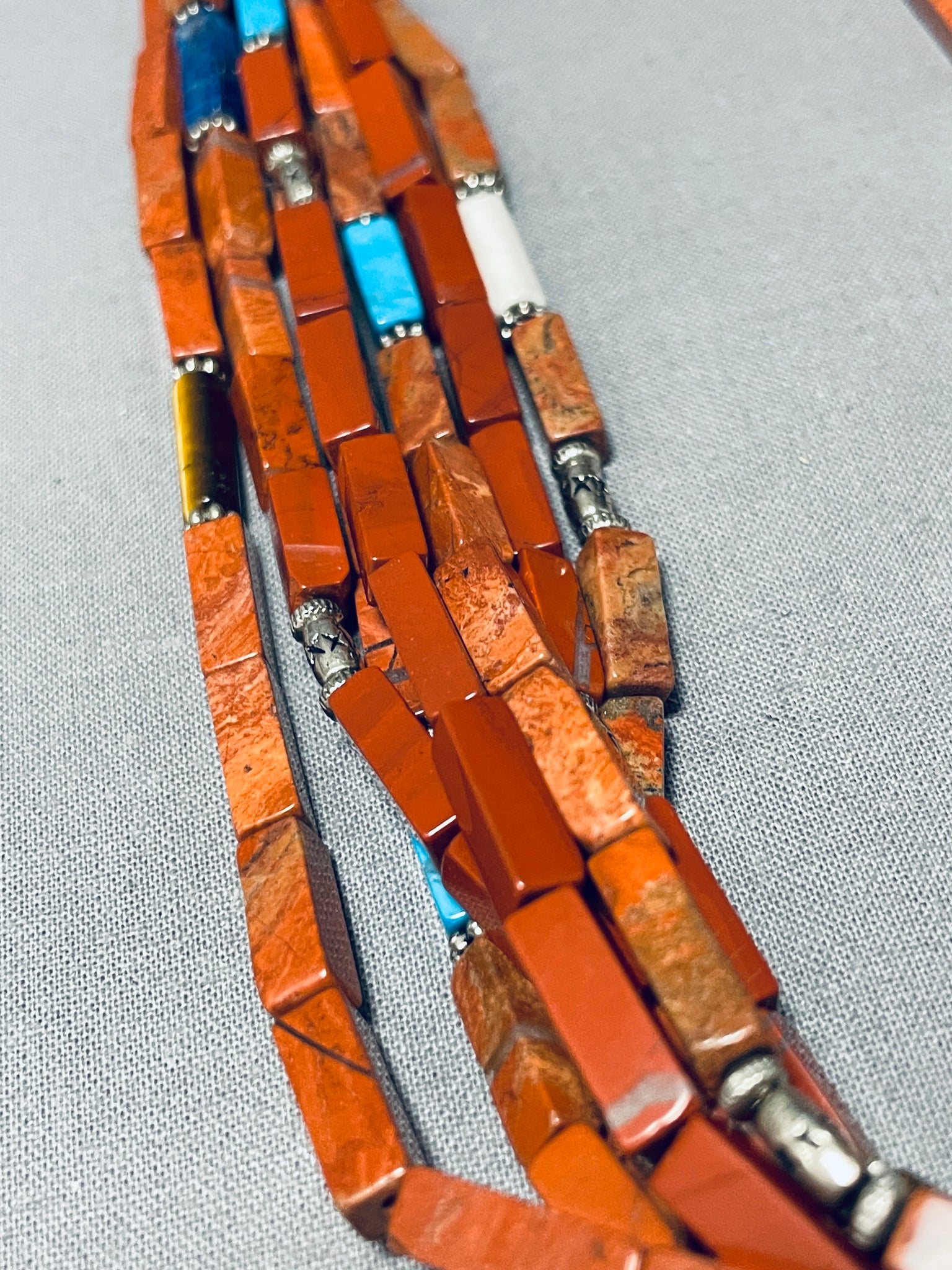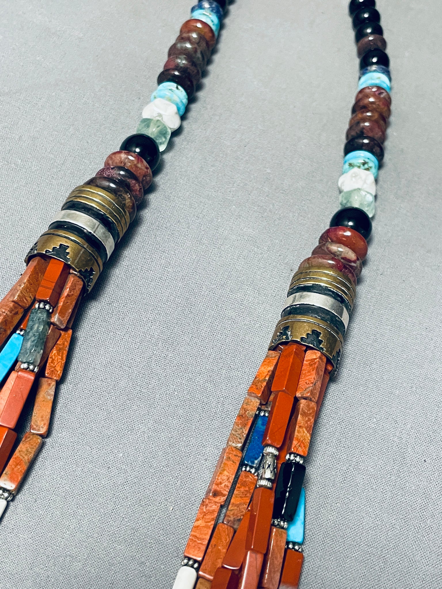 This is an impressive Navajo very beautiful handmade stone and silver necklace handmade by the famous artist, Thomas Singer. This necklace contains 7 strands that graduate into one strand towards the top. The strands at the bottom consist of remarkable hand cut rectangular 3D shaped pipestones with accenting White Buffalo turquoise stones, turquoise stones, lapis, onyx, and multiple silver beads. Seperating the 7 strands from the single strand are outstanding silver drum beads with amazing deep line segments and geometric patterns. Resting at the ends of the necklace are wonderful silver cones with a traditional silver clasp. What I also love about the necklace is that it contains a signed silver tag near the clasp. Sterling silver. Cir. 1970's+. Signed by Navajo artist, Thomas Singer. The length of the necklace measures around 29". Sturdy 192 grams.