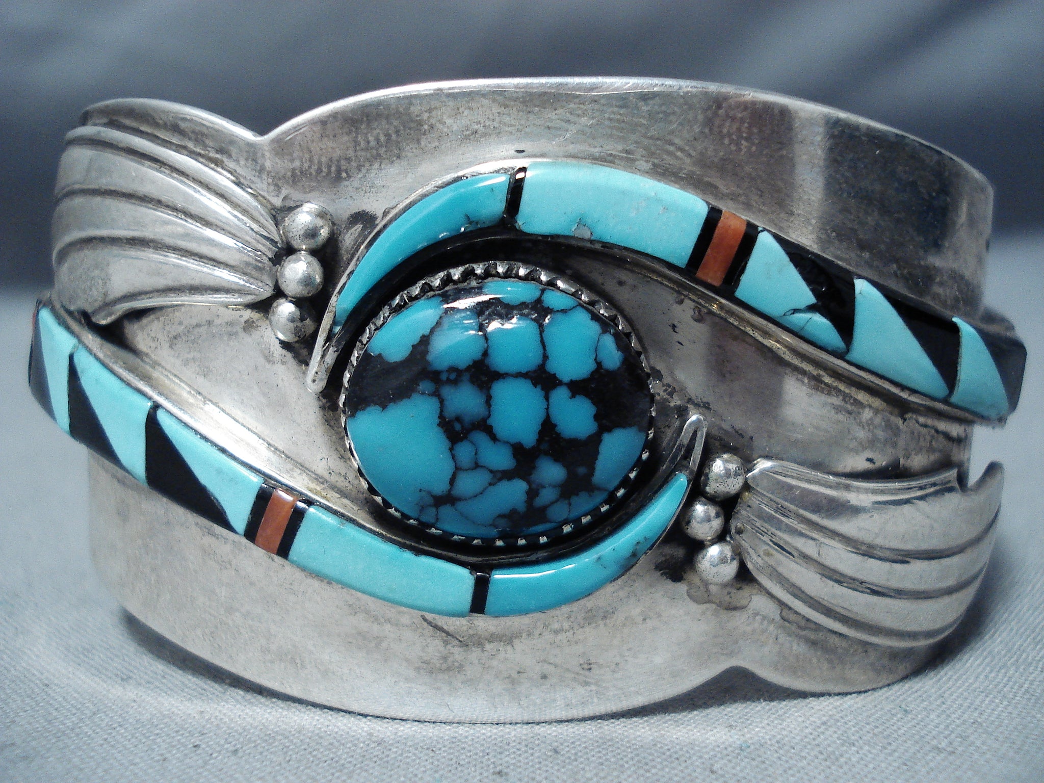 One Of The Best Vintage Native American Navajo Turquoise Inlay Sterling Silver Bracelet