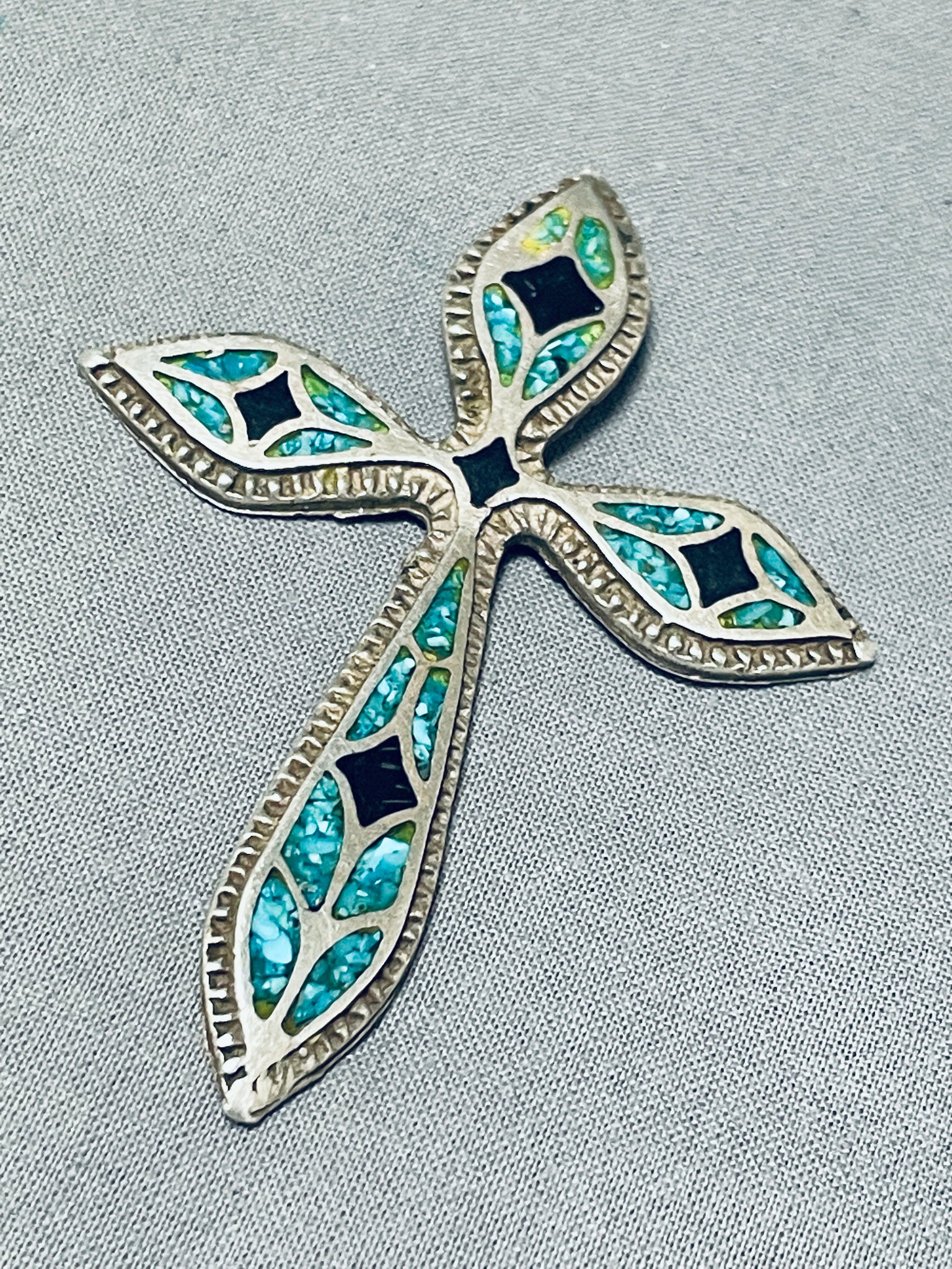 One Of The Best Vintage Native American Navajo Turquoise Inlay Sterling Silver Cross Pendant