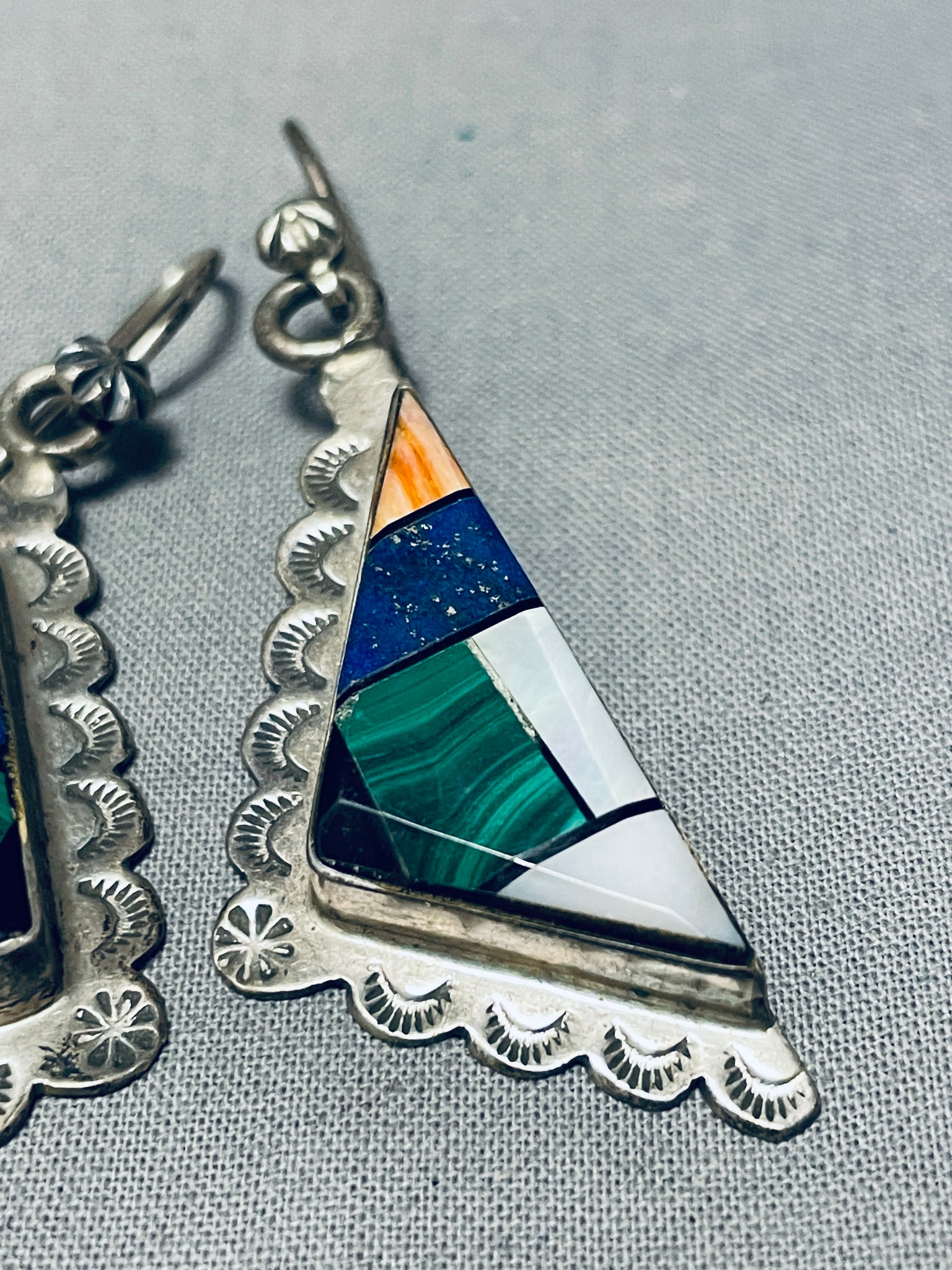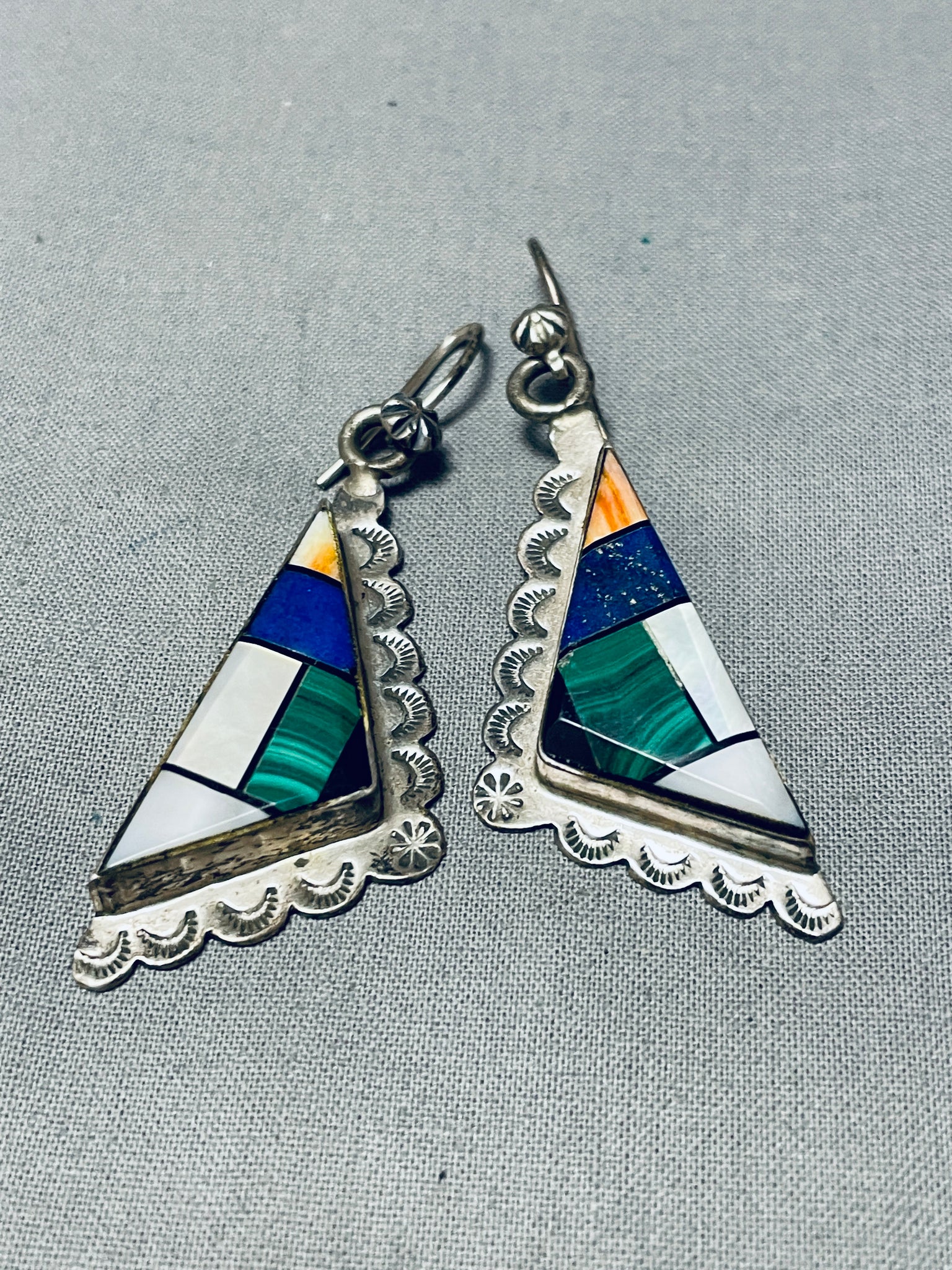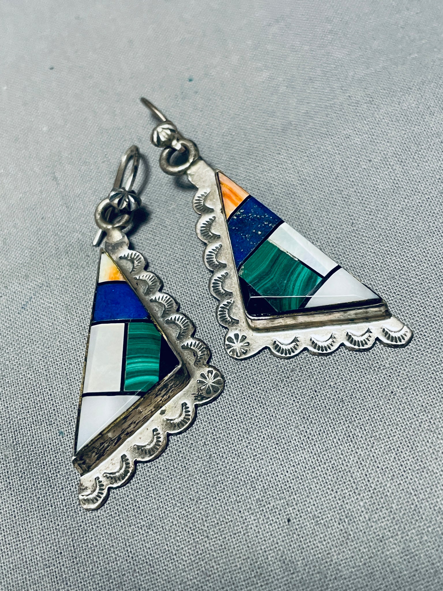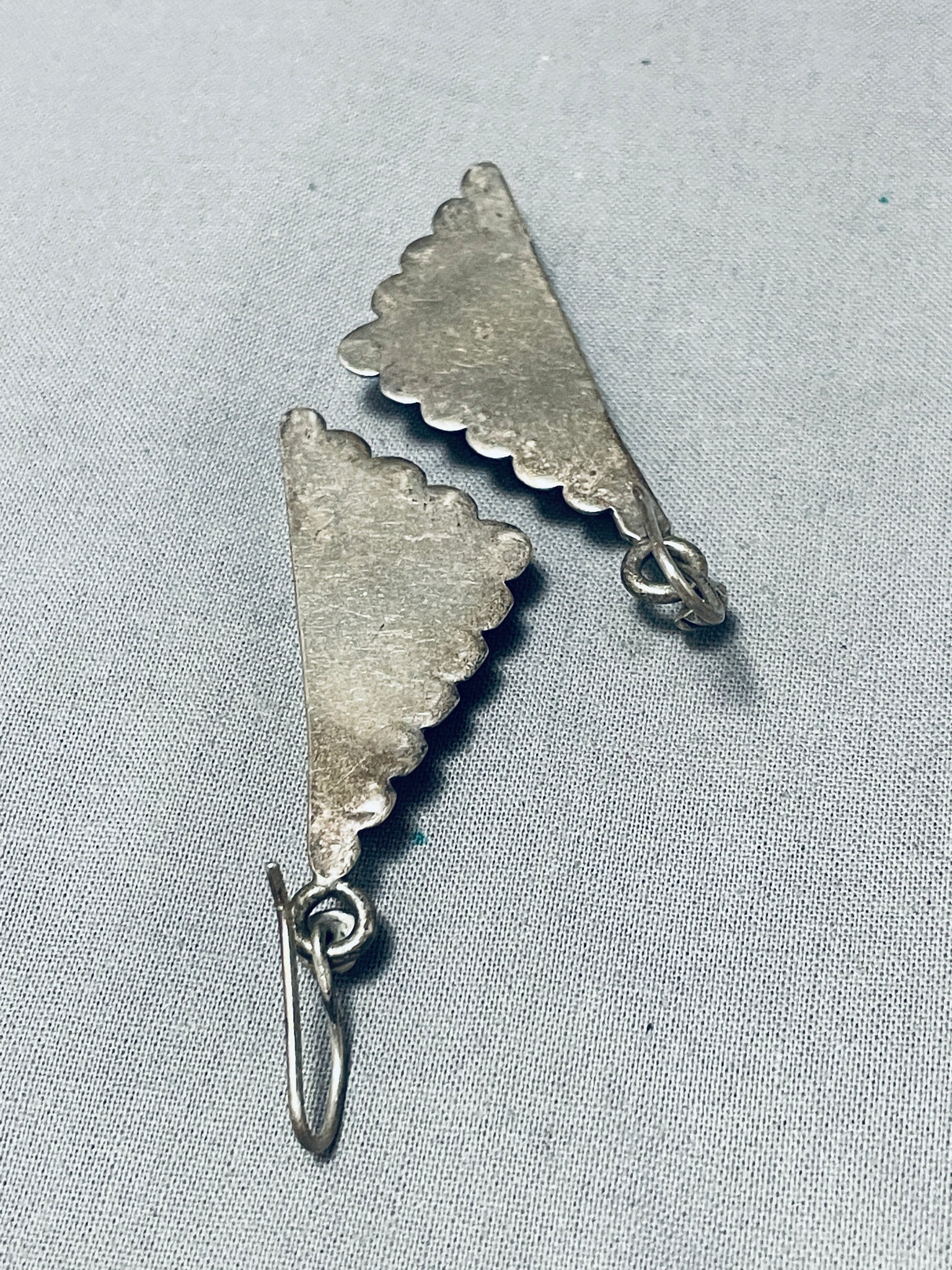 One Of The Best Vintage Native American Navajo Turquoise Inlay Sterling Silver Earrings