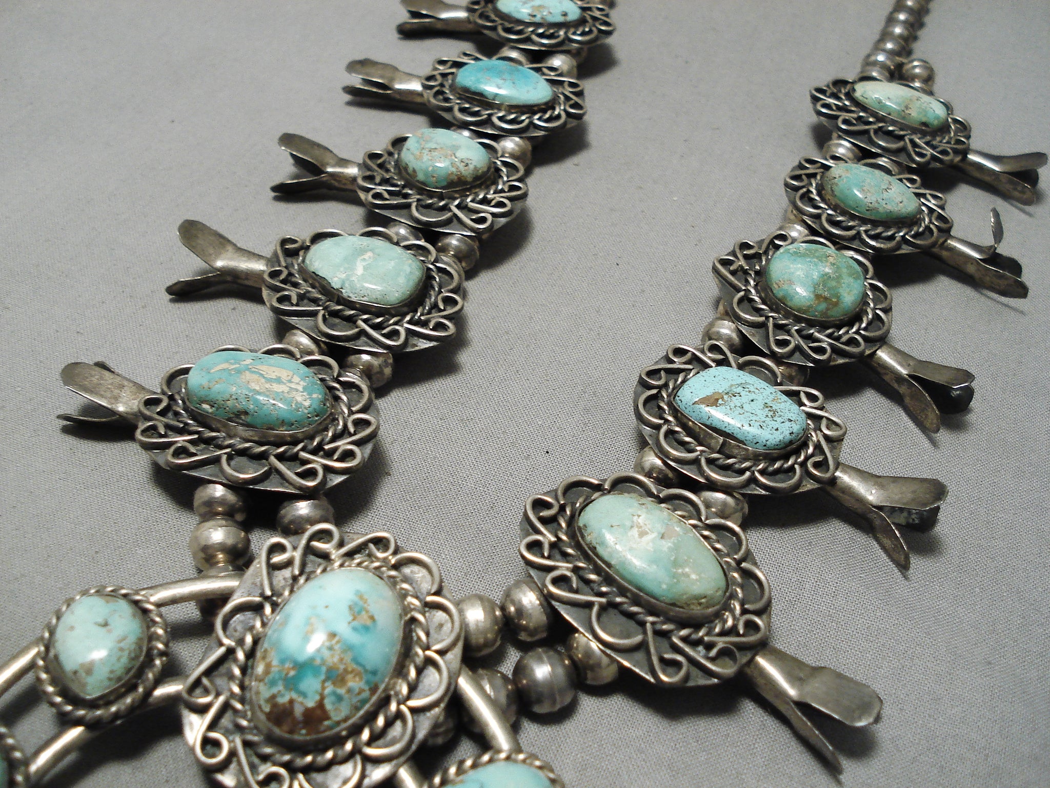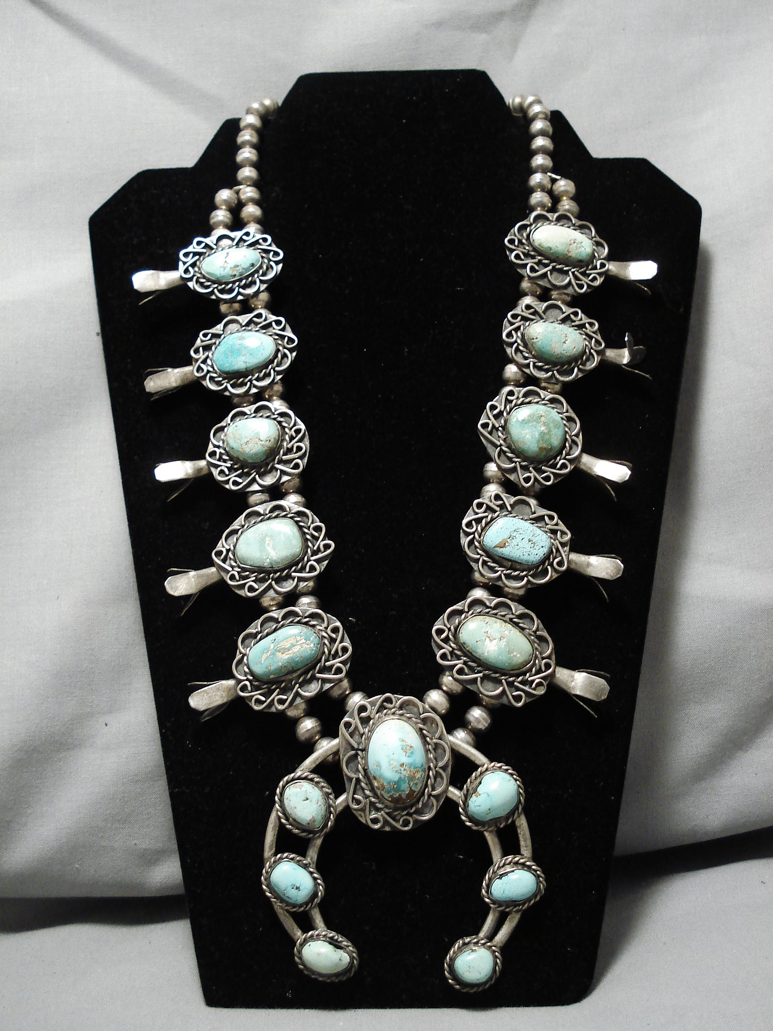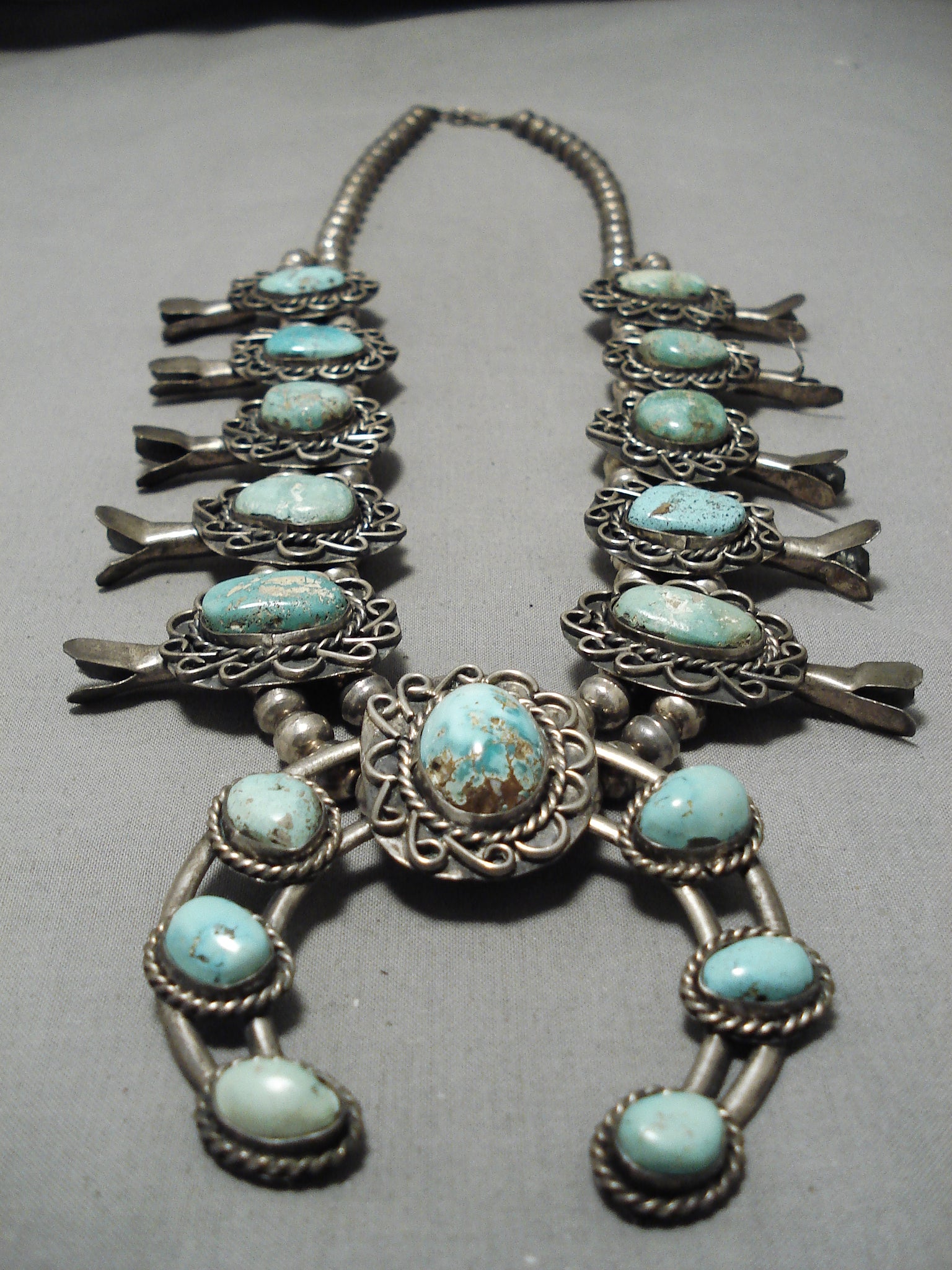 One Of The Best Vintage Native American Navajo Turquoise Sterling Silver Squash Blossom Necklace