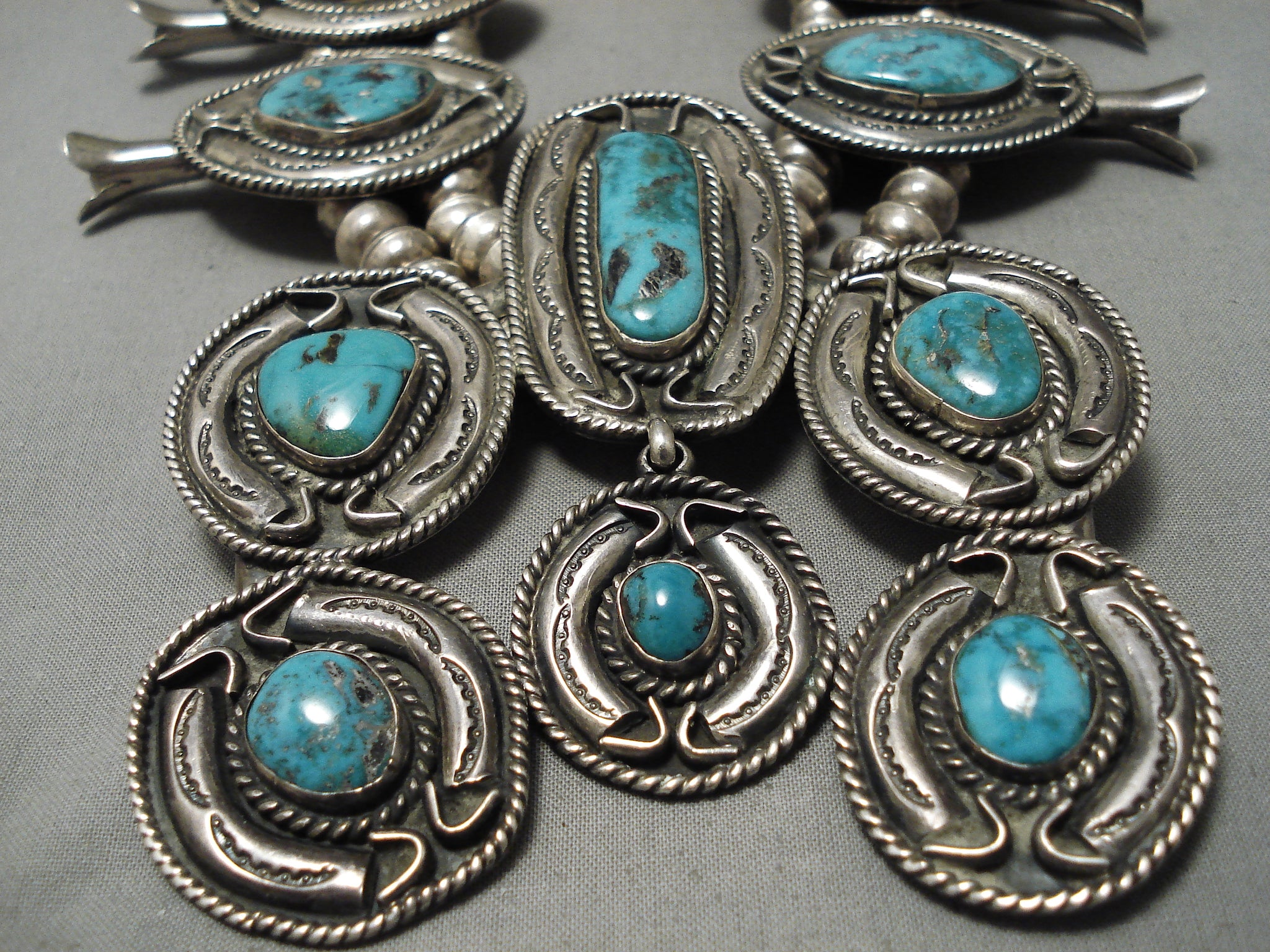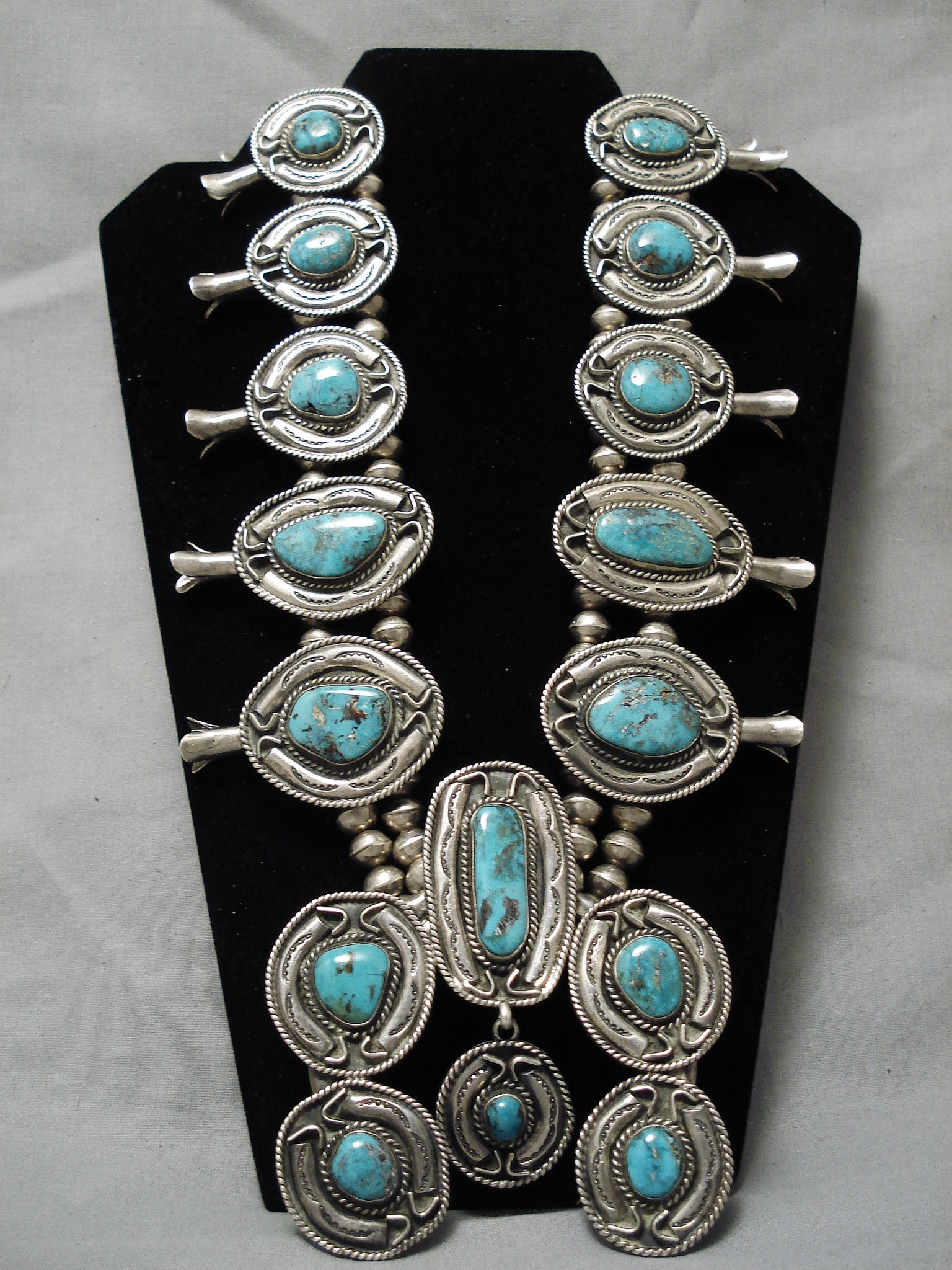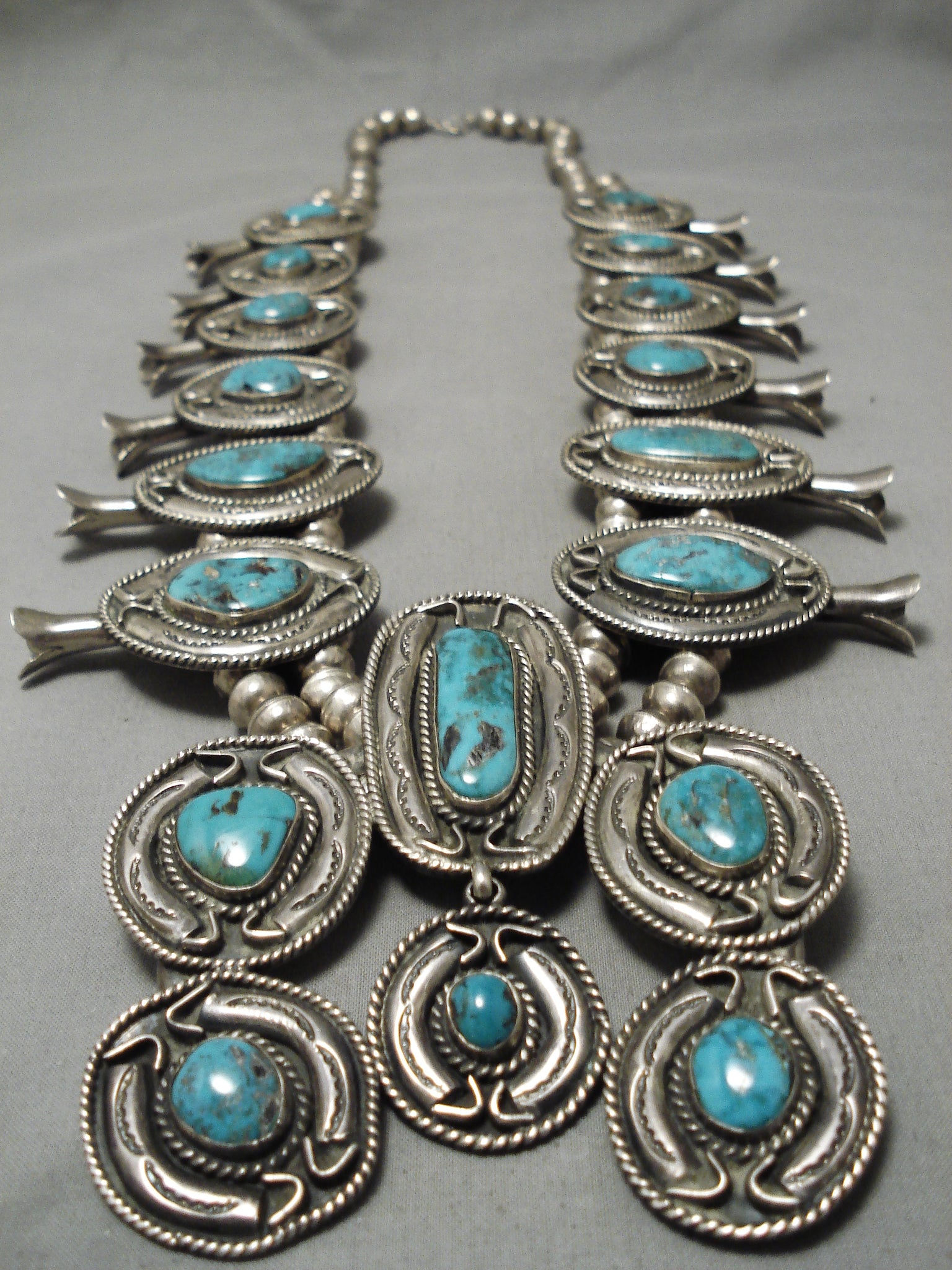 One Of The Best Vintage Native American Navajo Turquoise Sterling Silver Squash Blossom Necklace