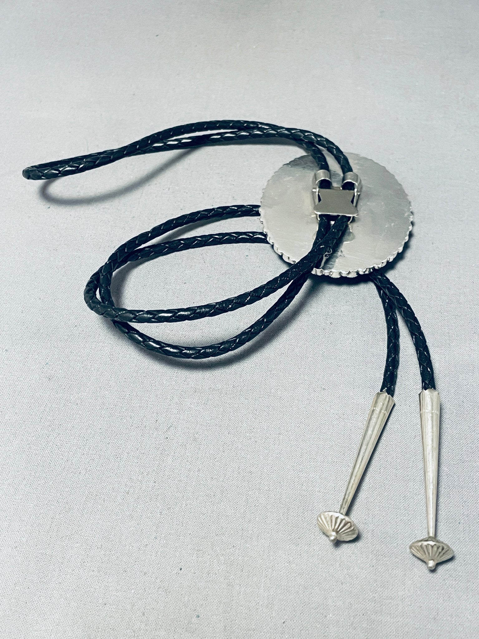 Nestled amidst the rugged terrain of Nevada, the Blue Gem turquoise mine boasts a legacy steeped in the rich tapestry of the American Southwest. Since its discovery in the early 20th century, this mine has been a beacon for turquoise enthusiasts, renowned for its vibrant hues and intricate matrix patterns. The mesmerizing azure tones of Blue Gem turquoise, accented by delicate spiderweb-like veins, have captivated artisans and collectors alike, earning it a revered status in the world of gemstones. Despite the challenges posed by the arid desert landscape, the Blue Gem mine has endured, its timeless beauty continuing to inspire awe and admiration. As a testament to the enduring allure of natural treasures and the indomitable spirit of exploration, the Blue Gem turquoise mine remains a cherished symbol of the Southwest's rich cultural heritage. The center stone measures around 3/8" x 1/4". Sterling silver, marked. The bolo measures around 3" x 2-1/4". Sturdy 73 grams. Cir Mid Century +
