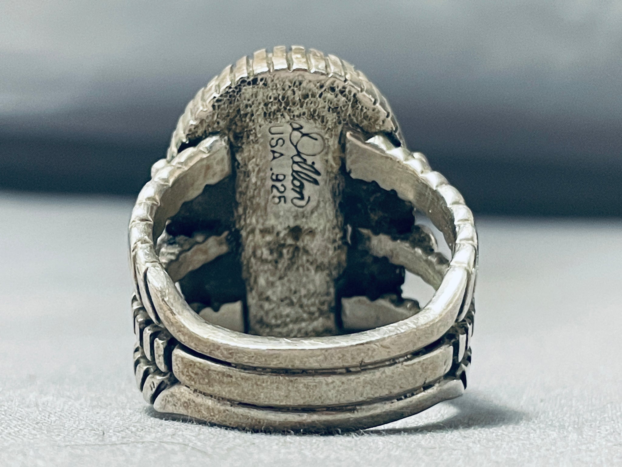 This is an exceptional Navajo large single stone silver ring. This wonderful ring contains such a large center chunky spiderweb matrix blue colored turquoise stone. The stone appears to be from the fascinating Lone Mountain turquoise mine. The bezel around the stone consists of amazing channeled patterns. This ring is extremley thick and sturdy containing a triple silver shank that runs into a single shank towards the back. The shanks consist of rope like patterns and a center channel pattern with accenting silver raindrops. The center stone measures around 1-1/4" x 3/4". The ring face measures around 1-1/4" x 3/4". Signed by Navajo artist, Dillon. The ring size is around 14. Cir. 1970's+. Sterling silver. Sturdy 25 grams.