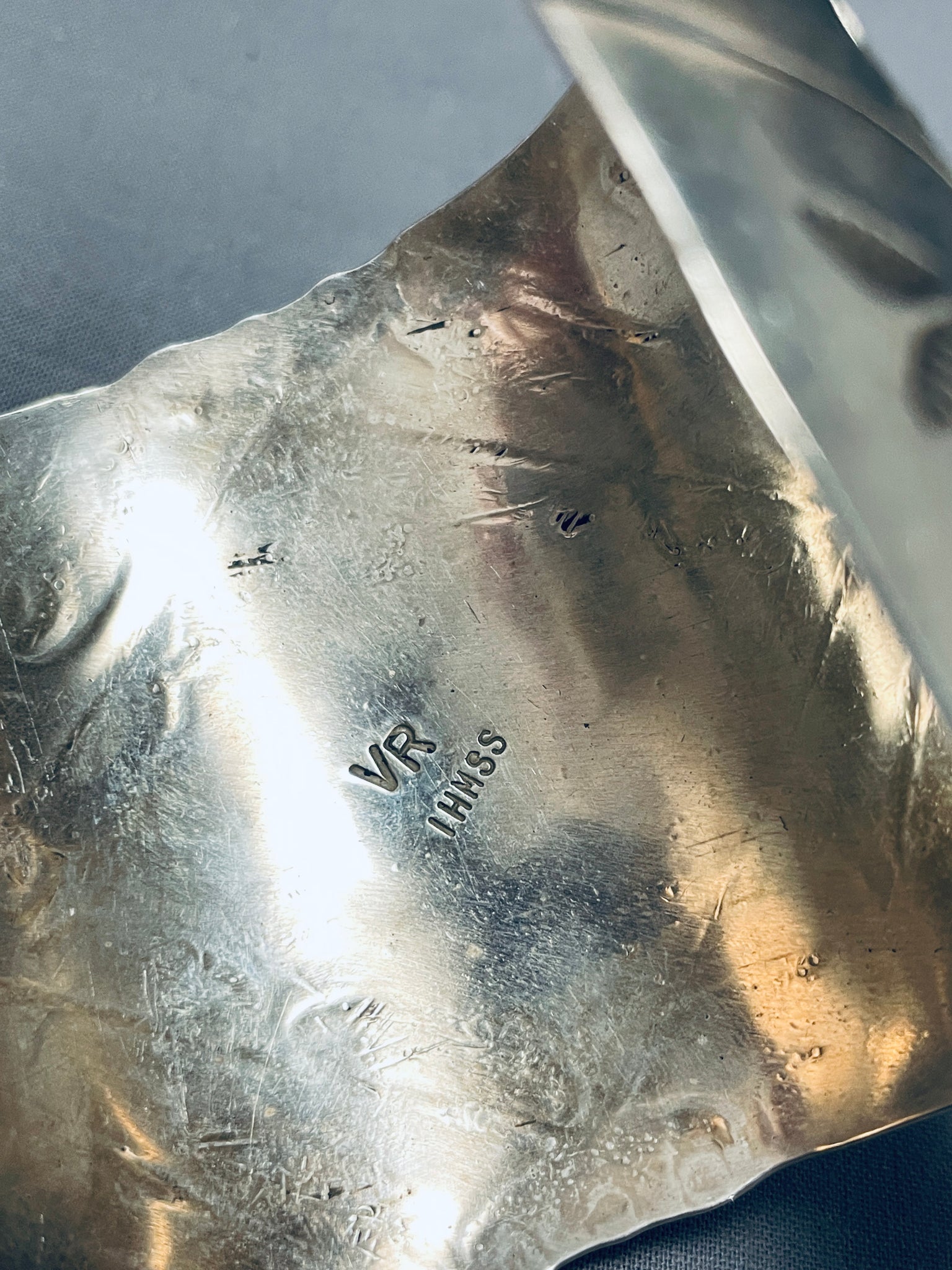 This is a magnificent Navajo large single stone silver cuff bracelet. This remarkable bracelet contains a large center chunky Pilot Mountain turquoise stone. Surrounding the stone is a thick silver rope. Accenting the entire very wide silver cuff are impressive silver works that include sun works, teepee patterns, dotted works and diamond patterns. I love the intricacy and detailing on this bracelet. The center stone measures around 1-3/8" x 1-1/8". The width of the bracelet measures around 2-3/8". Signed by Navajo artist, Virg Reeder. Sterling silver, marked. The inside end to end measures around 6" with an additional 1-1/2" gap. Sturdy 94 grams.