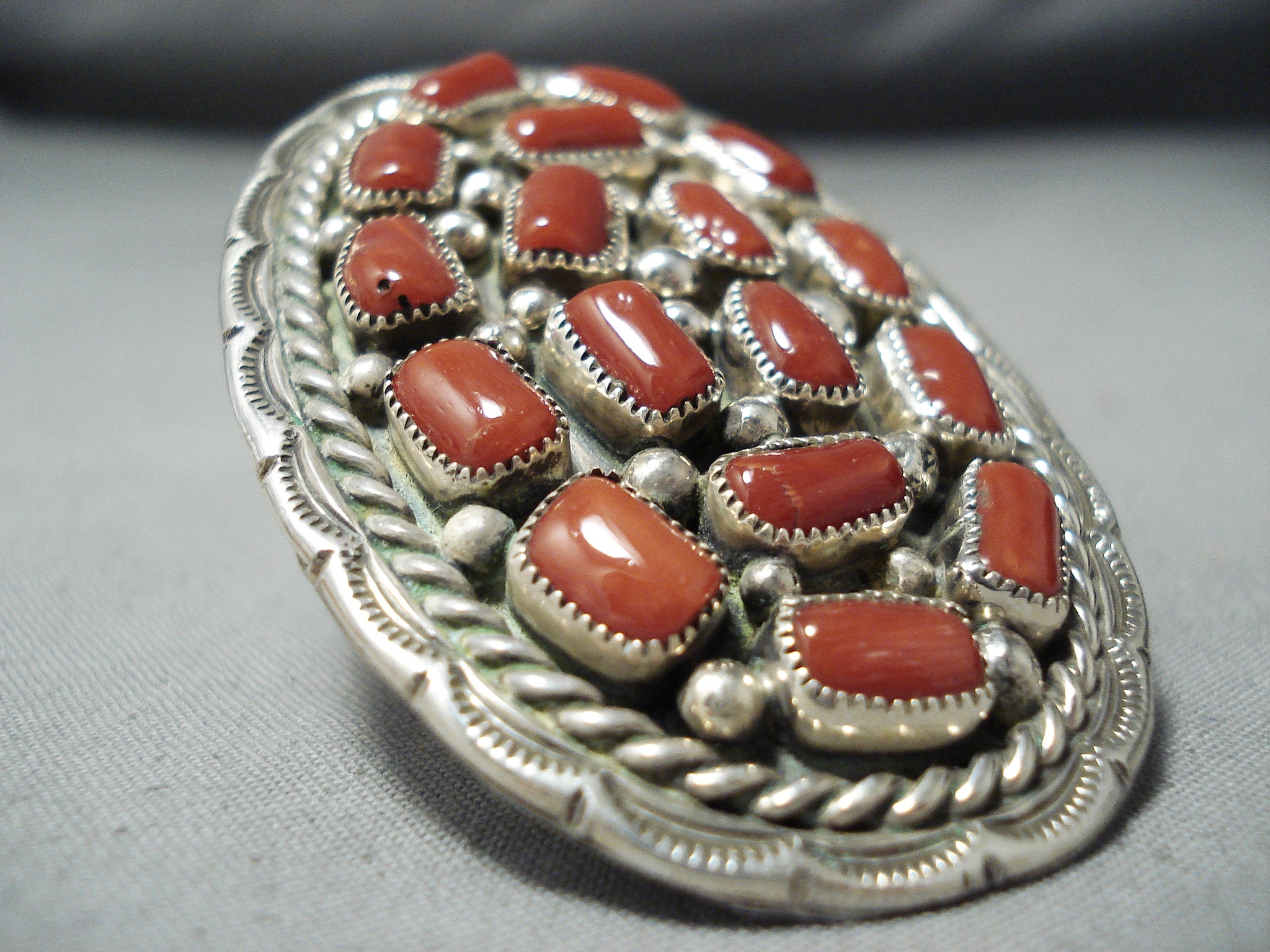 One Of The Biggest Native American Navajo Coral Chunk Sterling Silver Ring