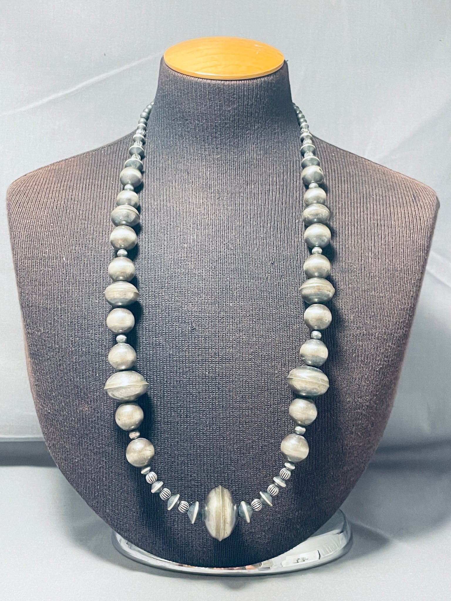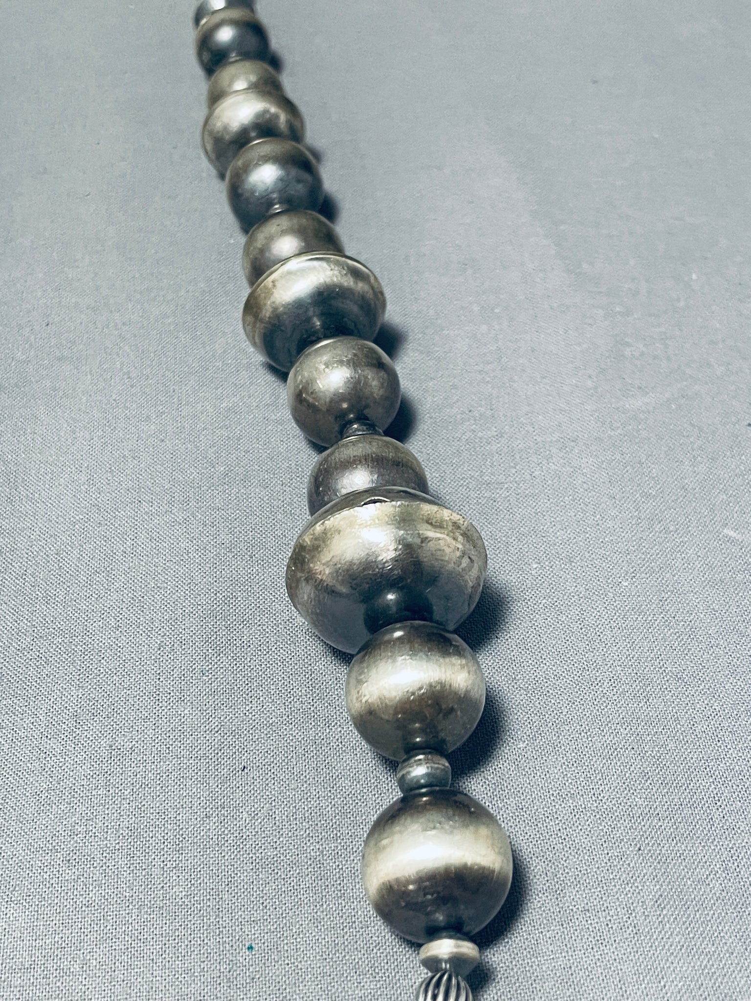 This is a magnificent vintage Navajo large all silver bead necklace. This impeccable necklace contains a multiple plethora of graduating silver beads. The beads graduate in size from about 1/4" in diameter to about 1-1/4" in diameter. Also situated throughout the round silver beads are phenomenal designed silver beads, I absolutely love the look of this beautiful necklace with an end large and sturdy traditional silver clasp. Sterling silver. Cir. 1980's+. Handmade by Navajo artist, Chim Butte. The length of the necklace measures around 28". Sturdy 145 grams.