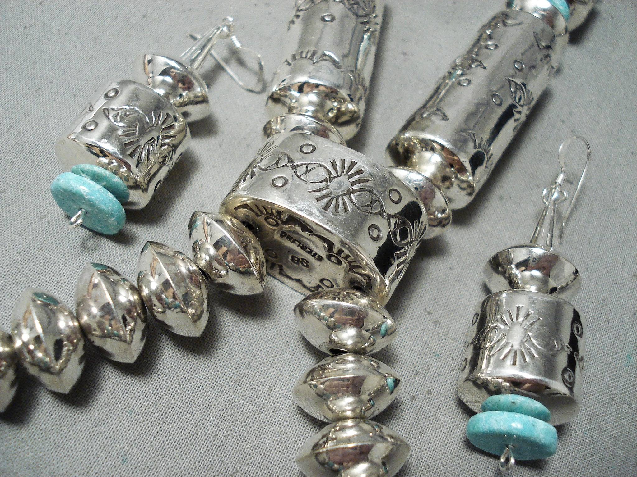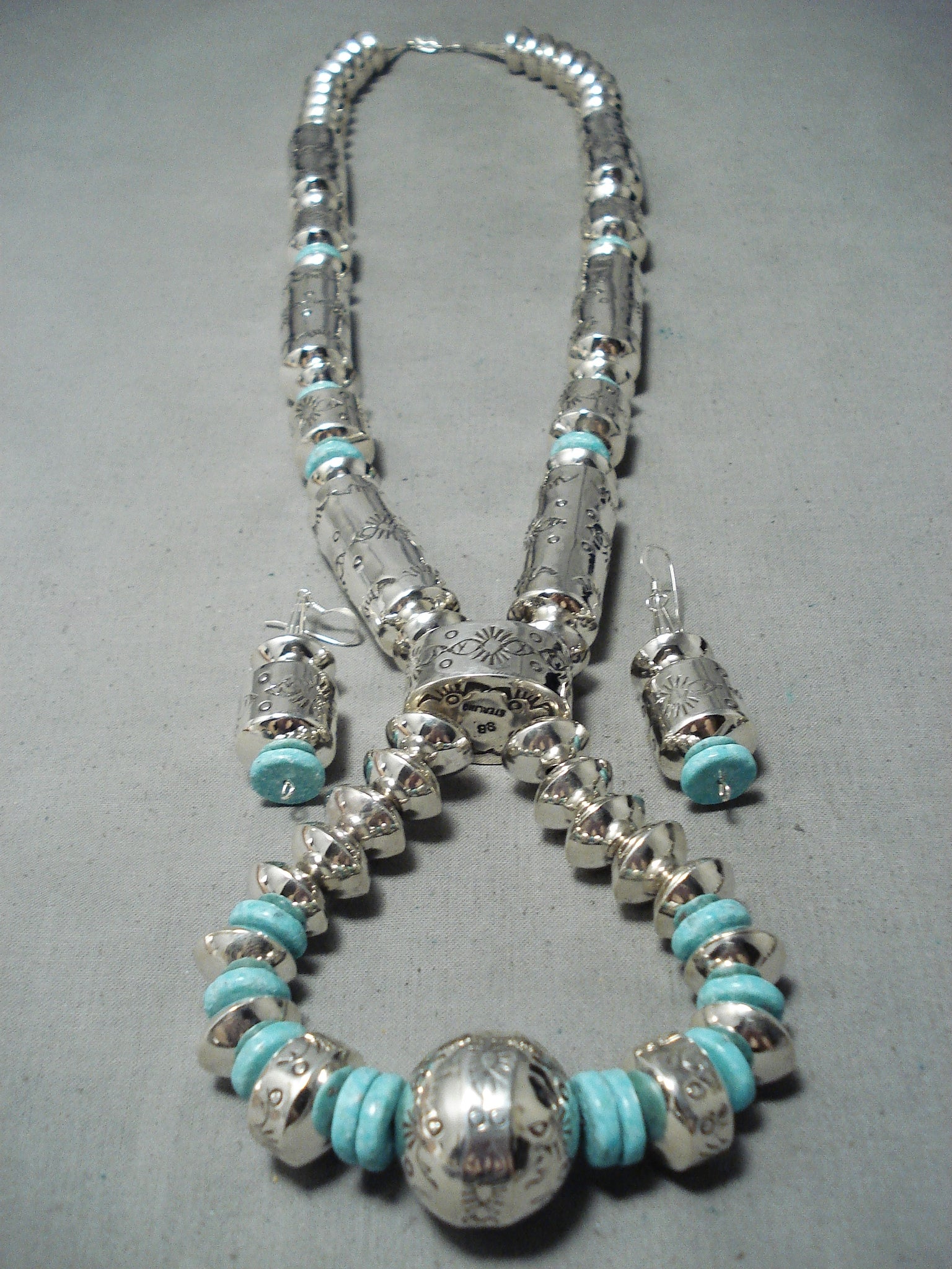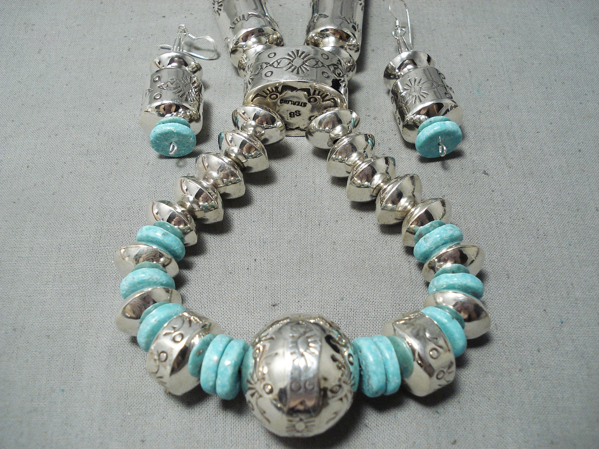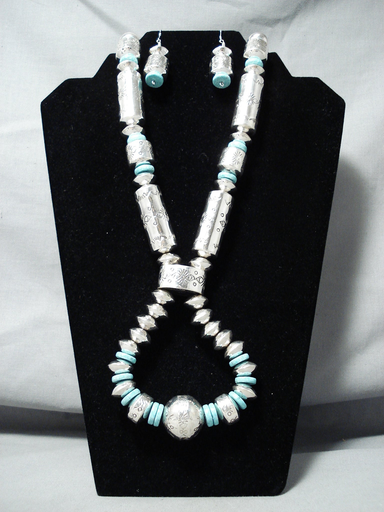 This is an exceptional vintage Navajo turquoise and silver necklace. This is one of the most intricate tubule necklaces we have collected this year. The necklace is huge and contains magnificent large tubule shaped beads with accenting round silver beads. The largest tubule beads measure around 1-3/4" X 5/8" and the largest round silver bead measures around 1" in diameter. Resting throughout the necklace are impressive disc shaped turquoise stones that each measure around 1/2" in diameter. I love that this necklace comes with a beautiful matching pair of turquoise and silver earrings that each measure around 1-3/4" X 5/8" not including the hooks. Sterling silver, marked. Cir. 1970's+. Signed by Navajo artist, Sophie Becenti . The length of the necklace measures around 34". Sturdy 165 grams.
