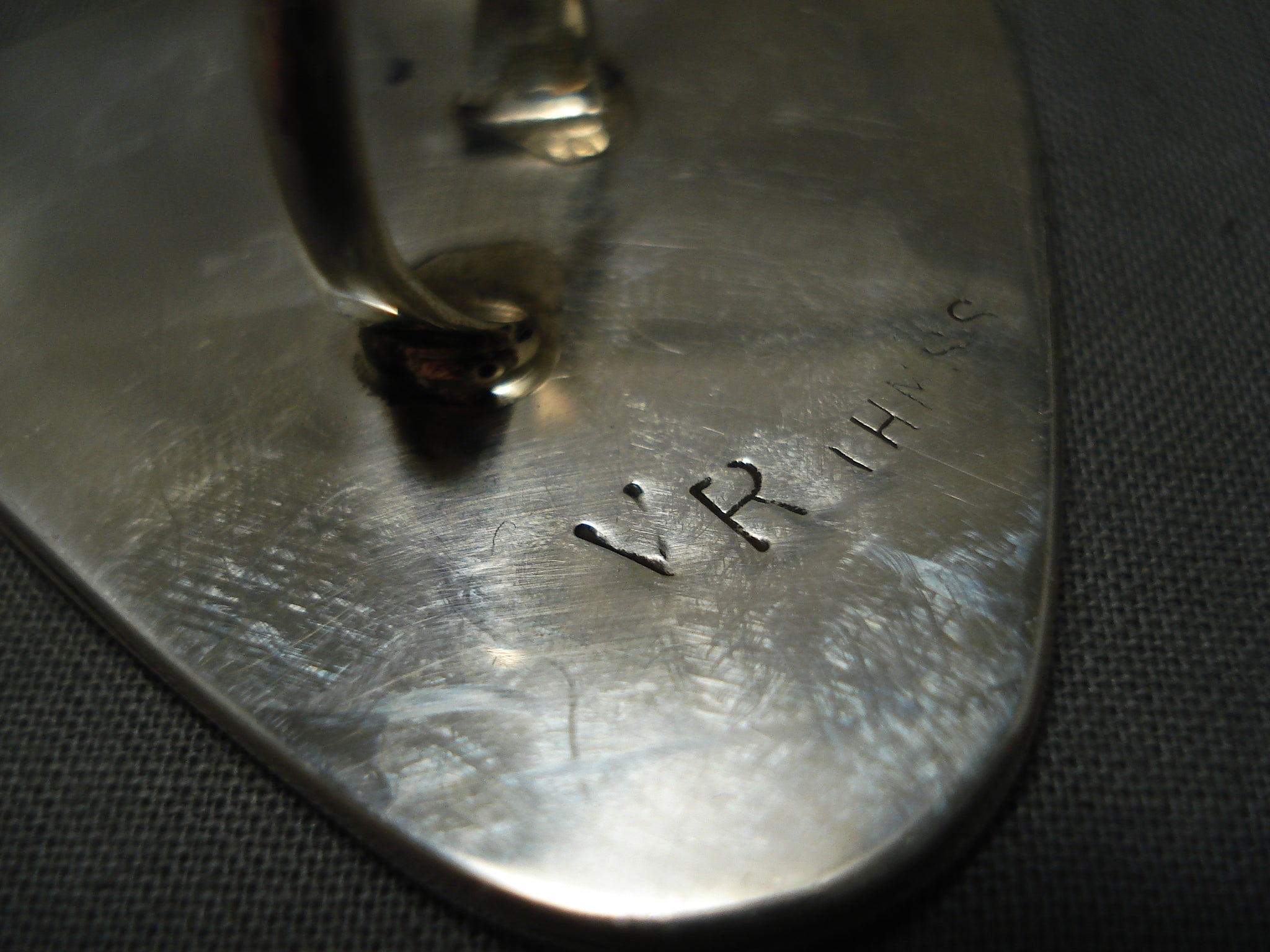 This is a tremendous Navajo single stone silver ring. This ring consists of a wonderful triangular shaped Blue Diamond turquoise stone. This is one of the biggest and best Blue Diamond turquoise rings we have collected in a while. The stone is beautifully placed in a triangular shaped shadowbox setting with three accenting silver raindrops. This ring consists of the IHSS (Indian handmade sterling silver) hallmark. The center stone measures around 1" x 7/8". The ring face measures around 1-5/8" x 1-5/8". Signed by Navajo artist, VR. The ring size is around 9. Cir. 1980's+. Sterling silver. Sturdy 15 grams.