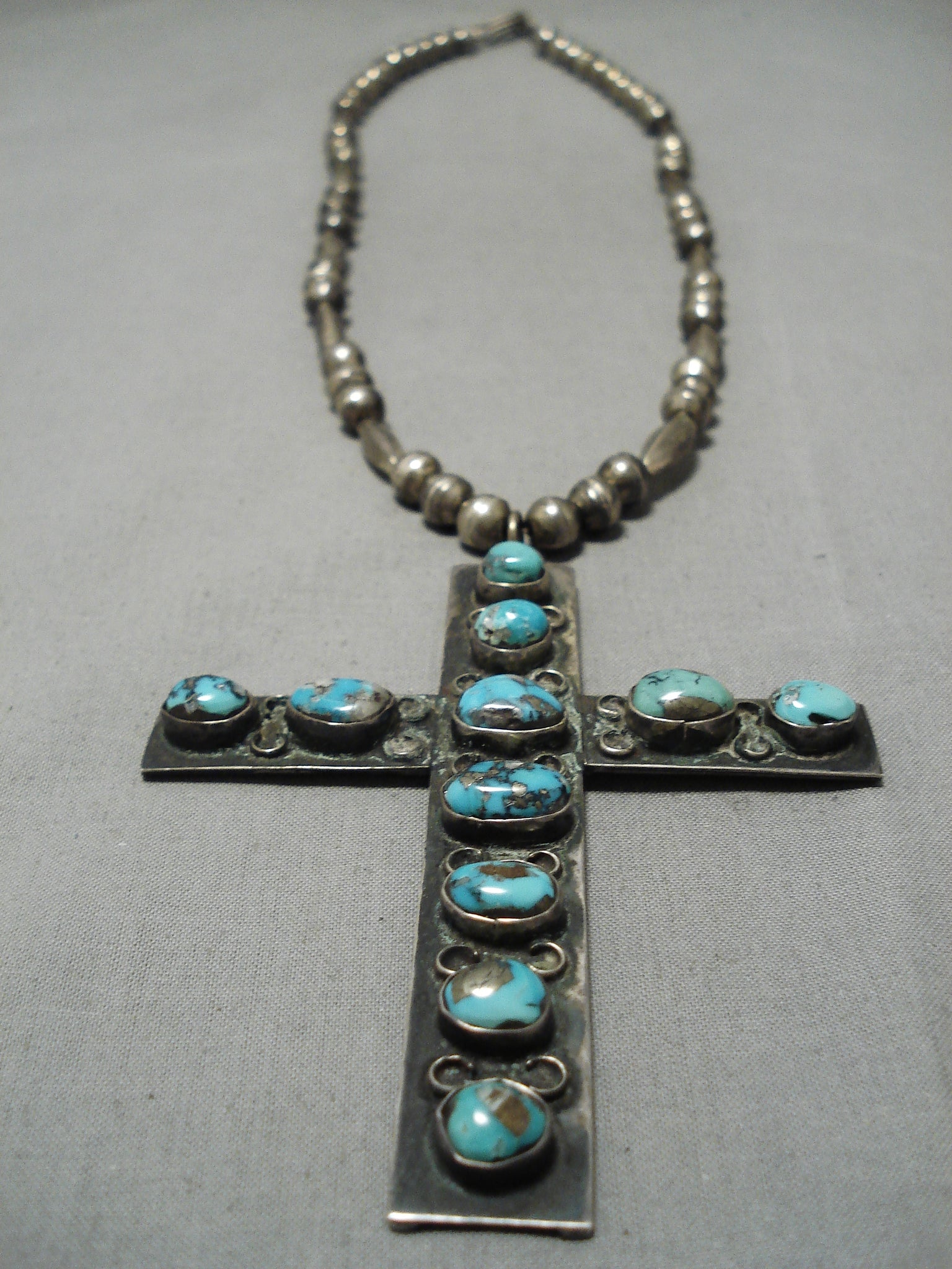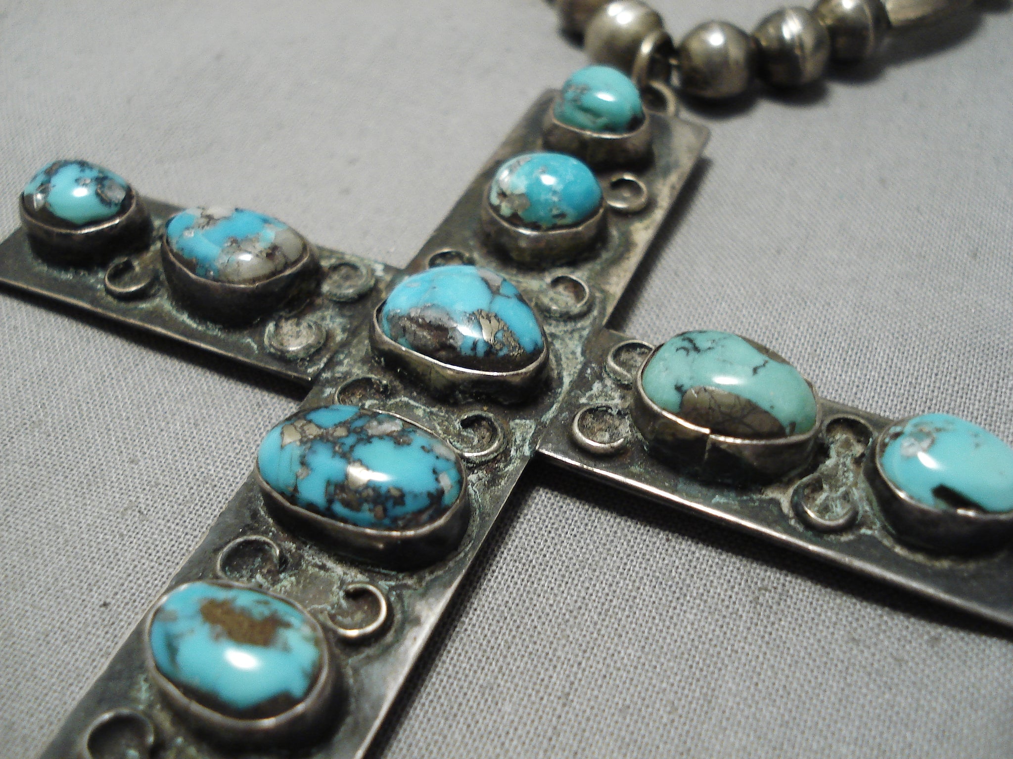 One Of The Biggest Vintage Native American Navajo Turquoise Sterling Silver Cross Necklace