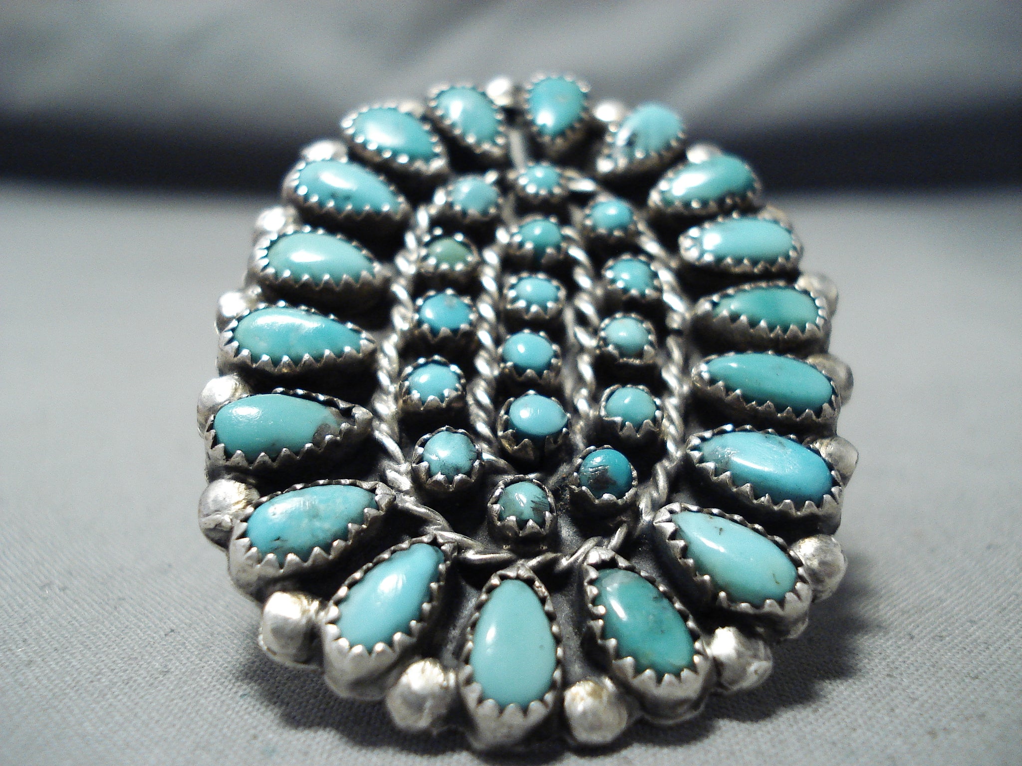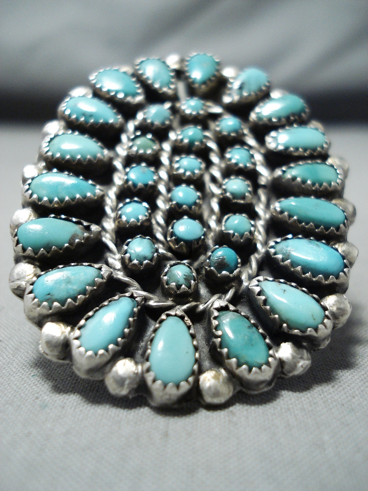 Here we have an astonishing vintage Navajo silver ring having a huge cluster of turquoise teardrops and rounds with handcarved silver rope, a silver bead border and a handcarved graduated double silver rail band! Absolutely Amazing! The largest stone measures around 1/4" x 1/8". The ring face measures around 2" x 1-5/8". The ring size is around 10. Sterling silver. Sturdy 26 grams. Cir Mid Century.